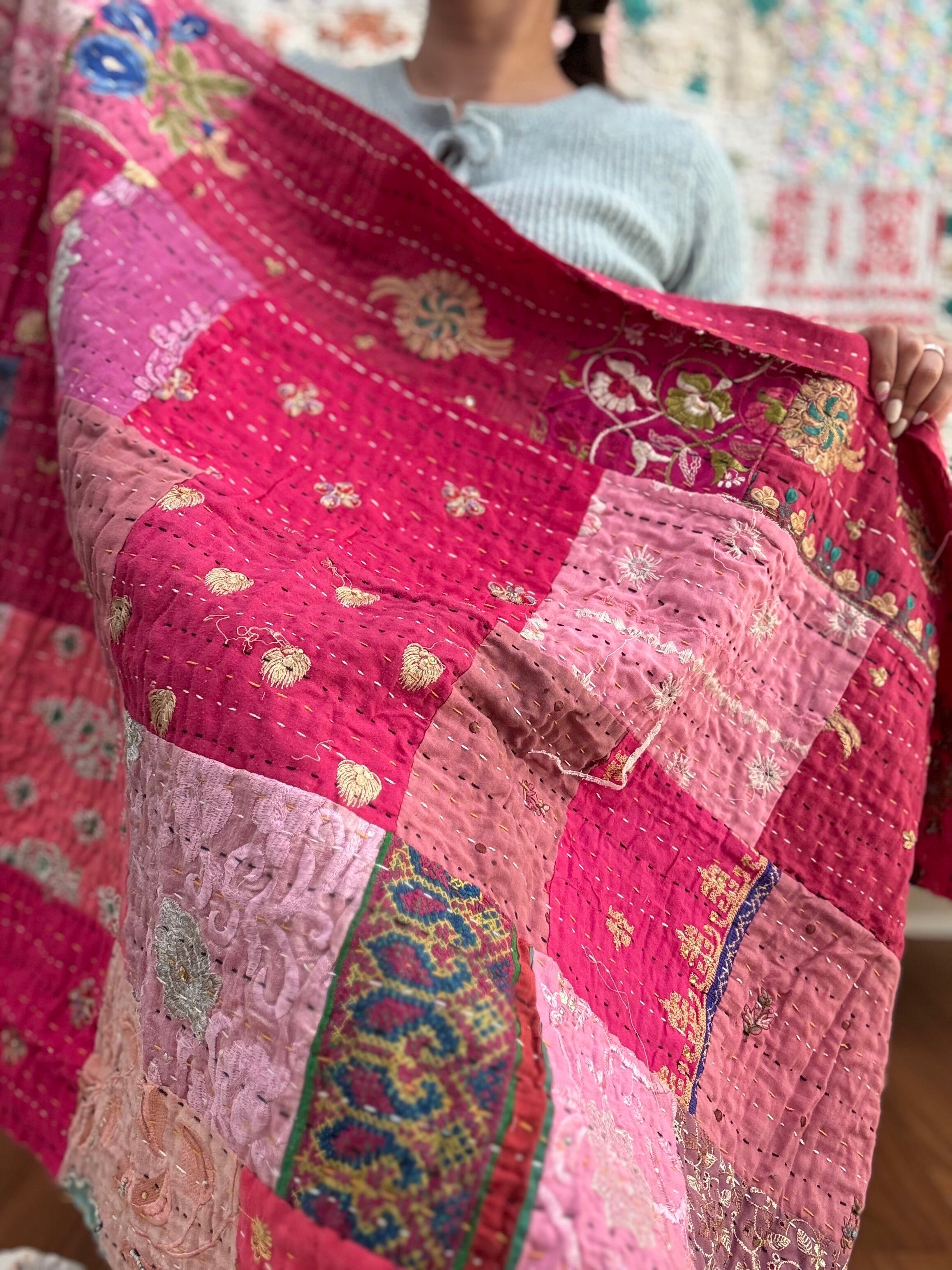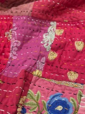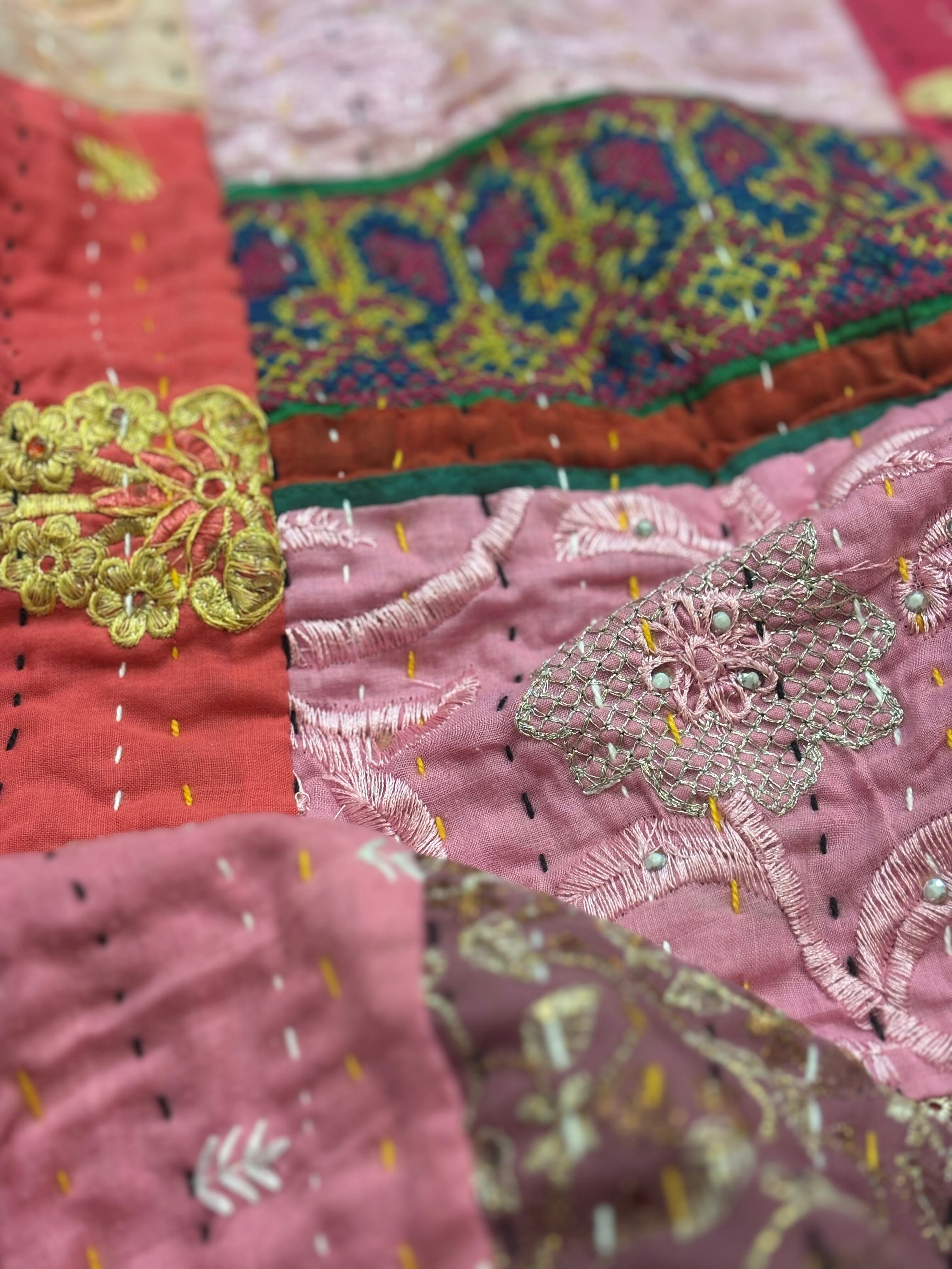 繋ぎ合わせたパッチワークキルトはとても華やか。