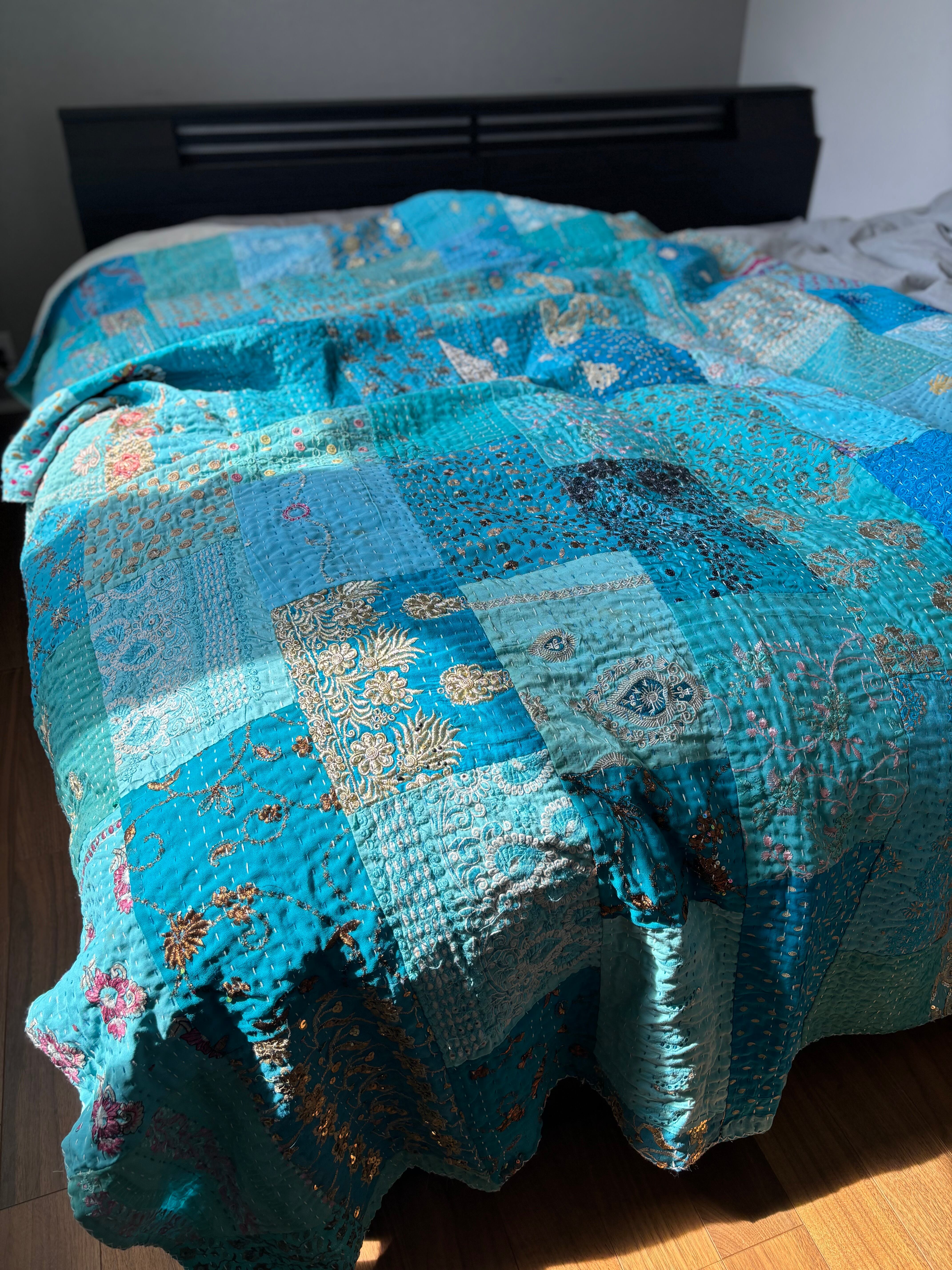 繋ぎ合わせたパッチワークキルトはとても華やか。