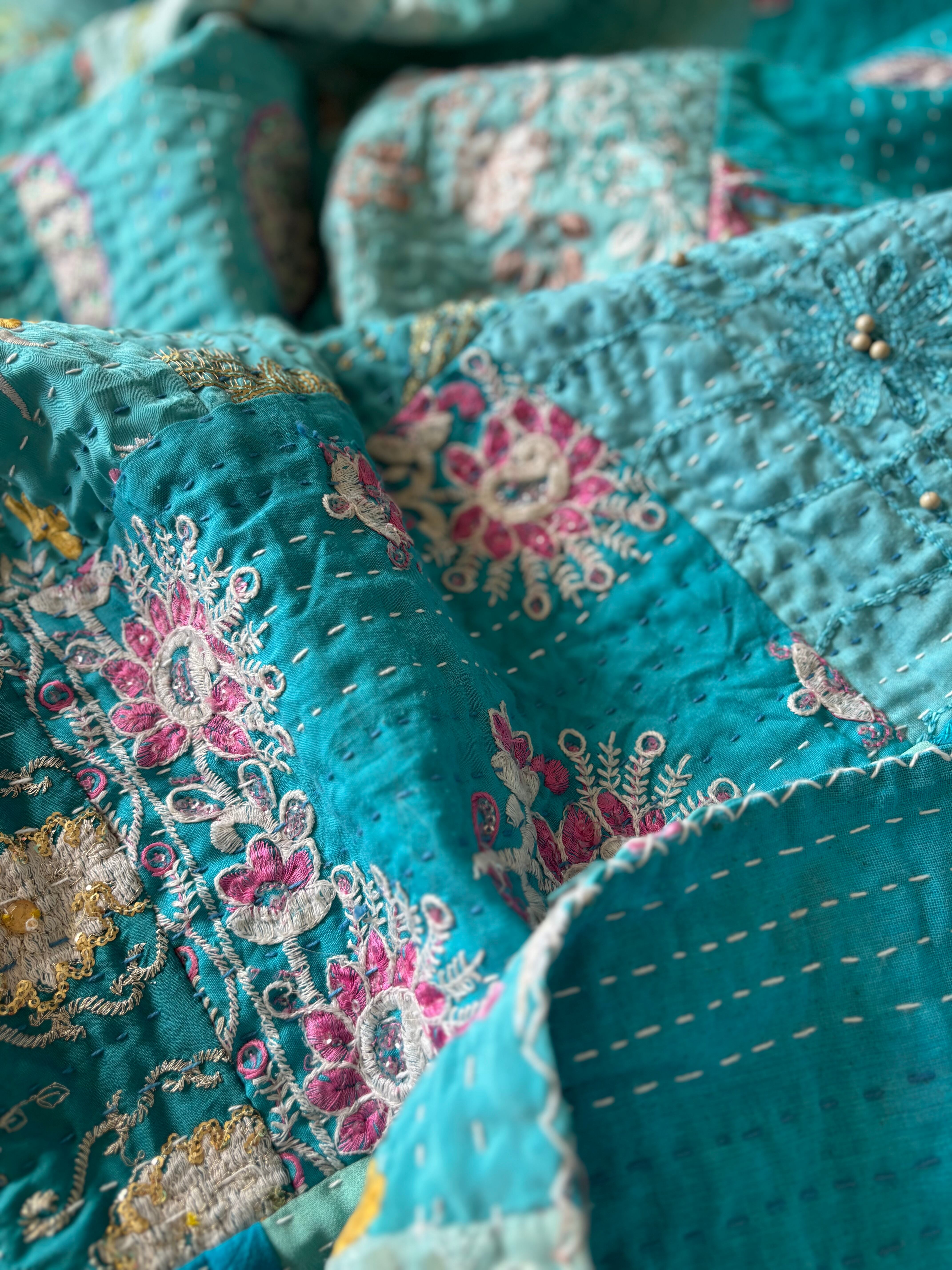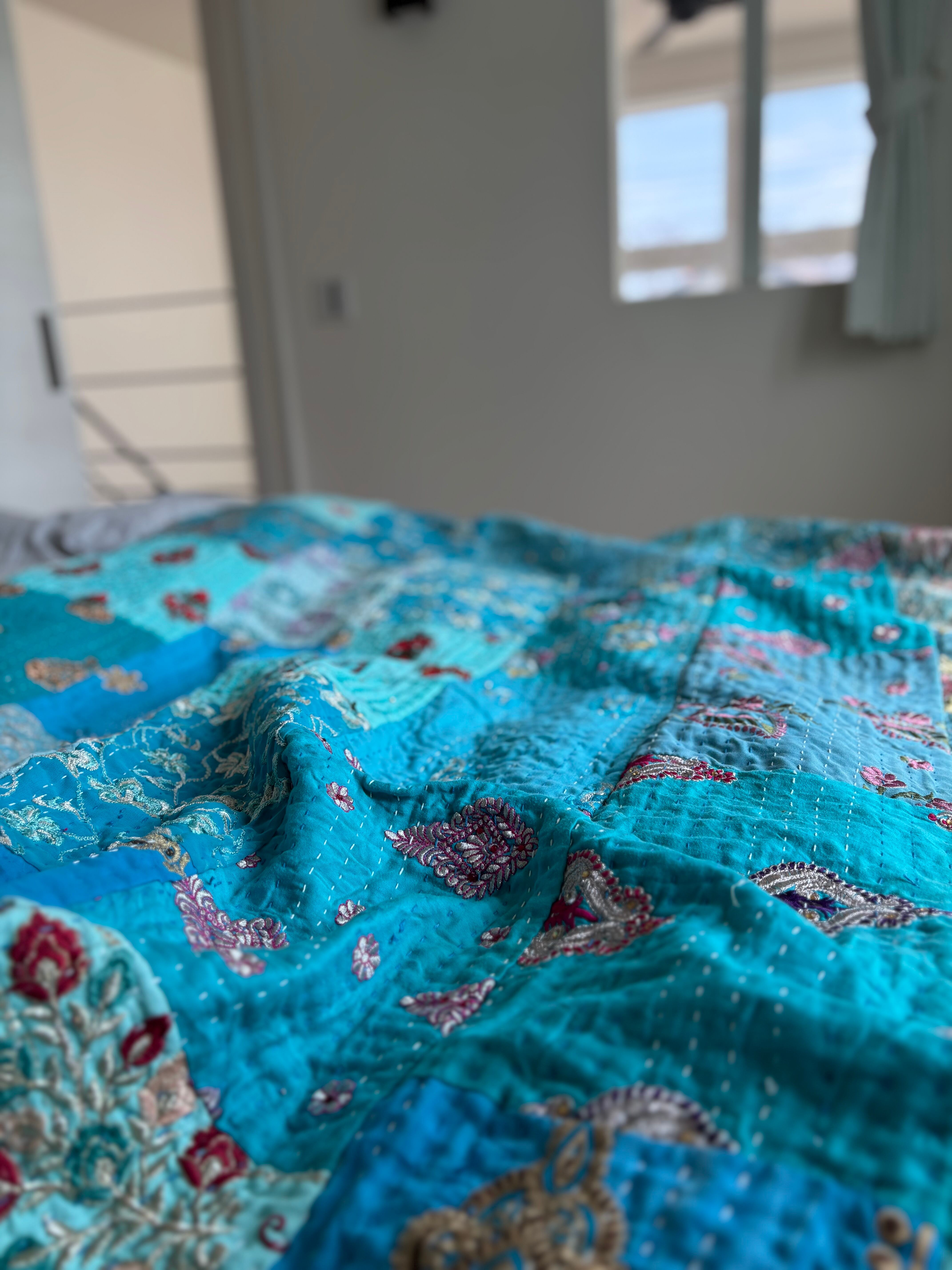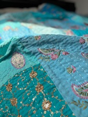 繋ぎ合わせたパッチワークキルトはとても華やか。