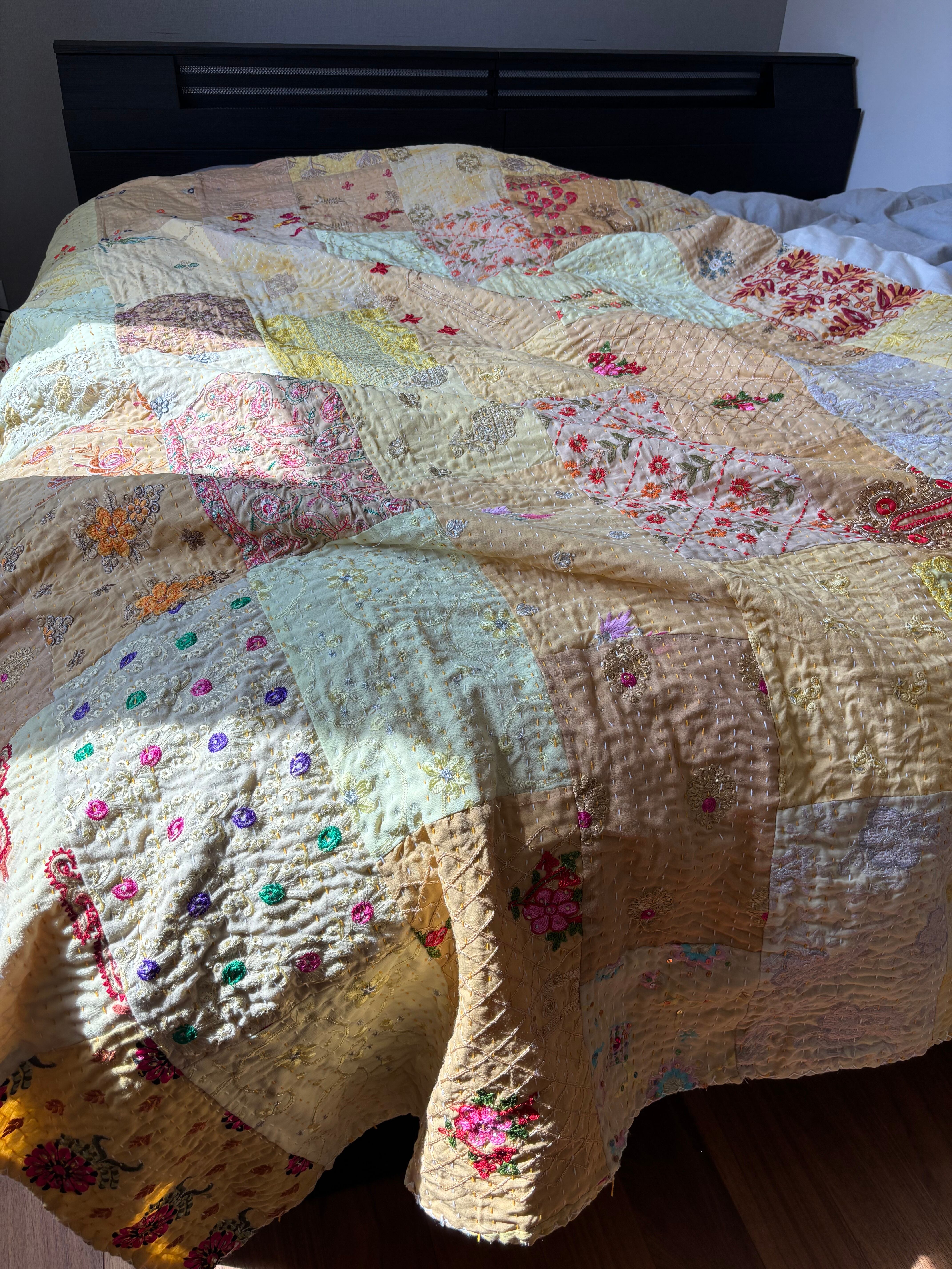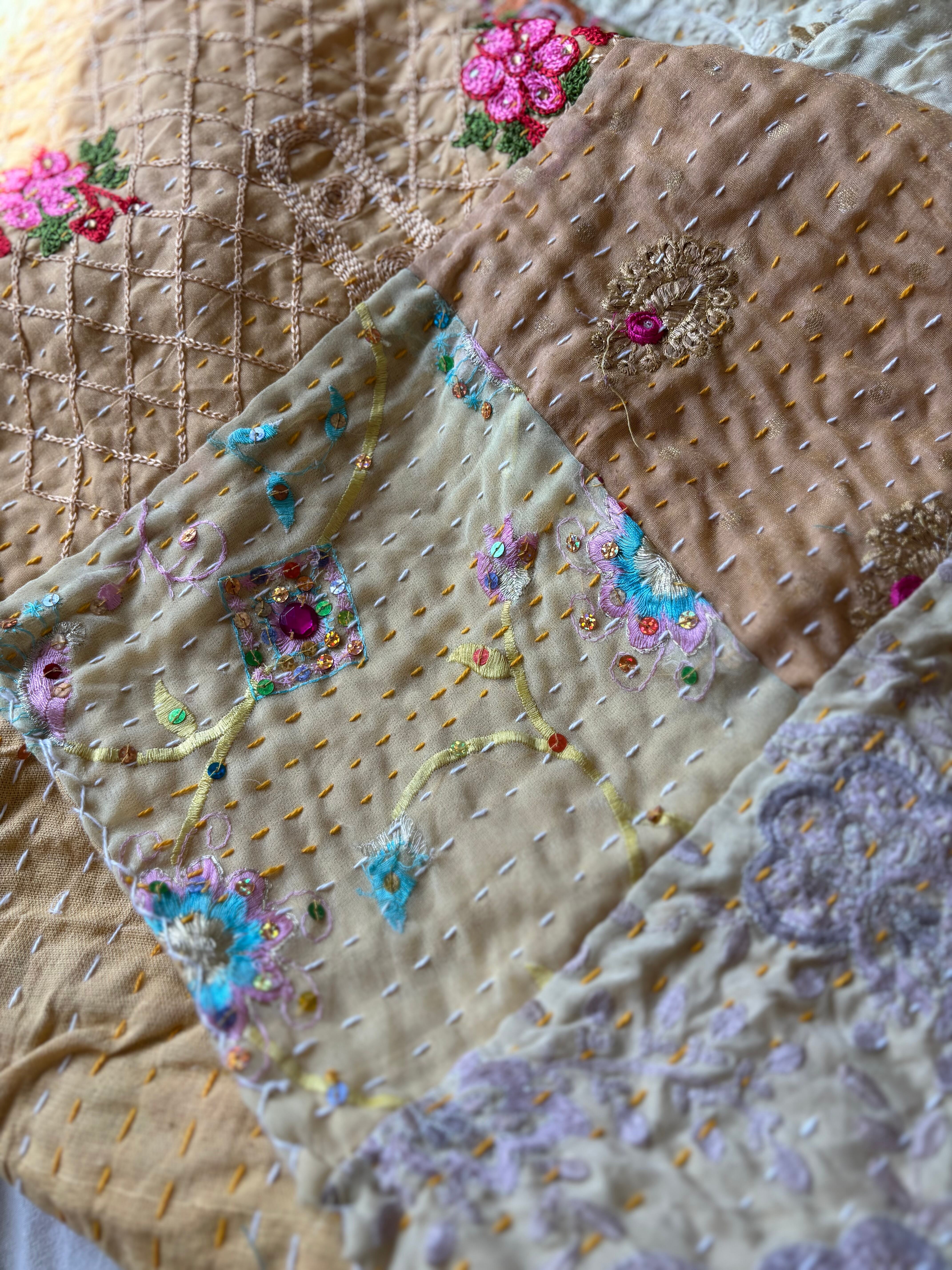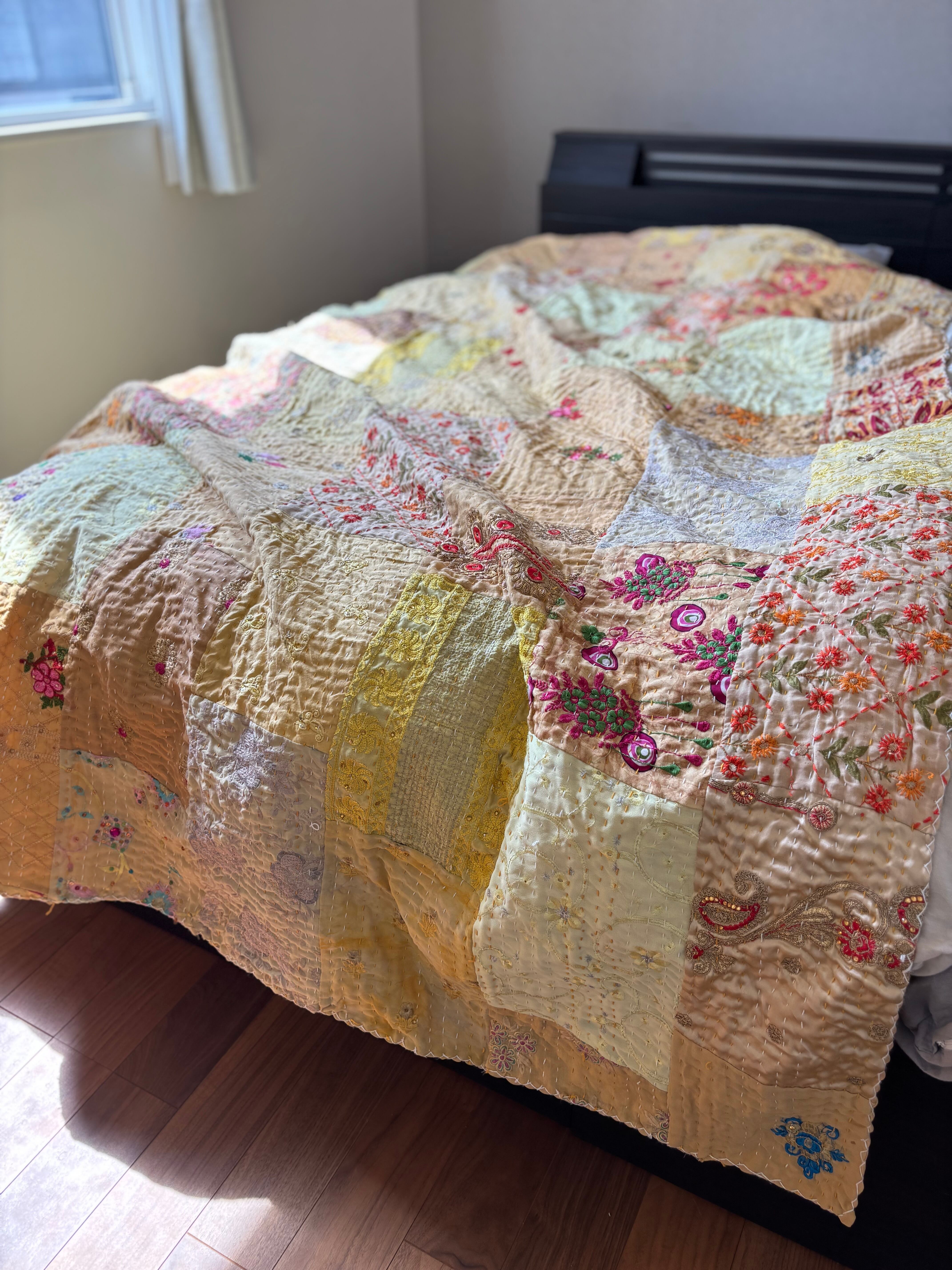 繋ぎ合わせたパッチワークキルトはとても華やか。