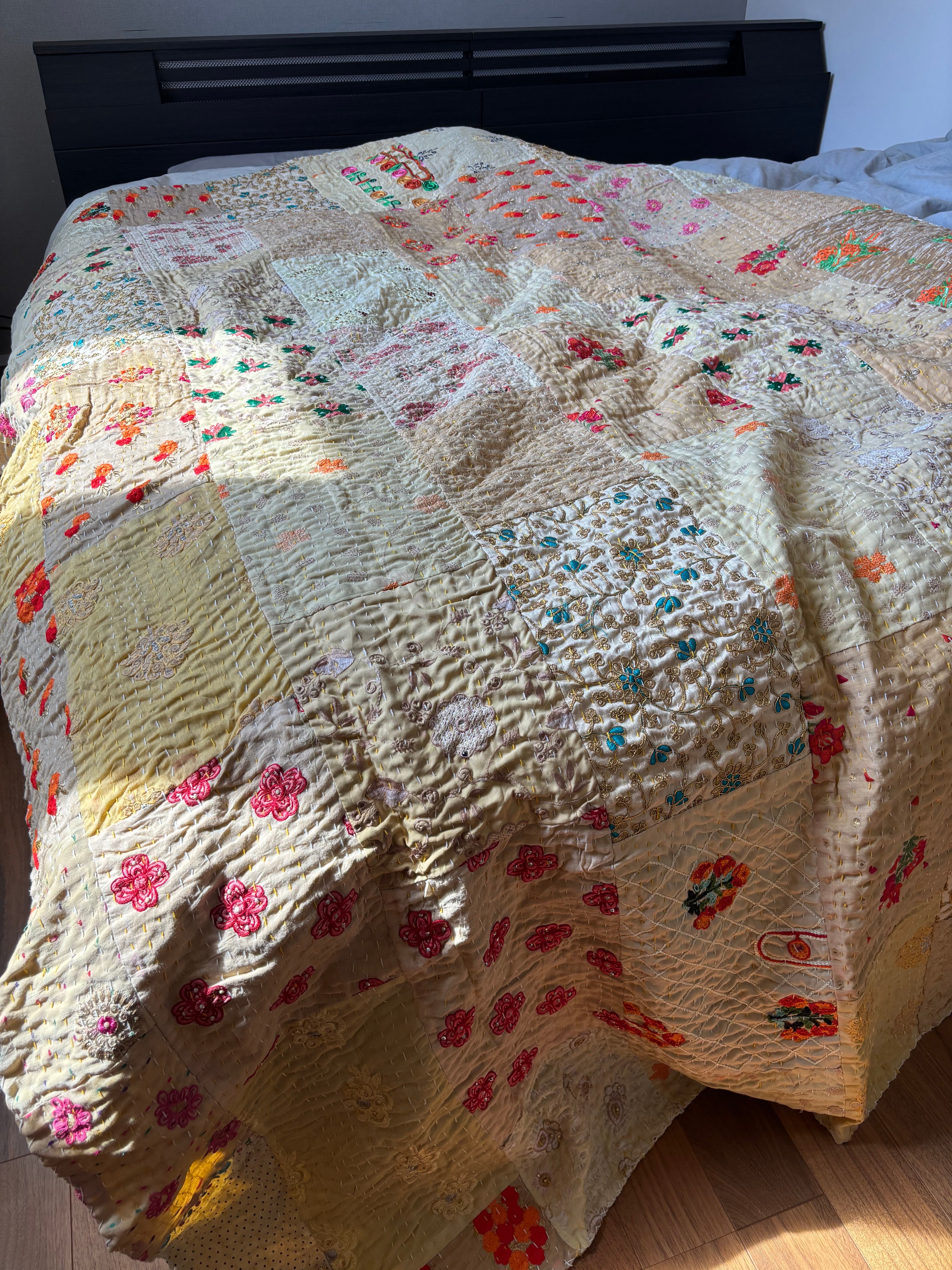 繋ぎ合わせたパッチワークキルトはとても華やか。