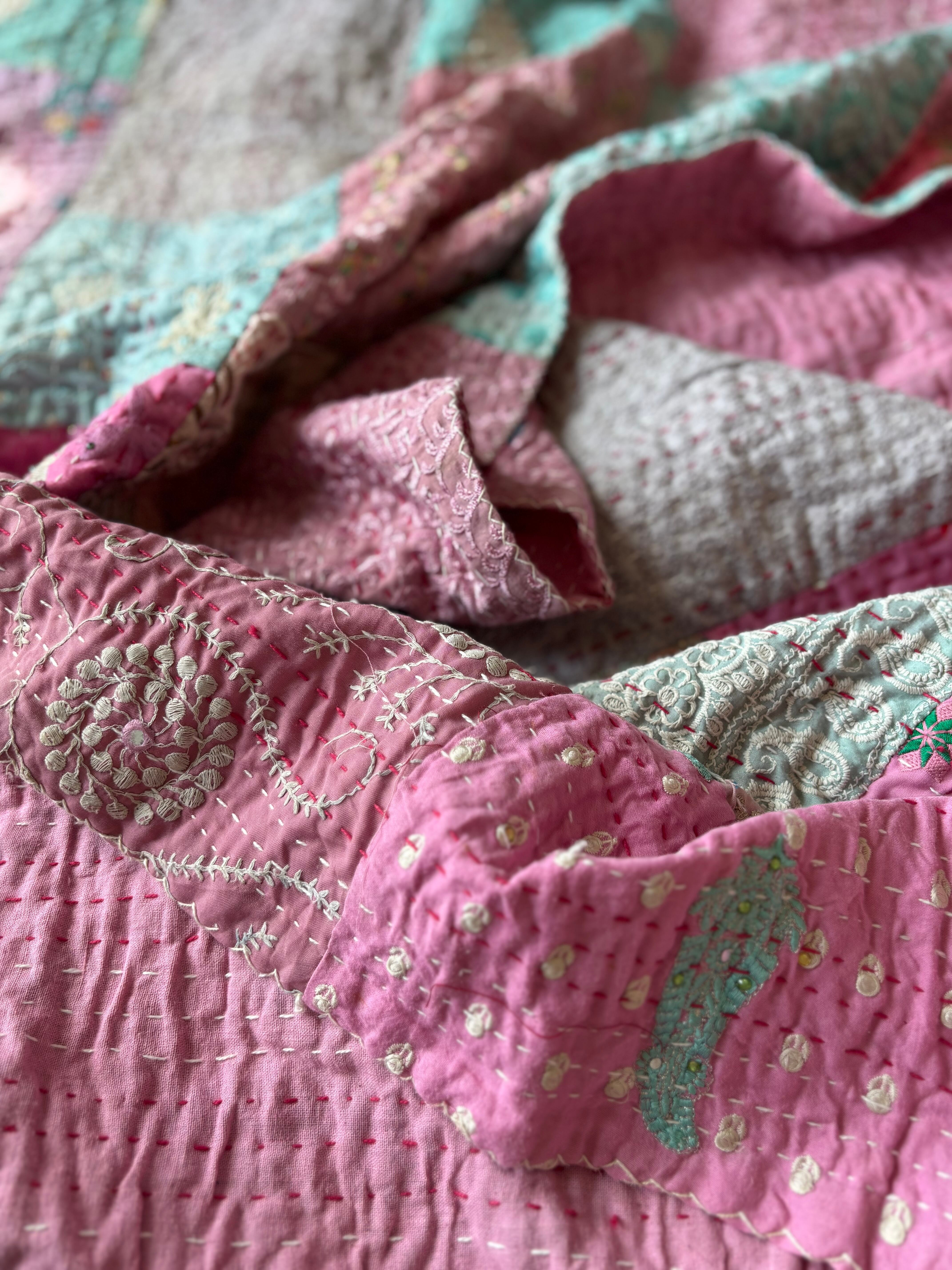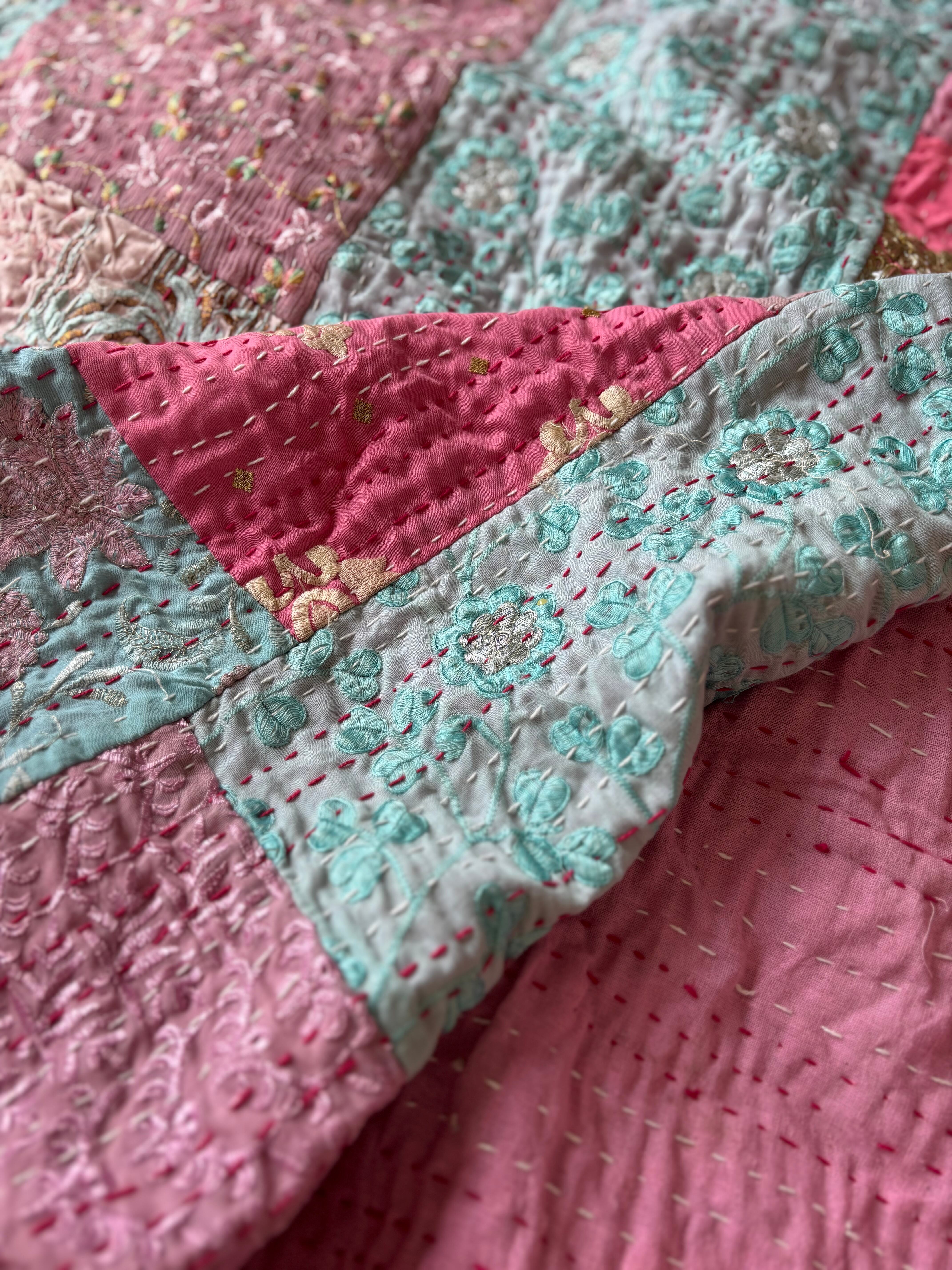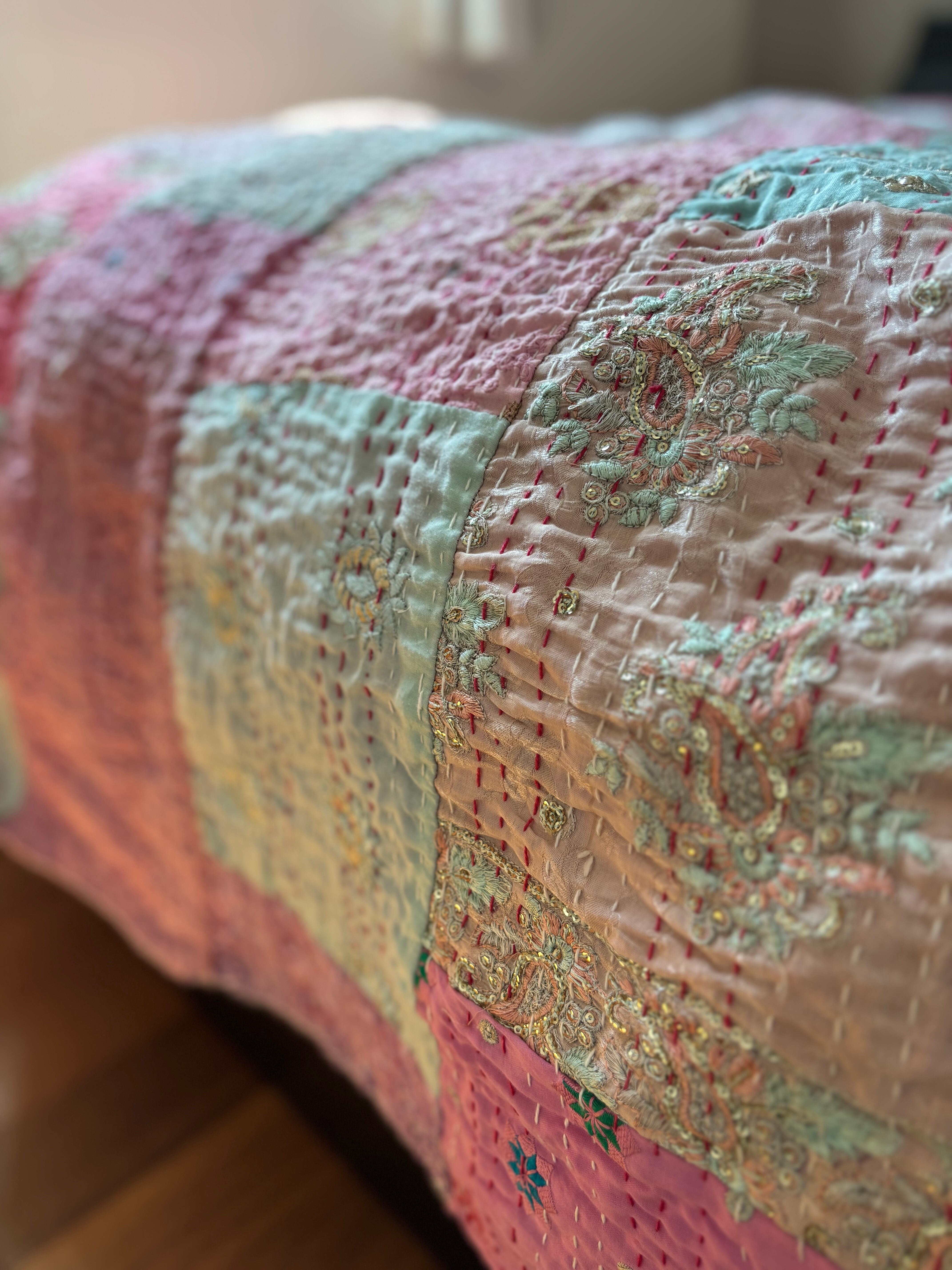 繋ぎ合わせたパッチワークキルトはとても華やか。