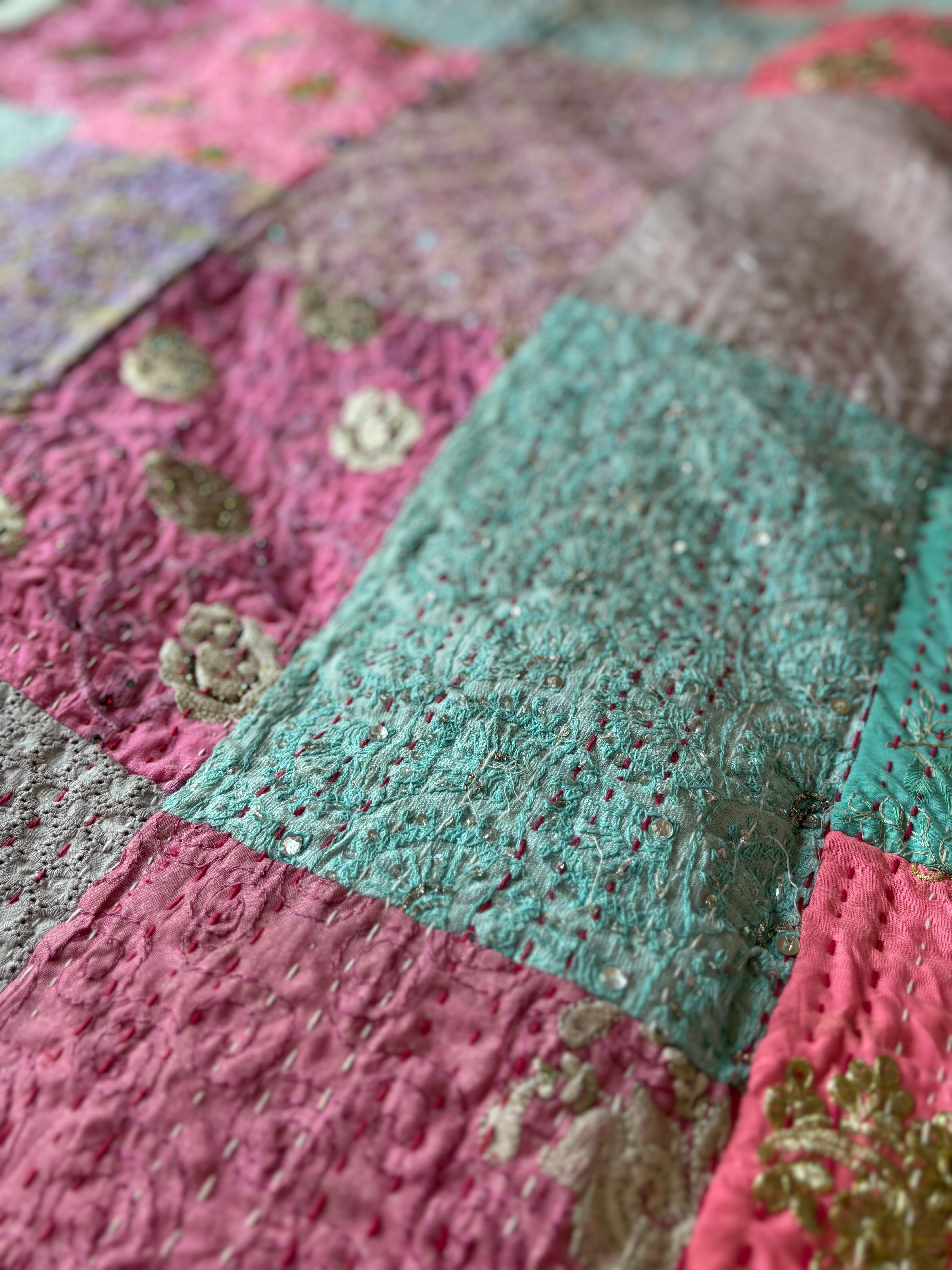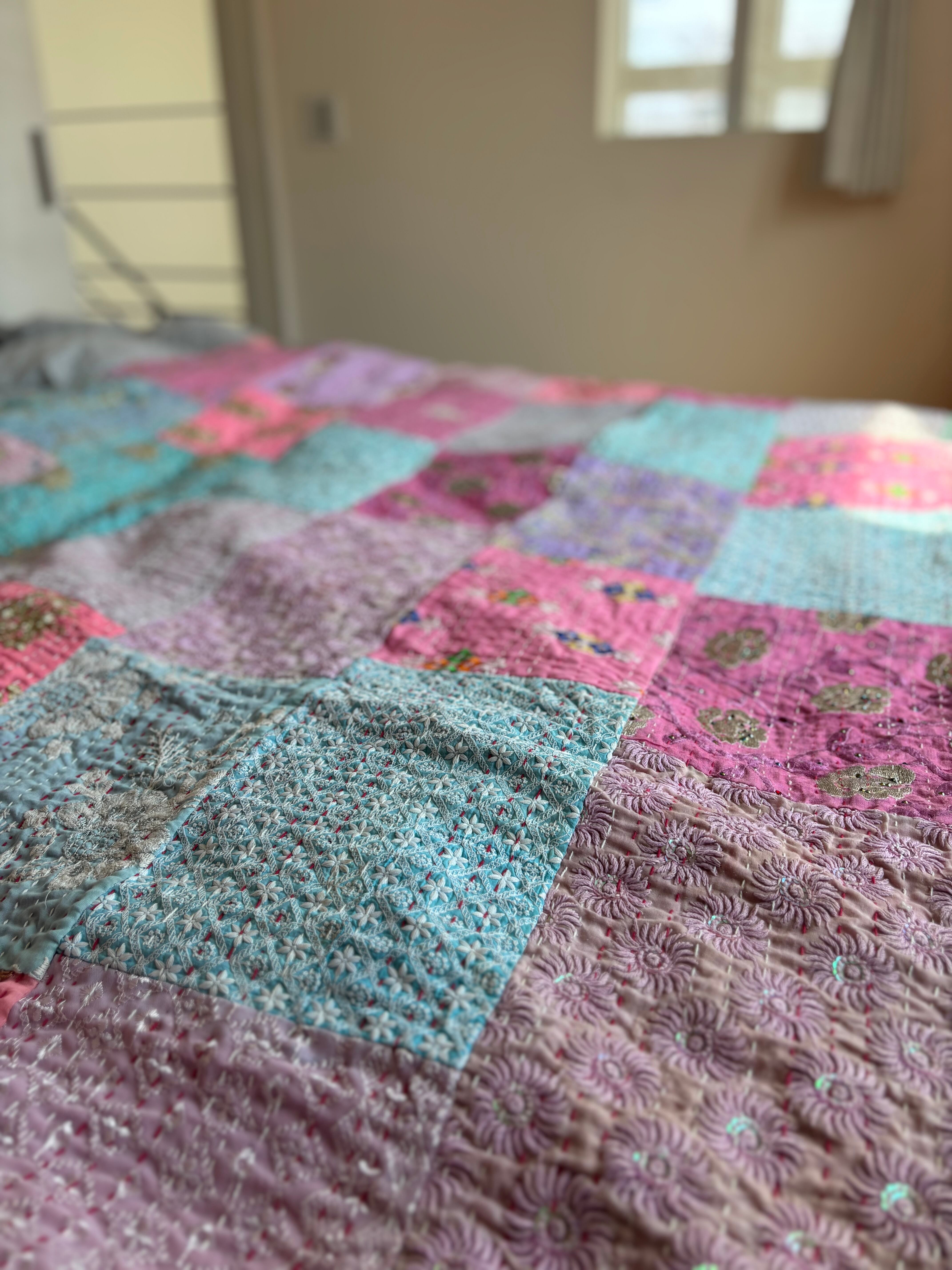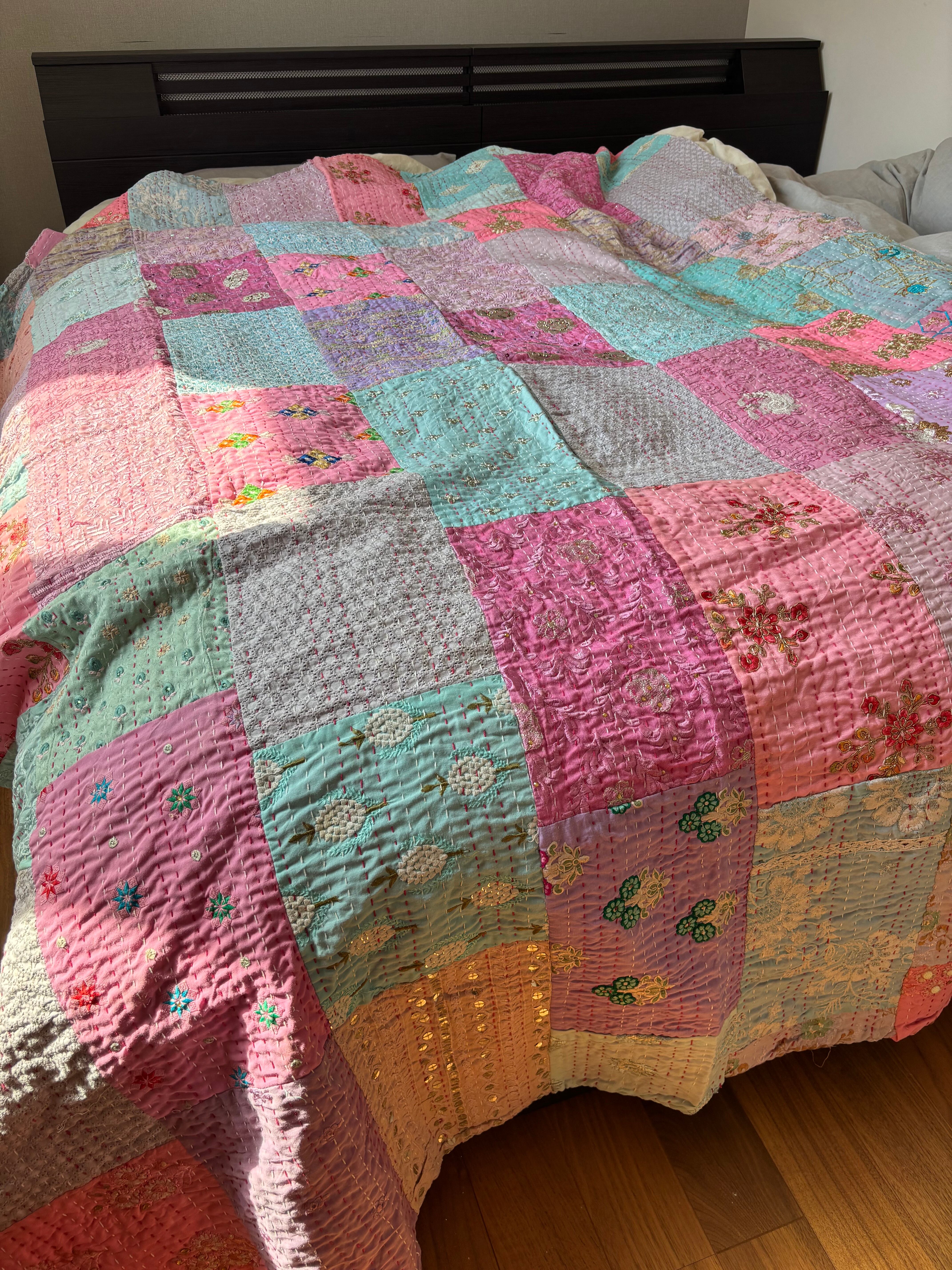 繋ぎ合わせたパッチワークキルトはとても華やか。