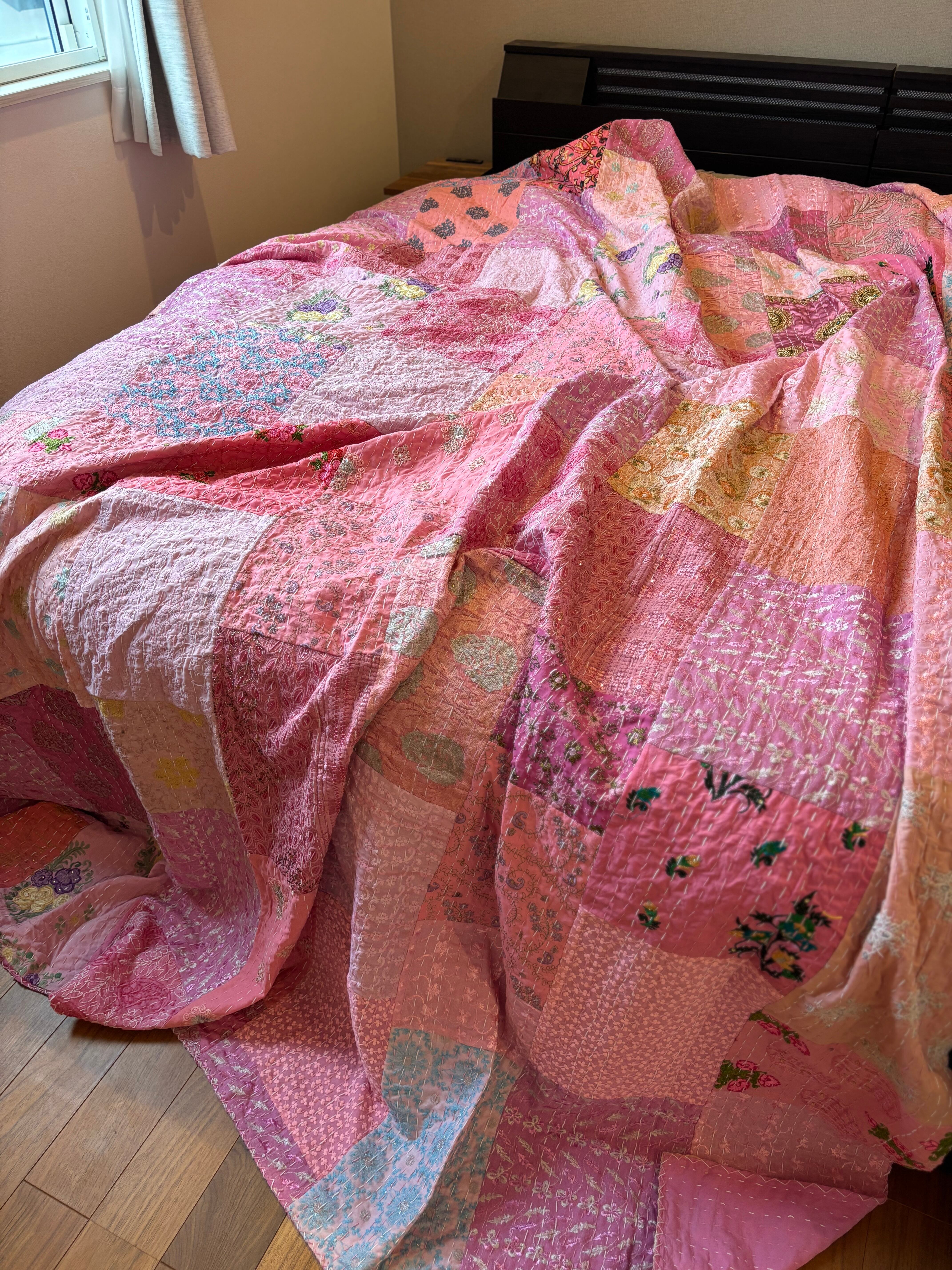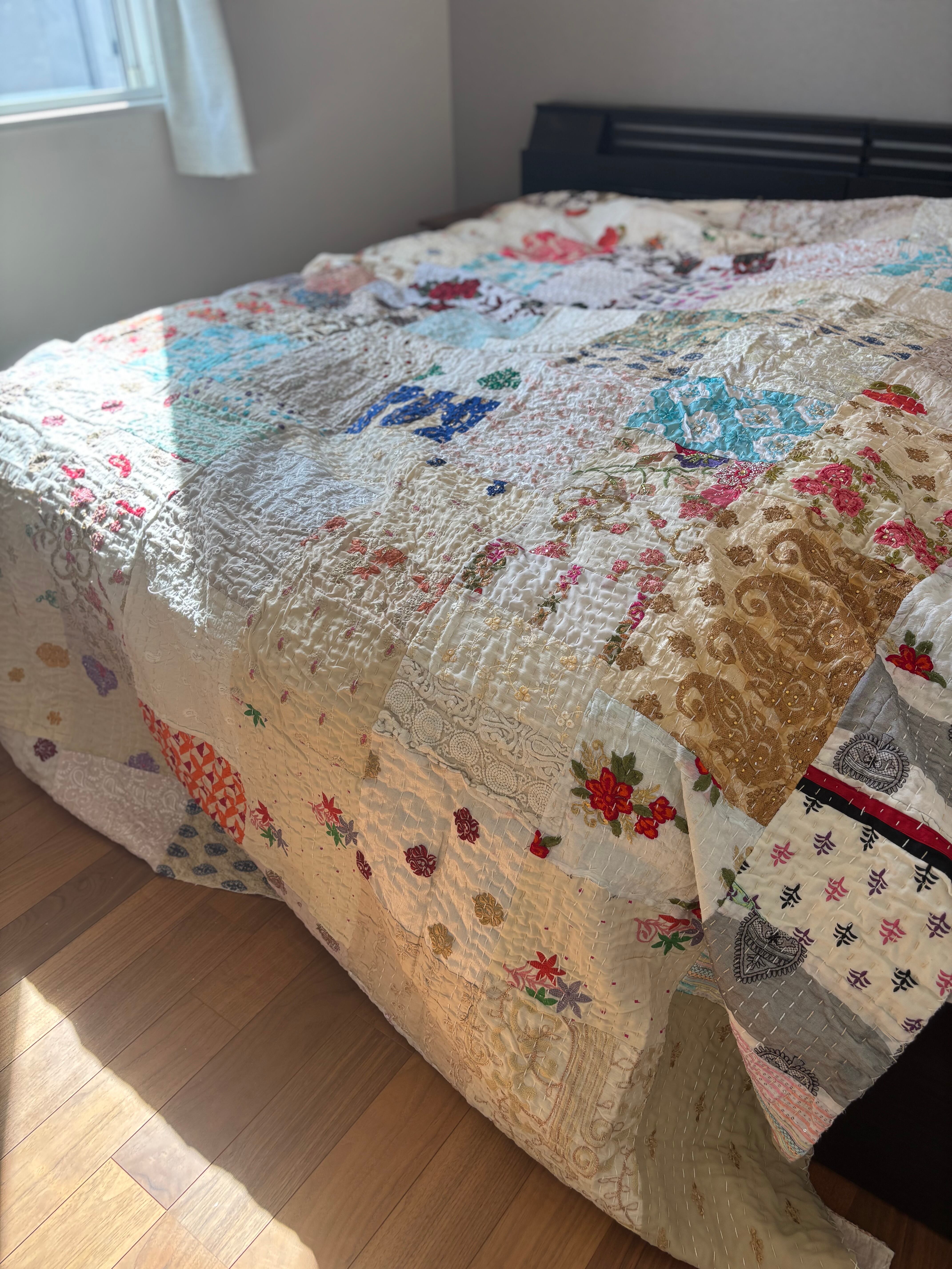 繋ぎ合わせたパッチワークキルトはとても華やか。