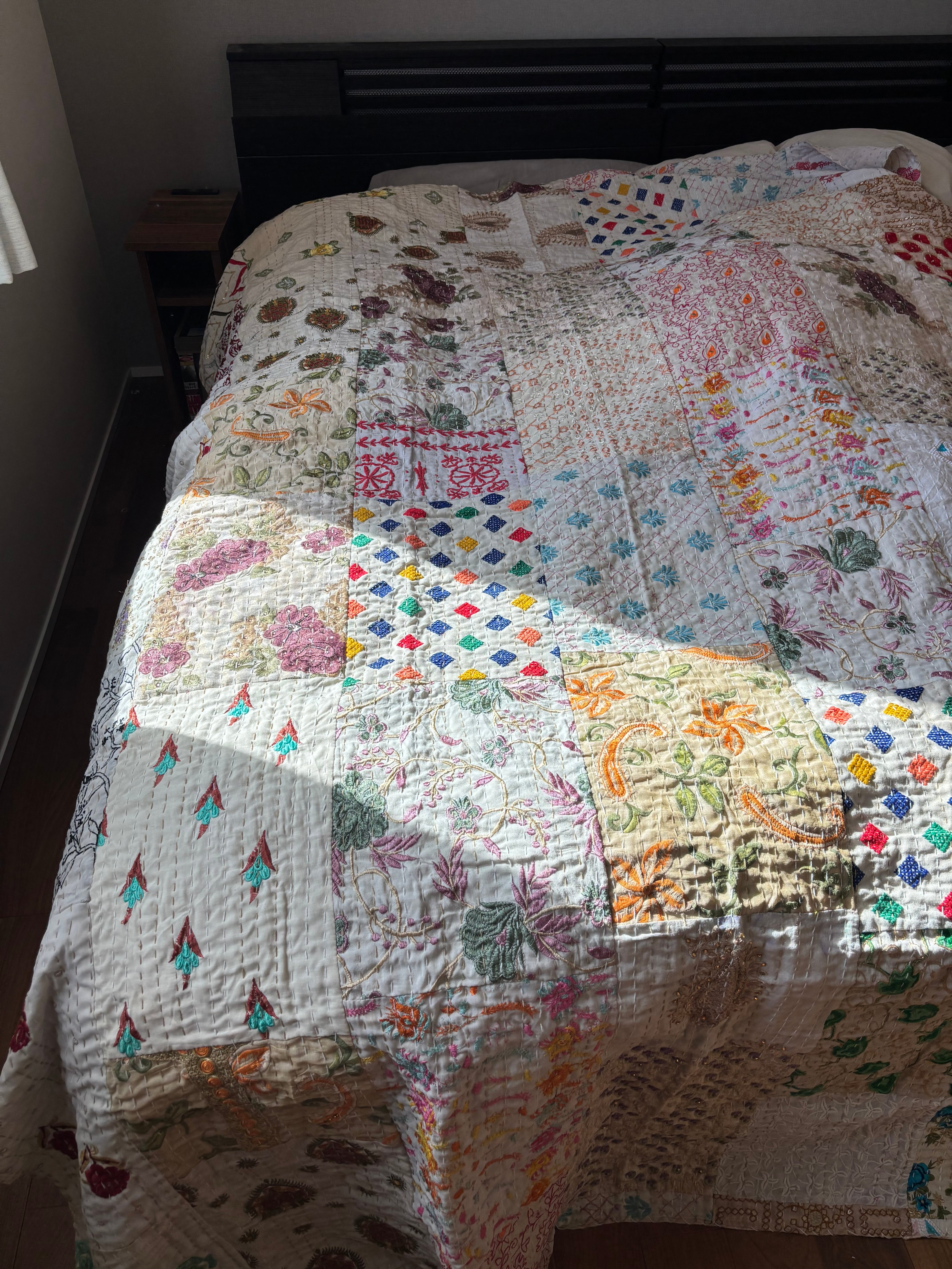 繋ぎ合わせたパッチワークキルトはとても華やか。