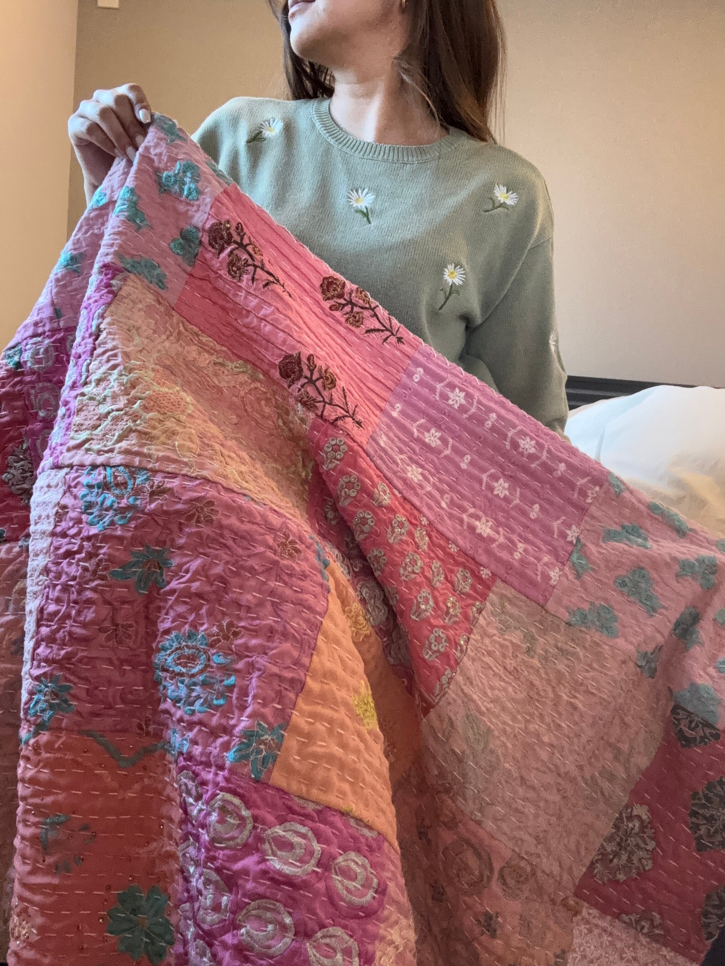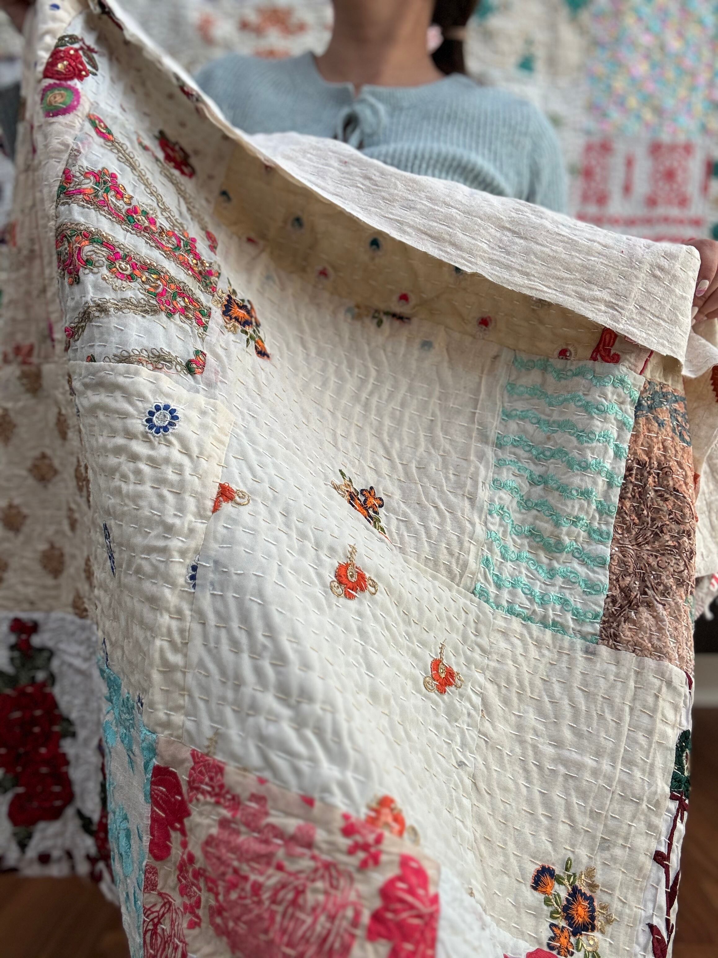 繋ぎ合わせたパッチワークキルトはとても華やか。