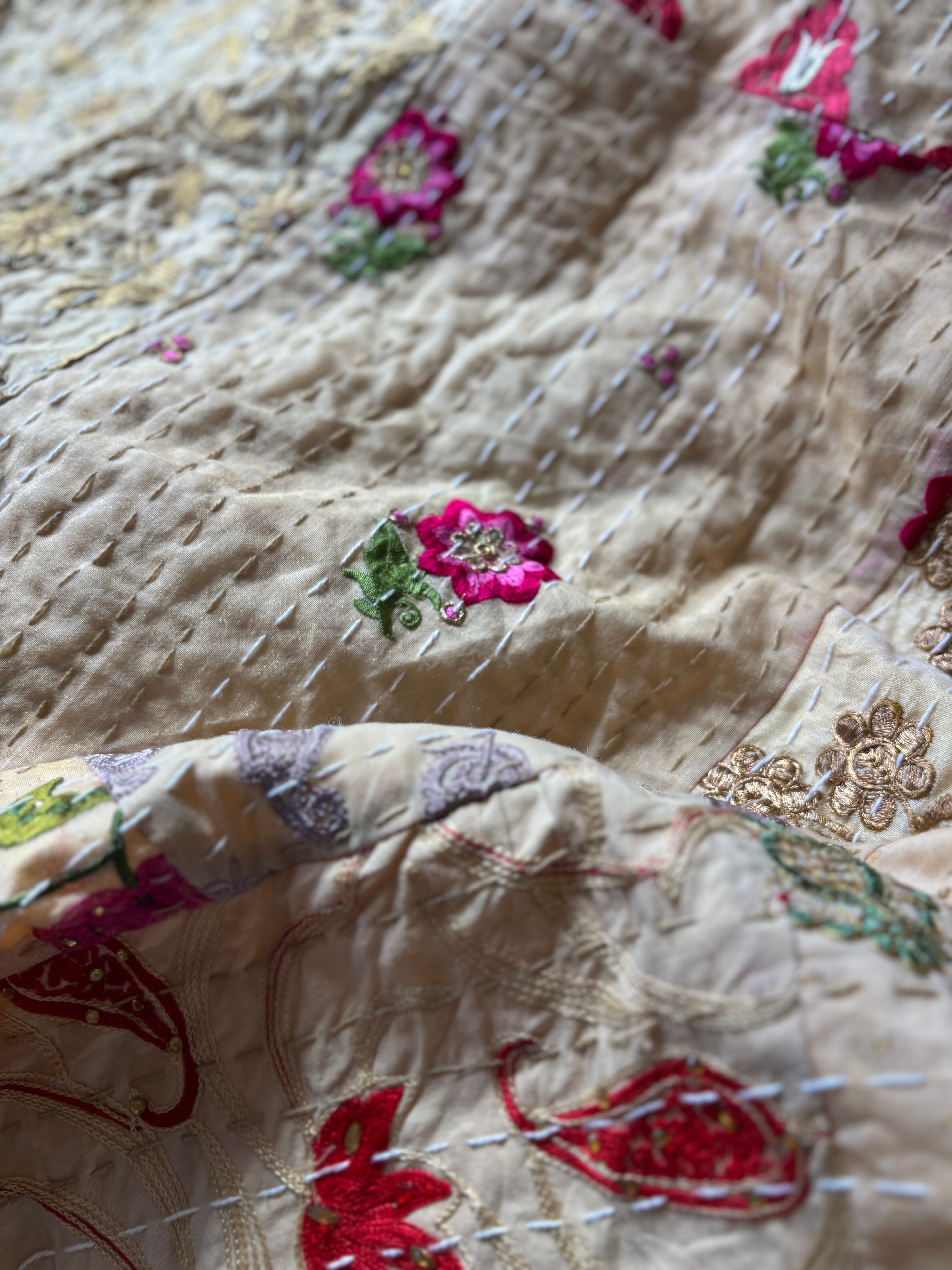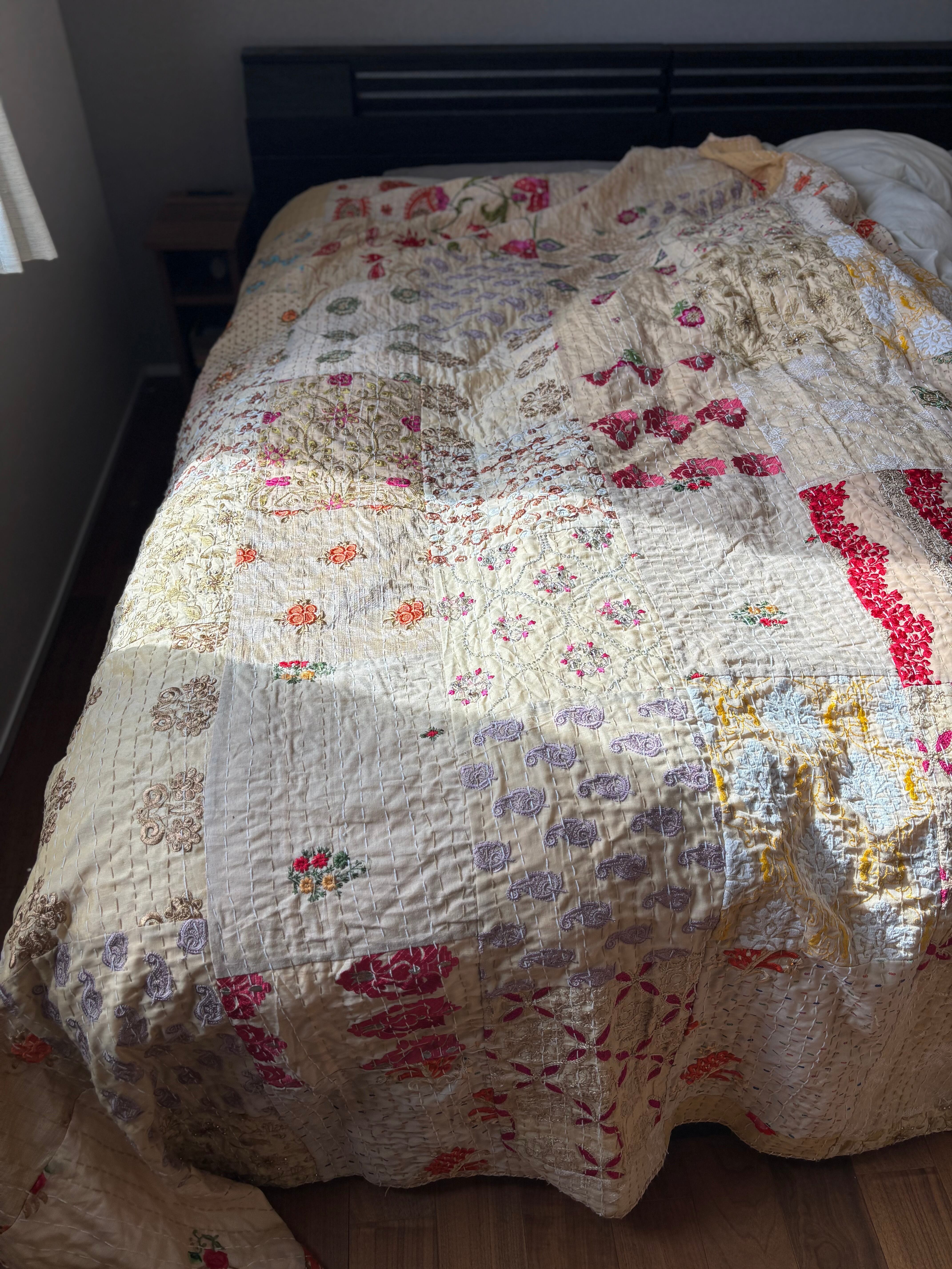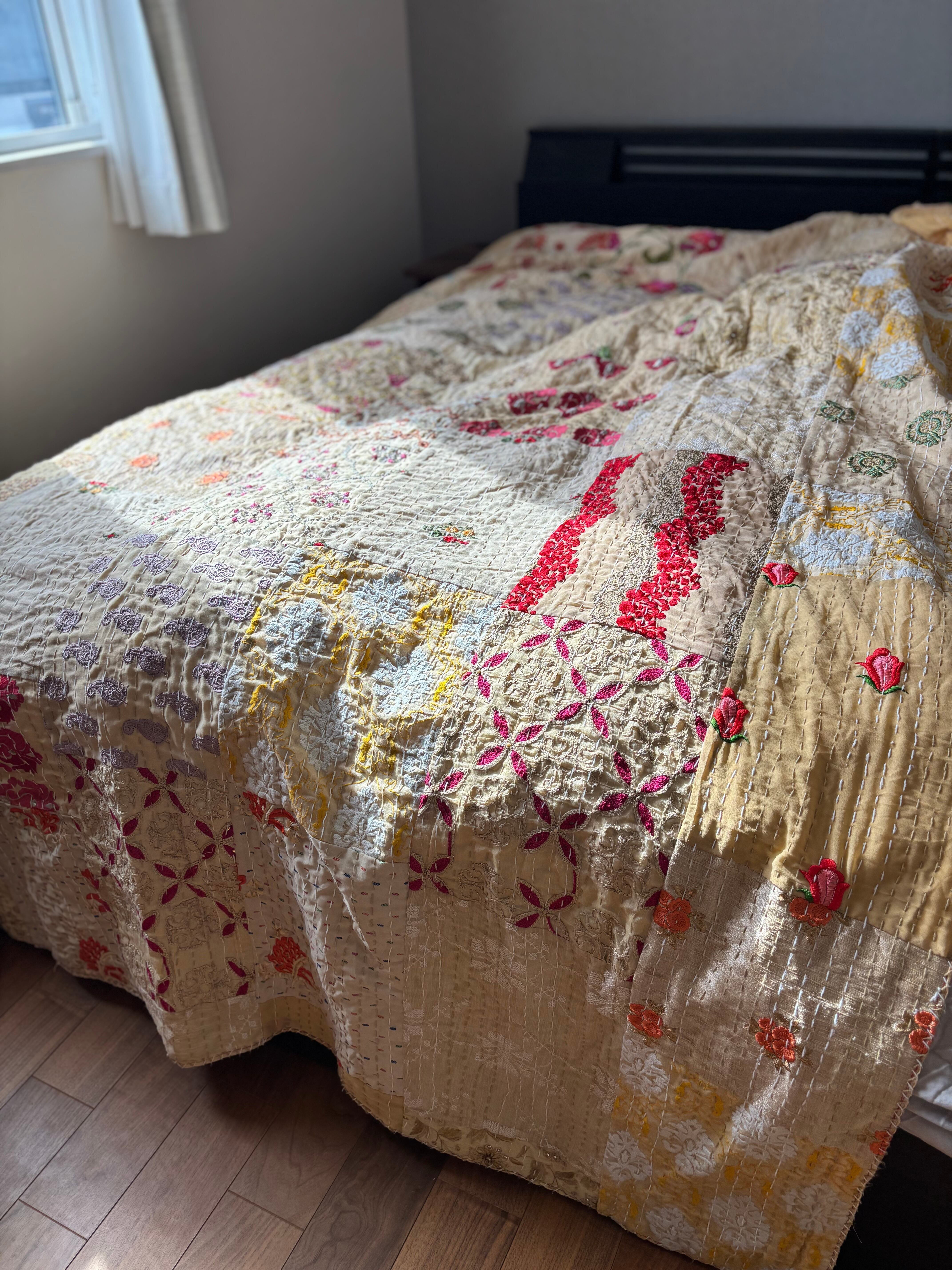 繋ぎ合わせたパッチワークキルトはとても華やか。