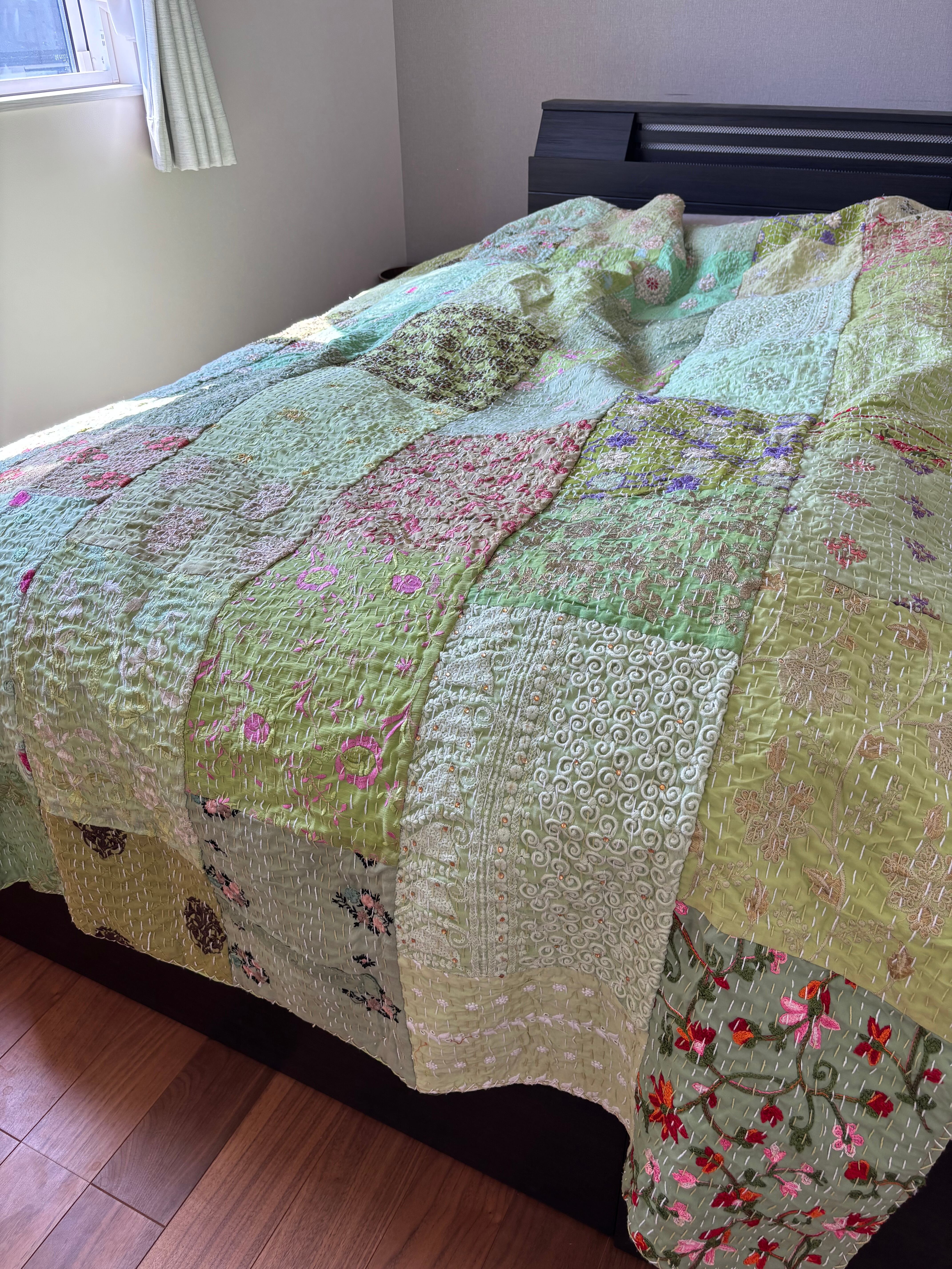 繋ぎ合わせたパッチワークキルトはとても華やか。