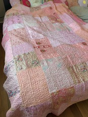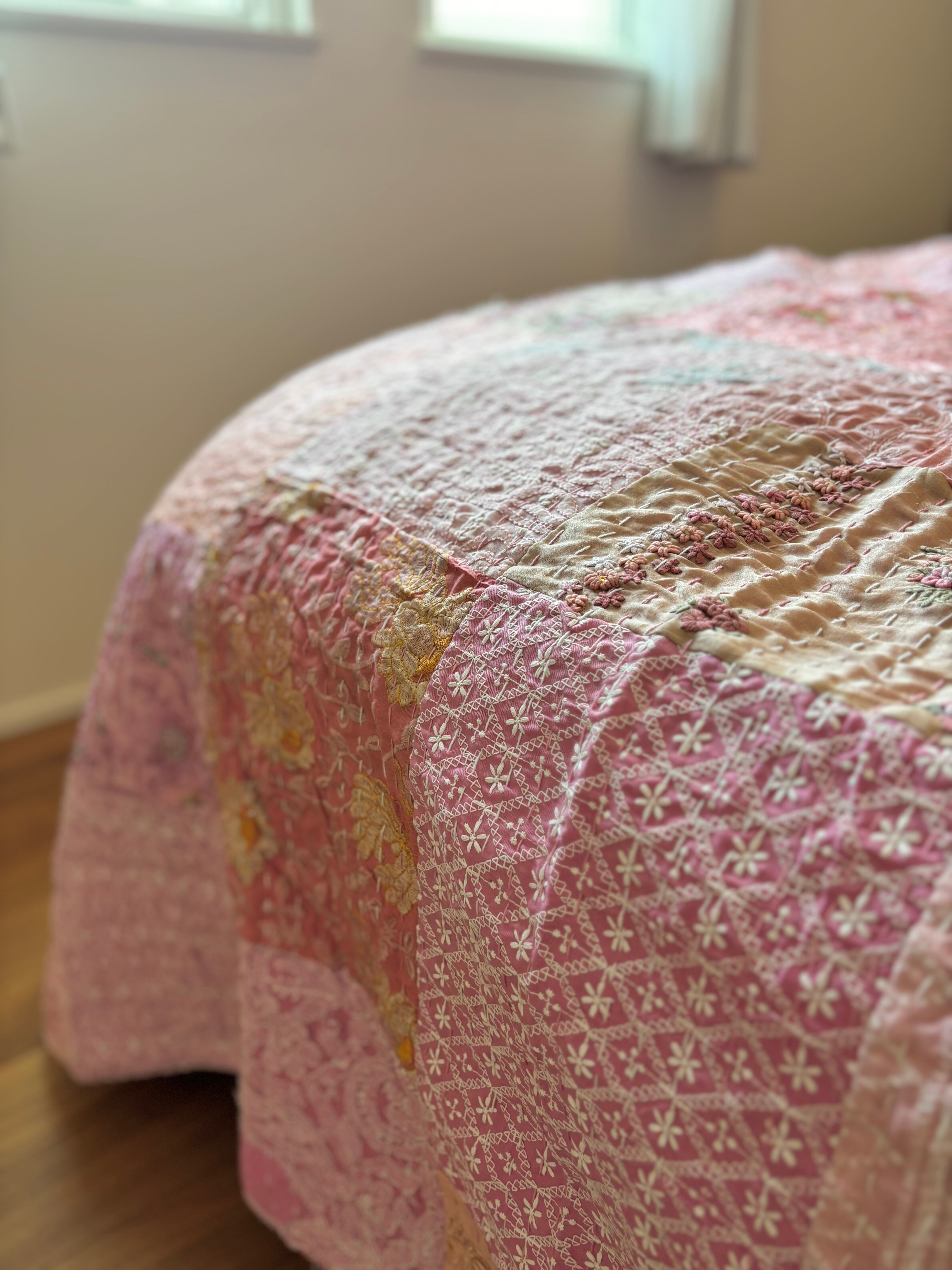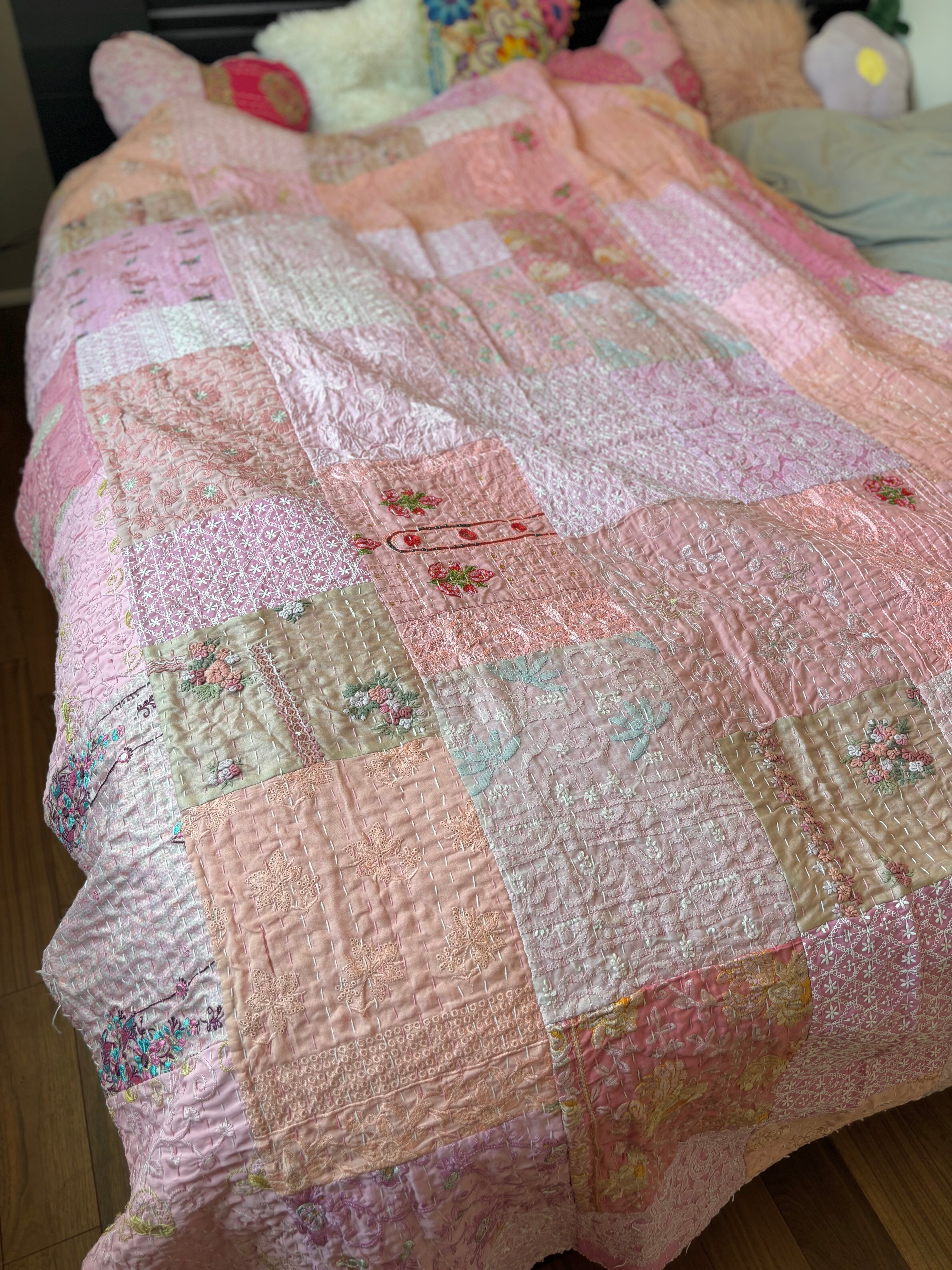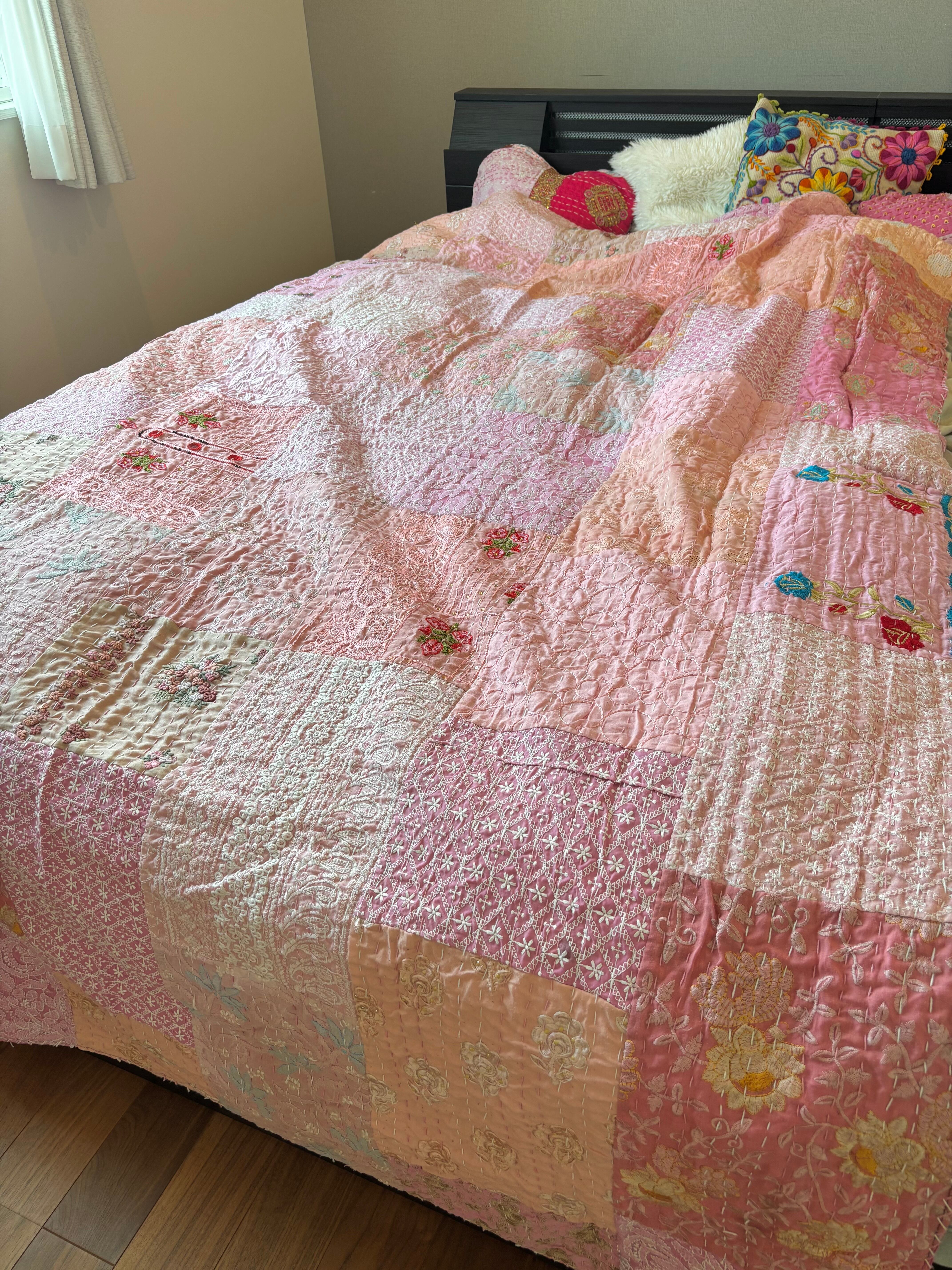 繋ぎ合わせたパッチワークキルトはとても華やか。