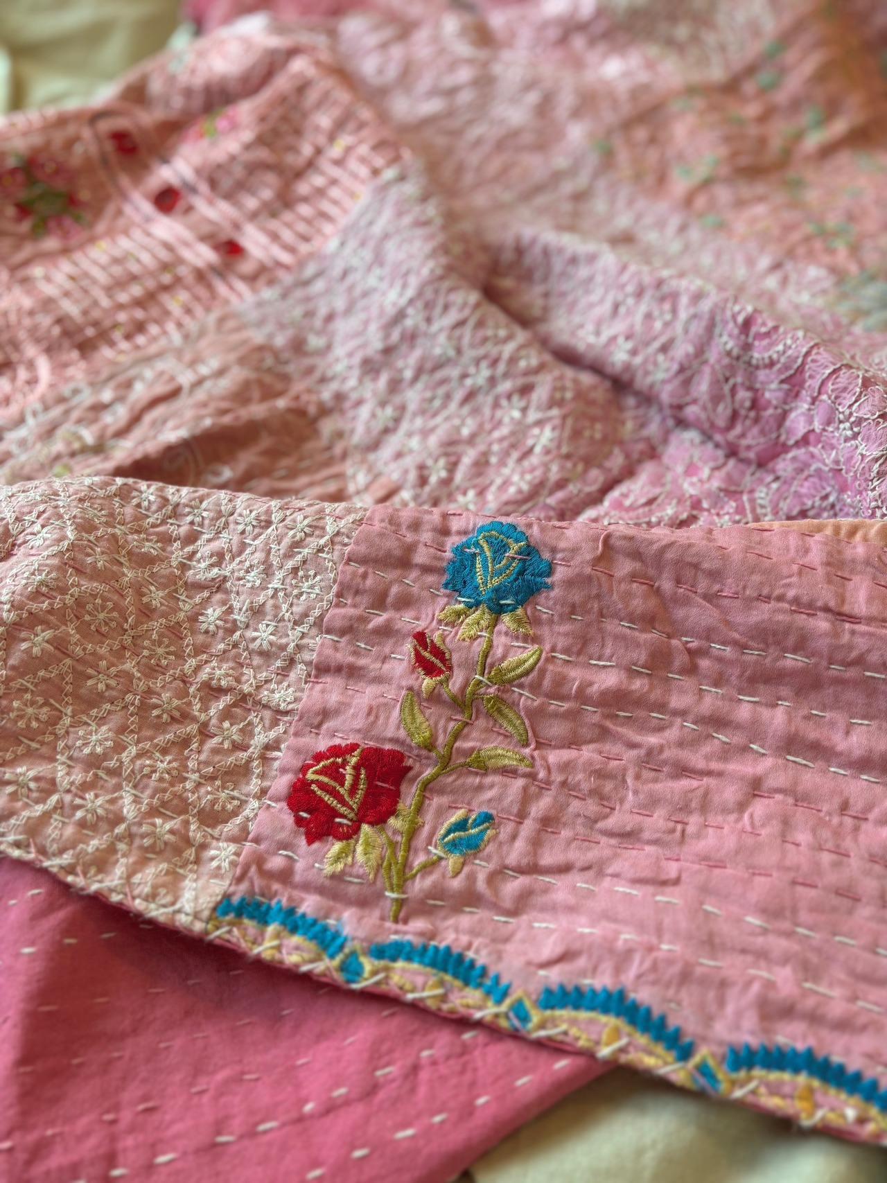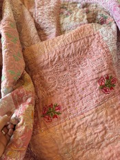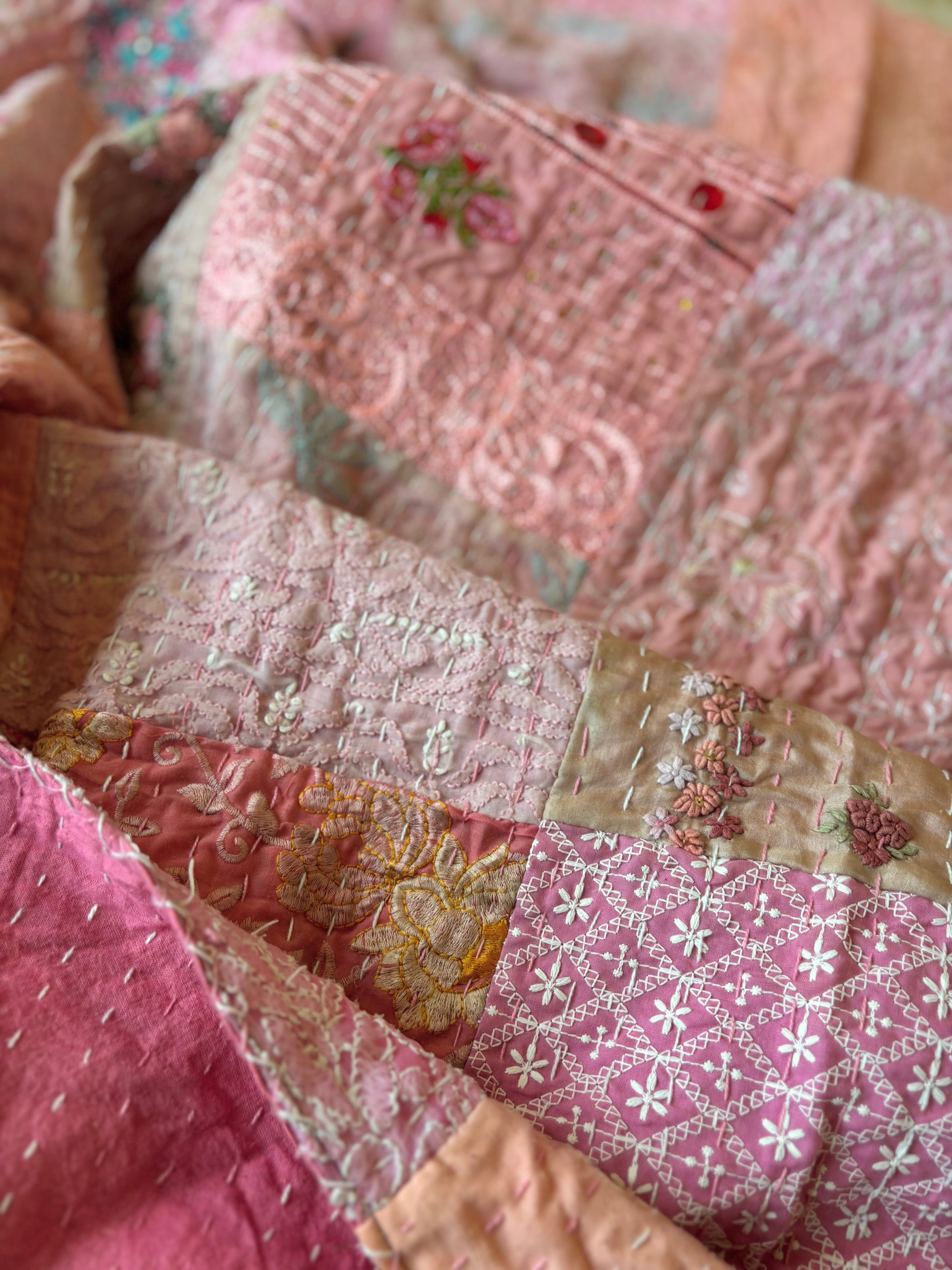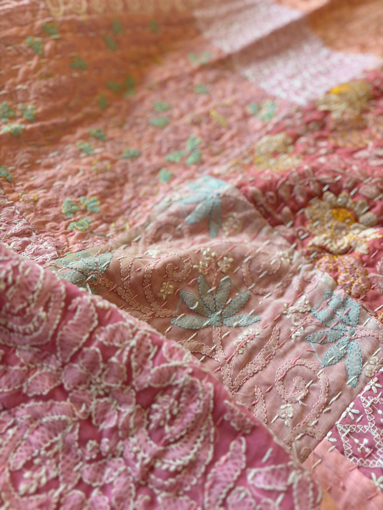 繋ぎ合わせたパッチワークキルトはとても華やか。