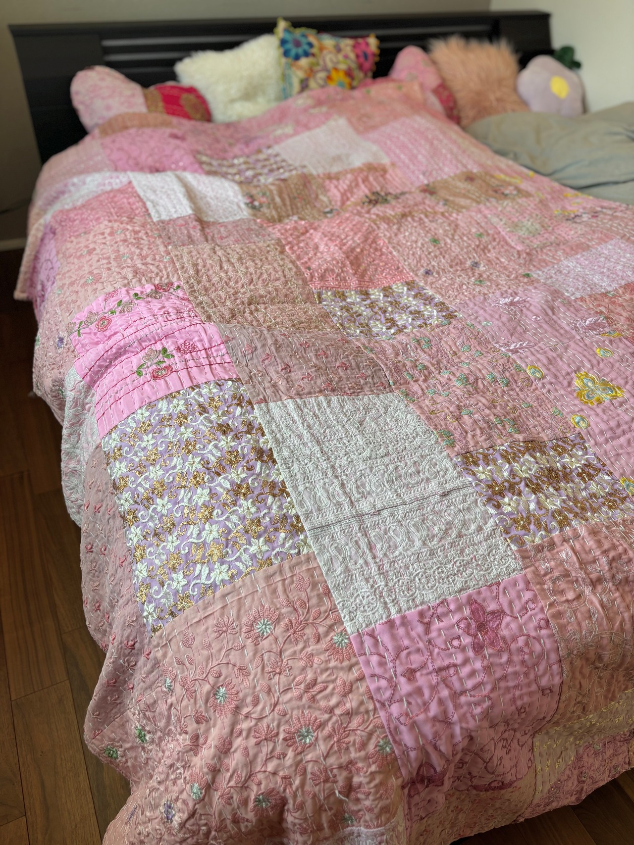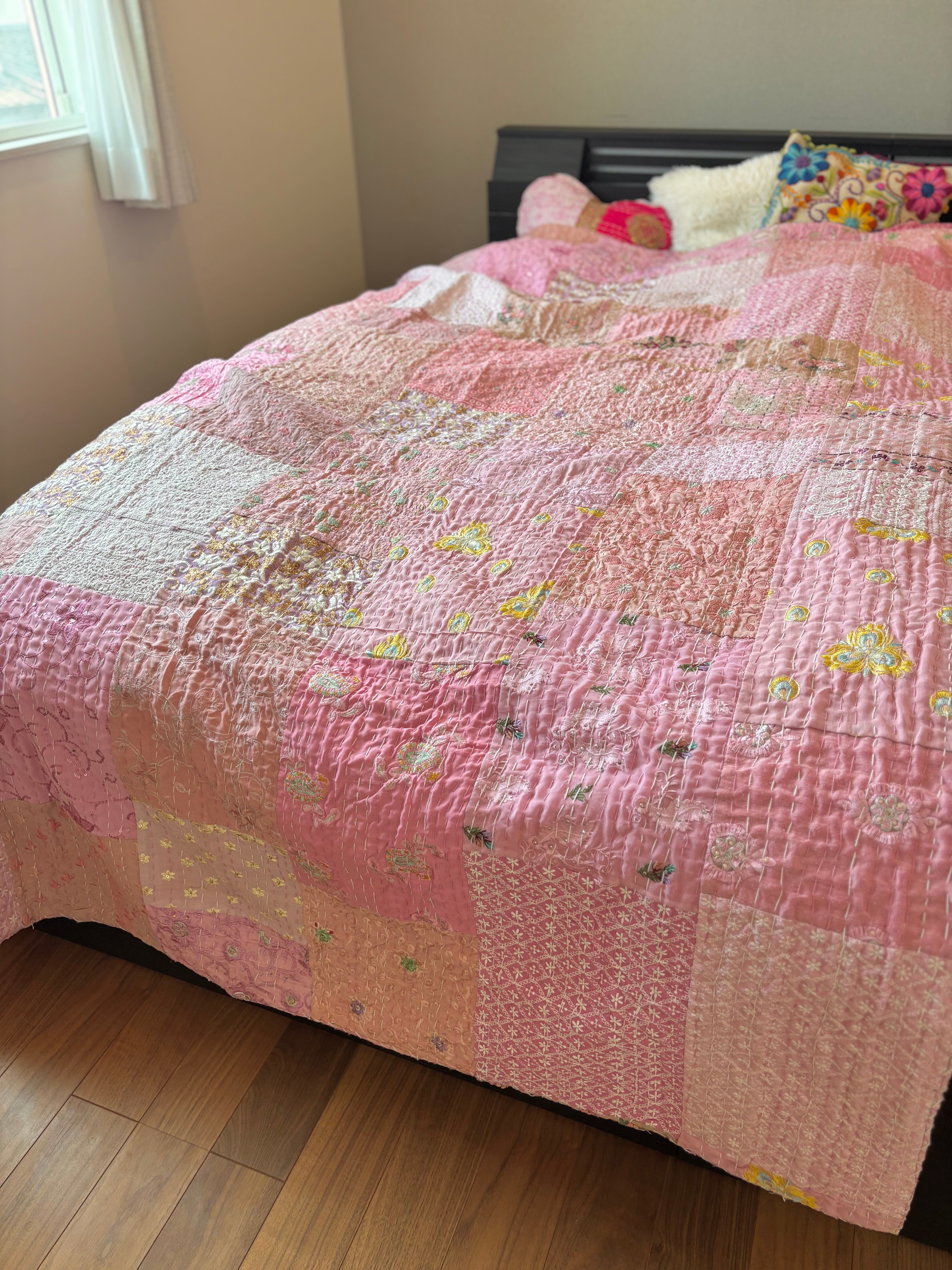 繋ぎ合わせたパッチワークキルトはとても華やか。