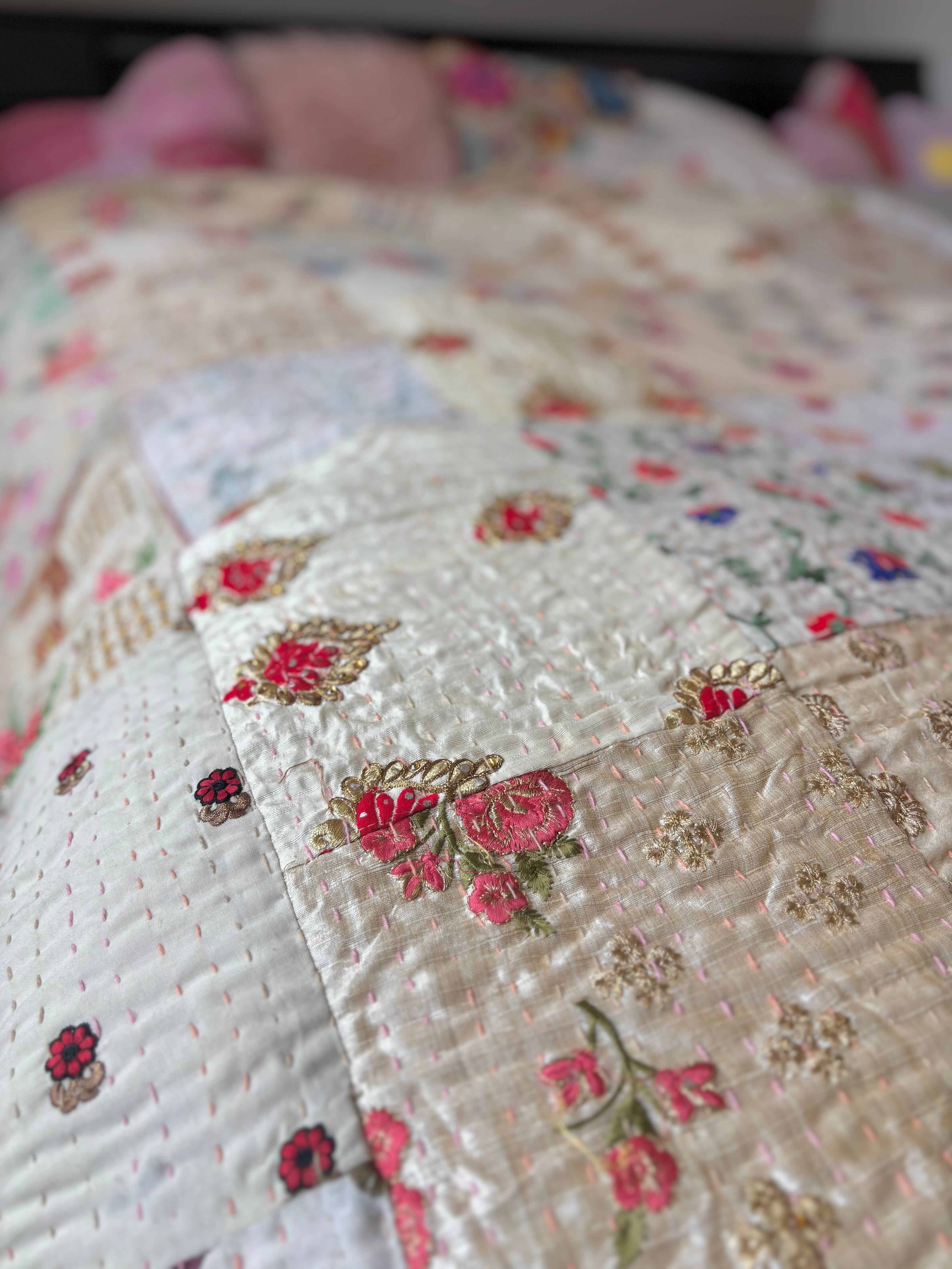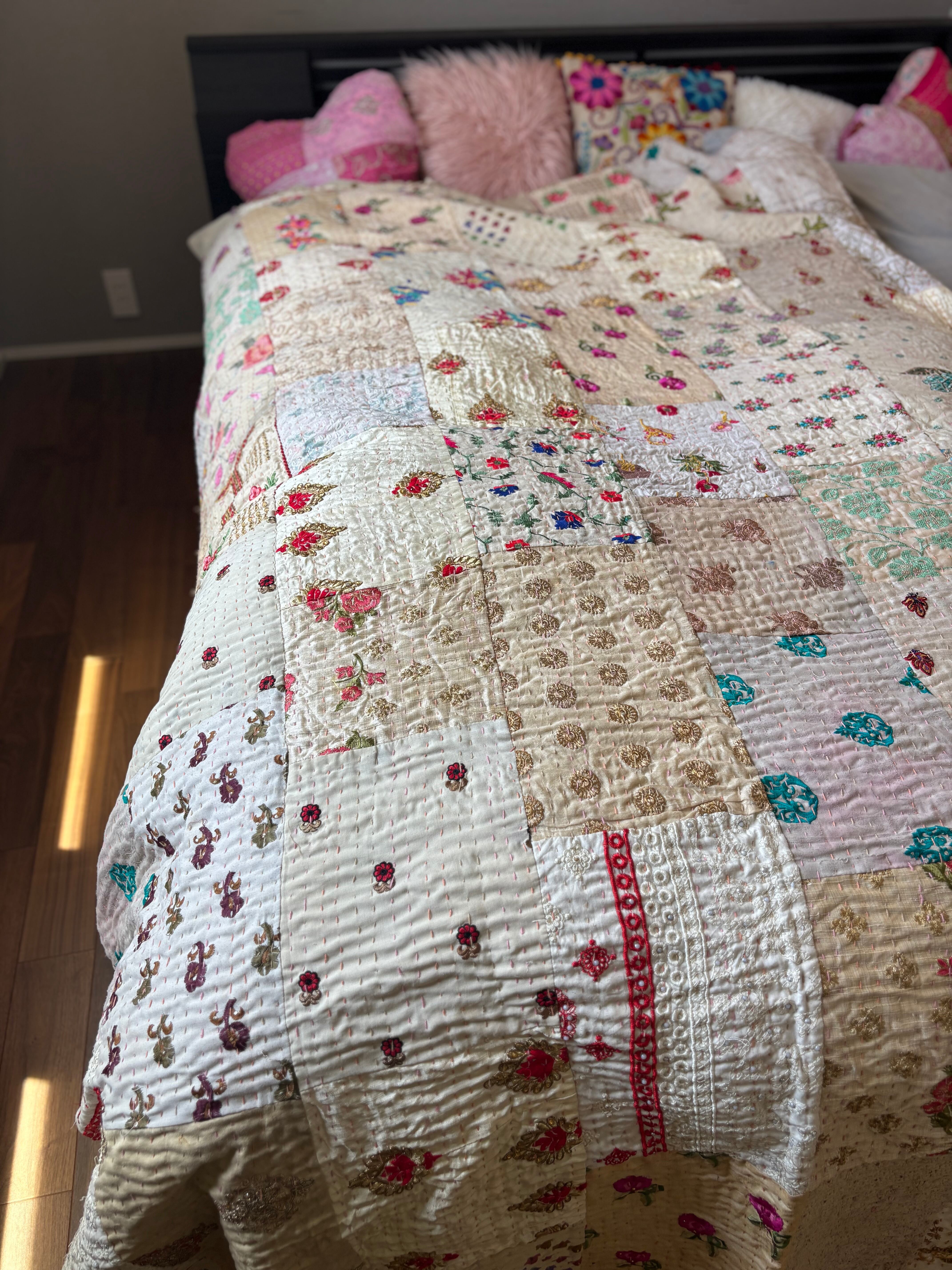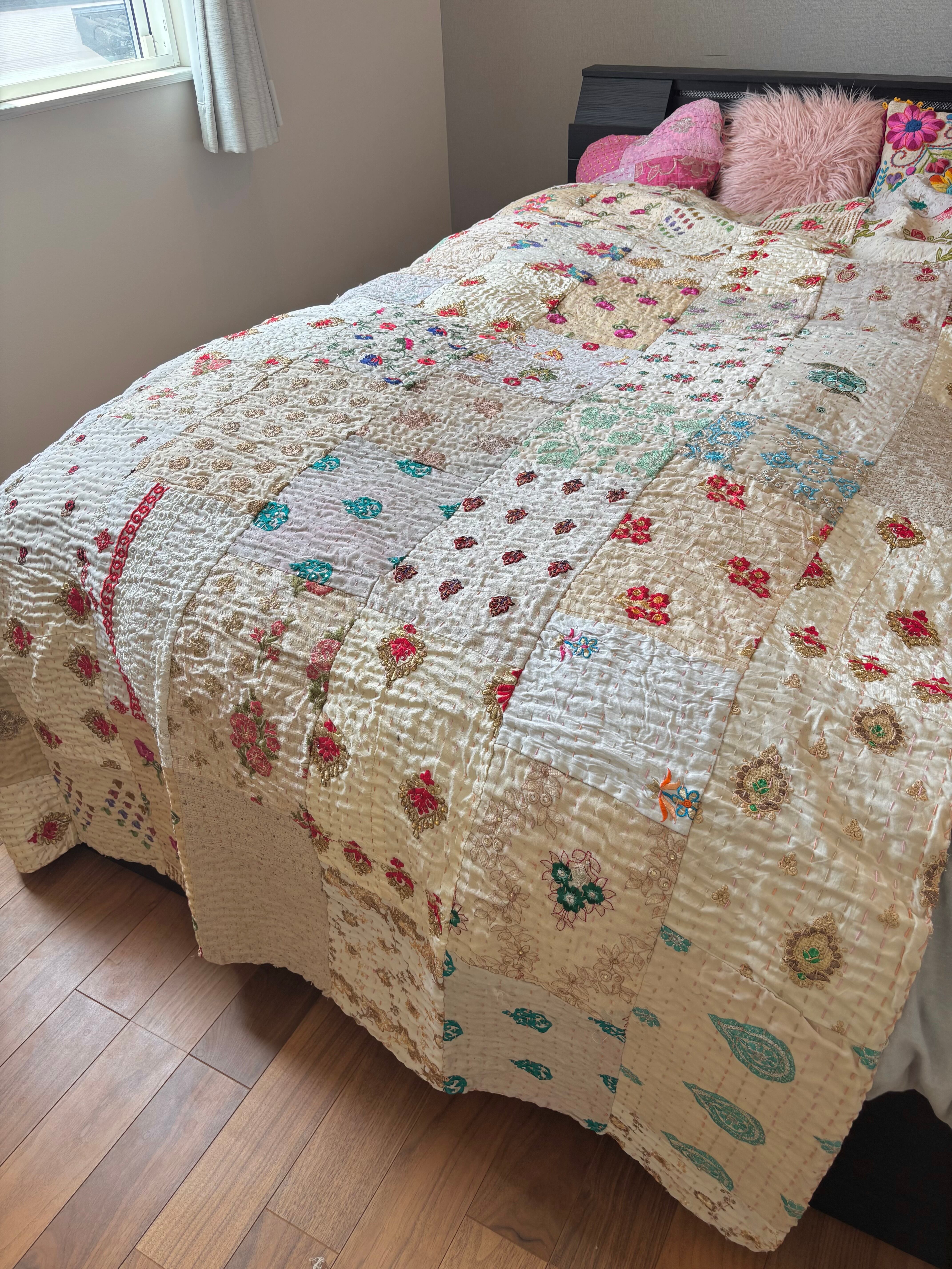 繋ぎ合わせたパッチワークキルトはとても華やか。