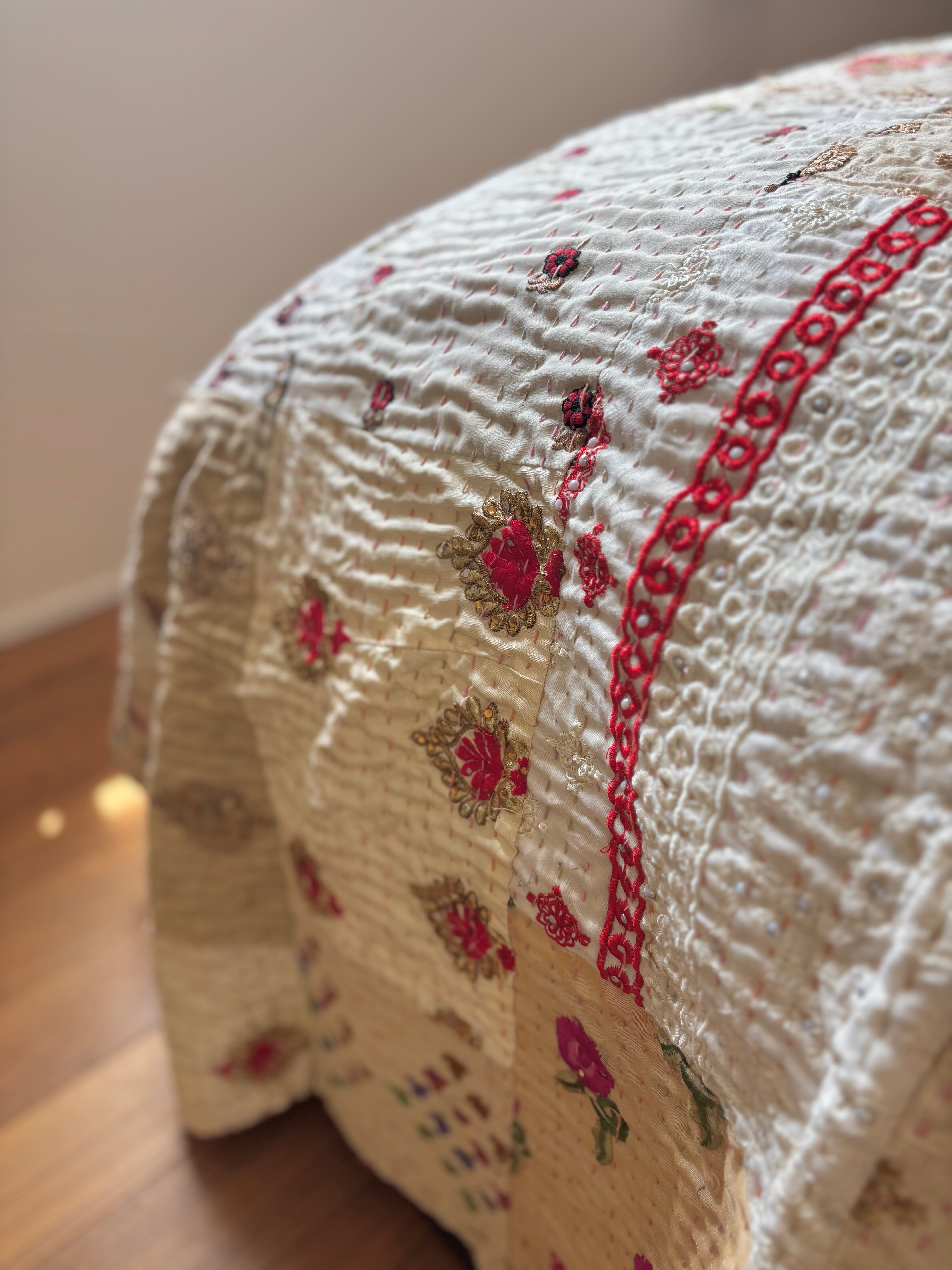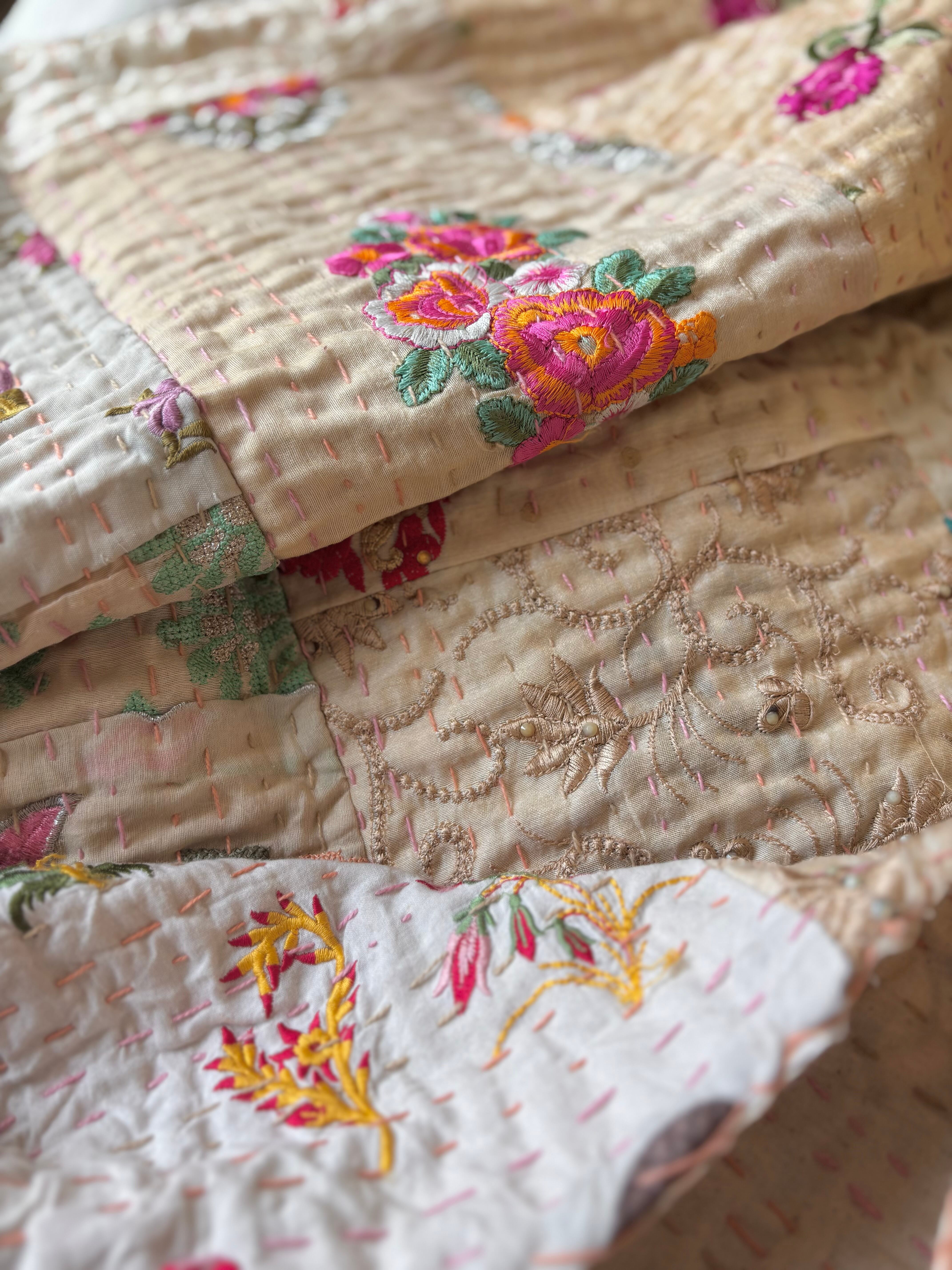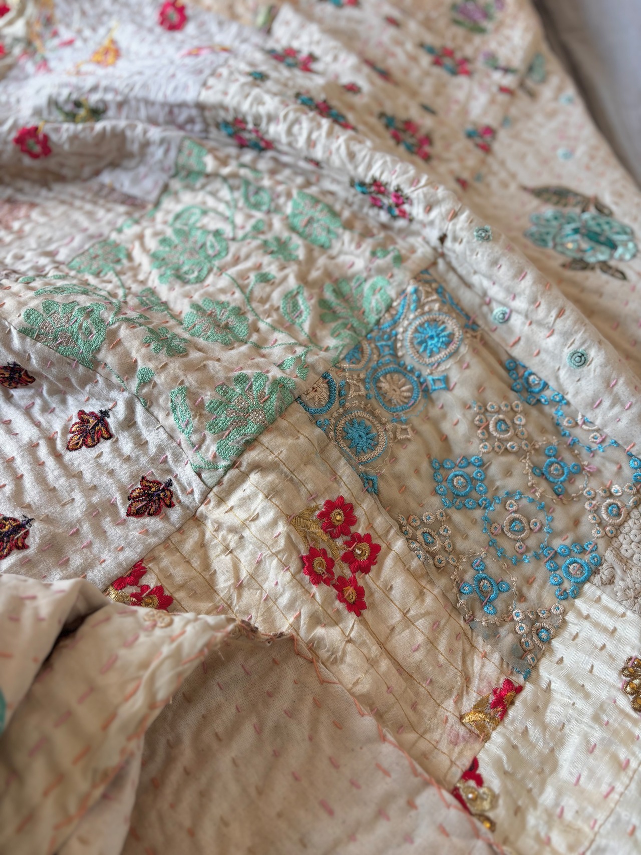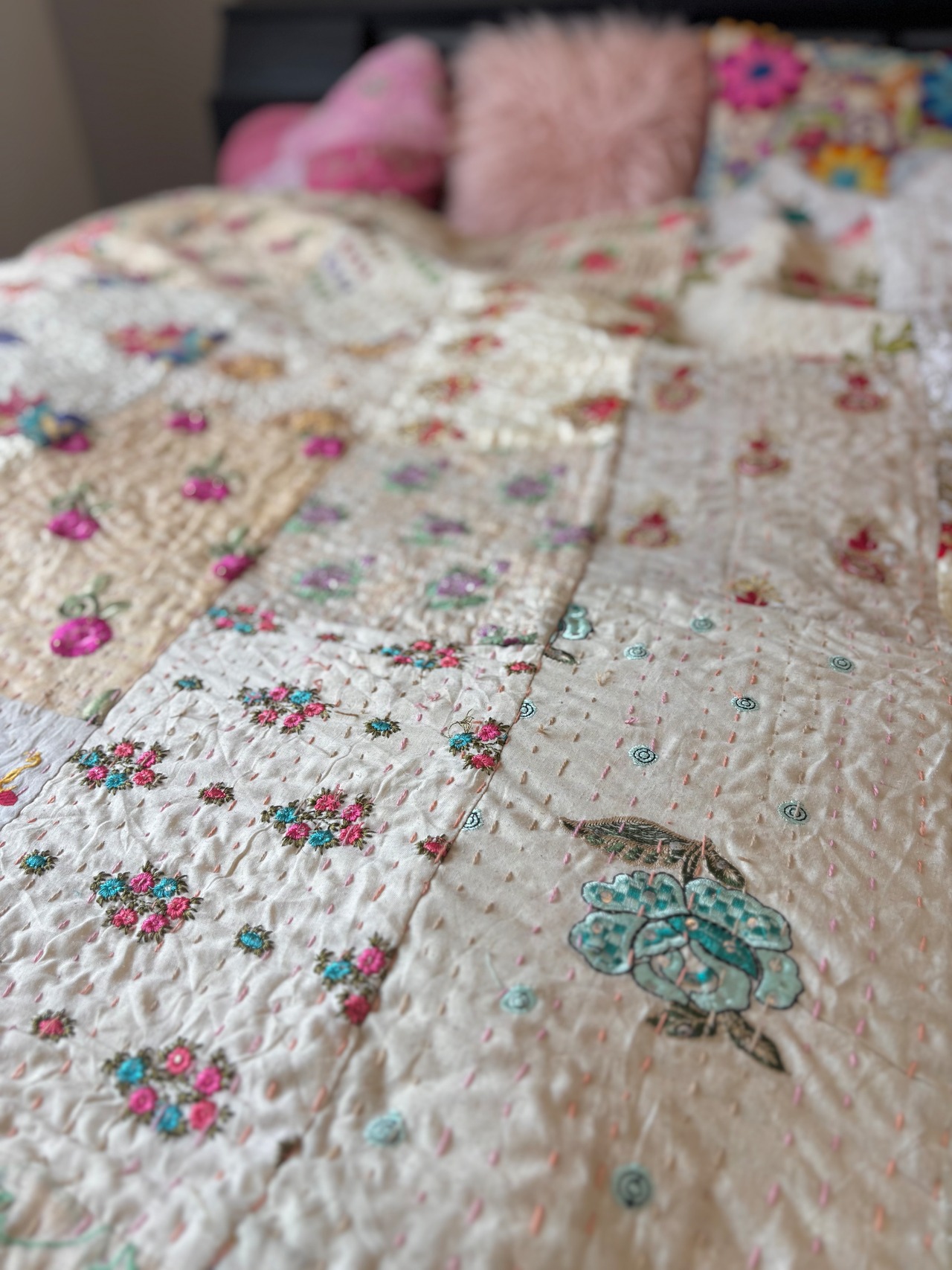 繋ぎ合わせたパッチワークキルトはとても華やか。