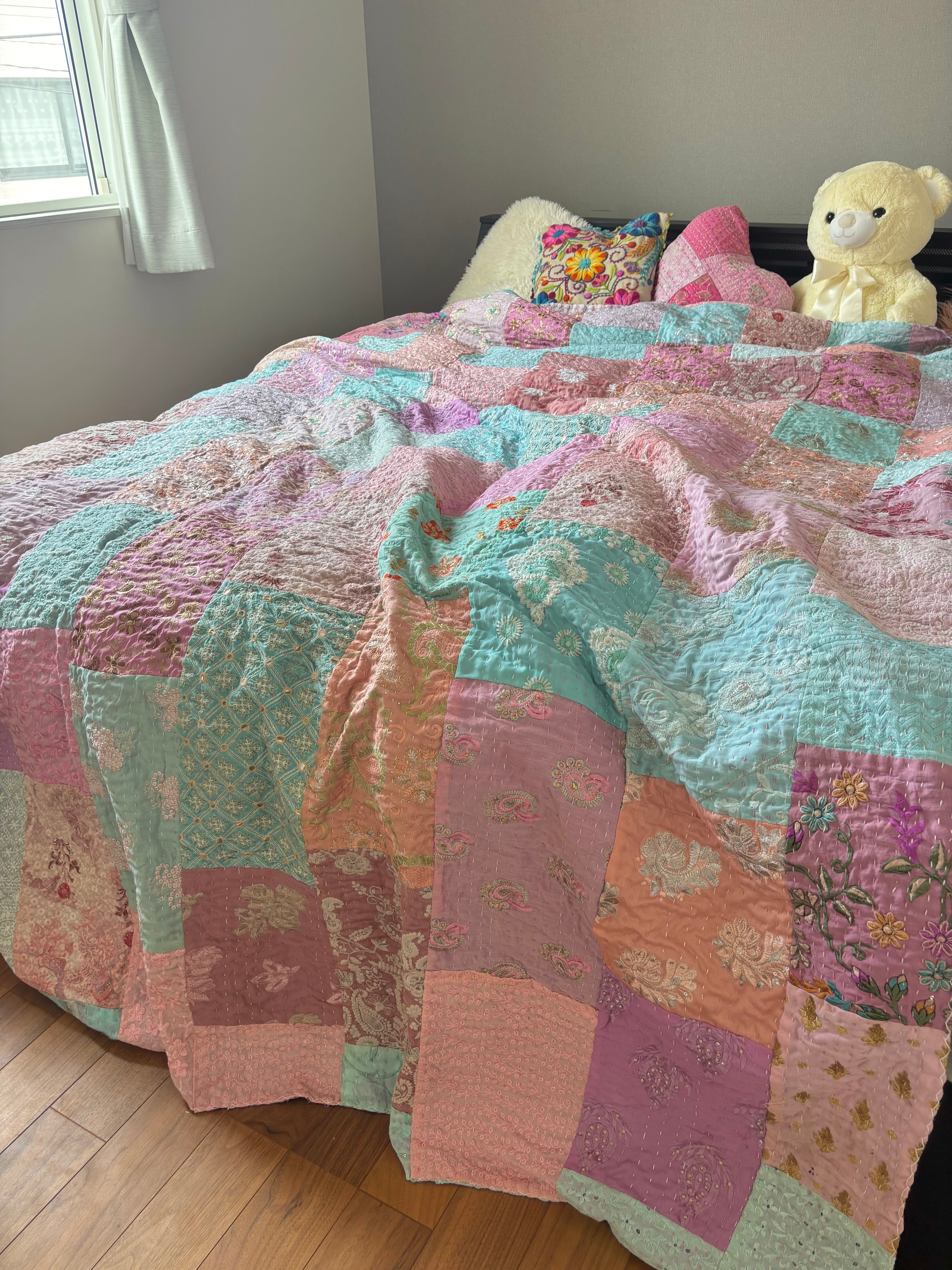 繋ぎ合わせたパッチワークキルトはとても華やか。