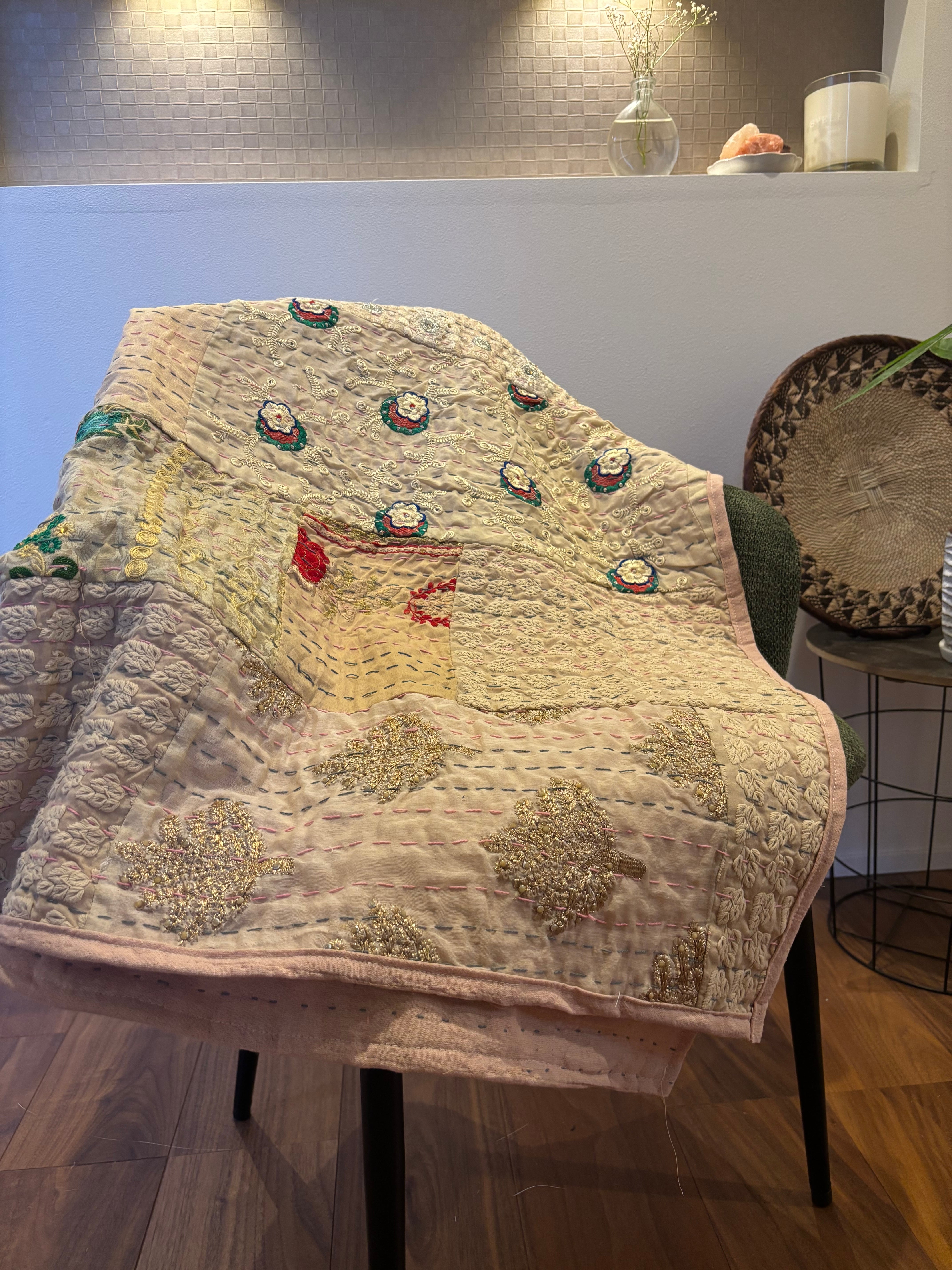 繋ぎ合わせたパッチワークキルトはとても華やか。