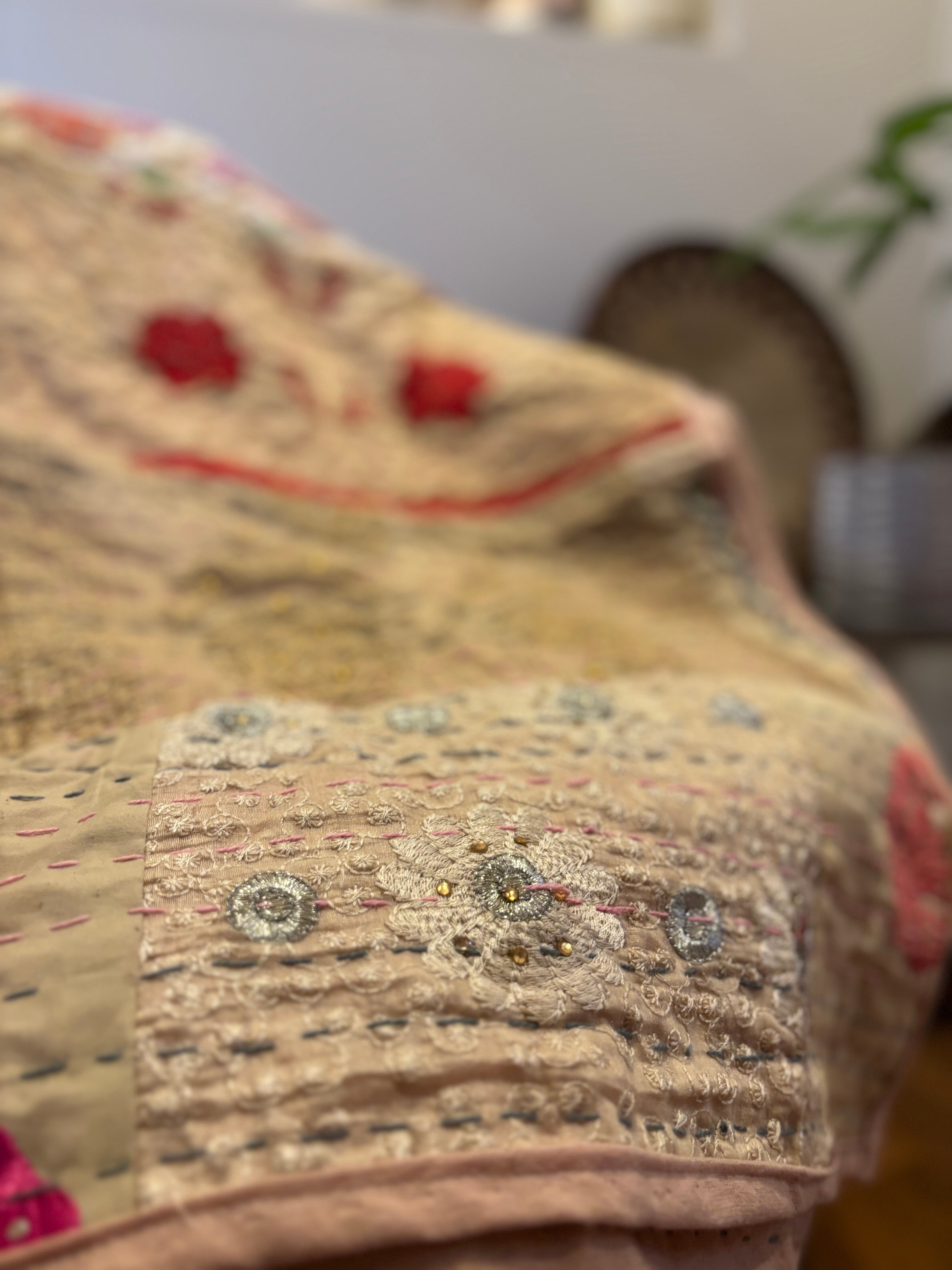 繋ぎ合わせたパッチワークキルトはとても華やか。
