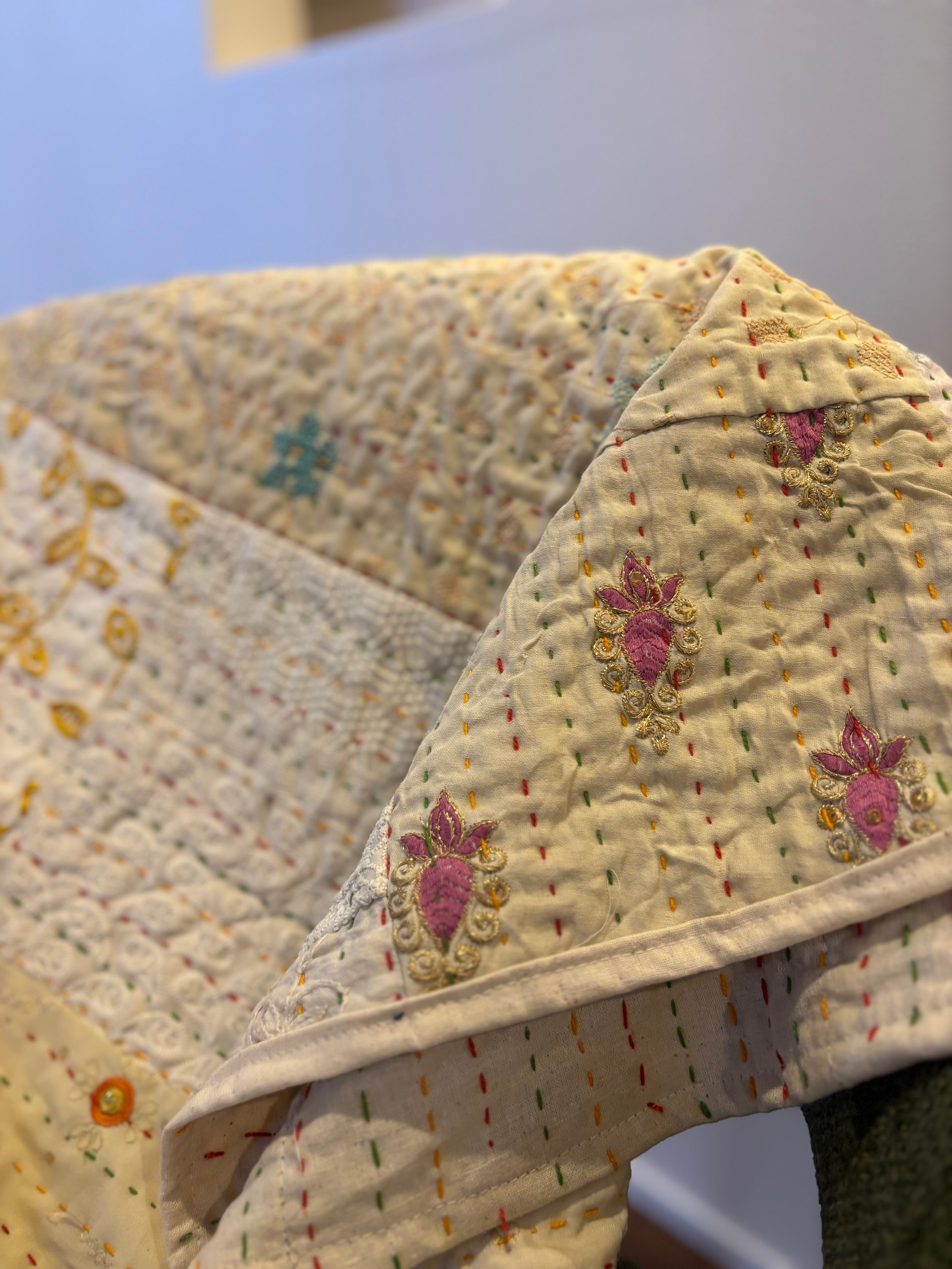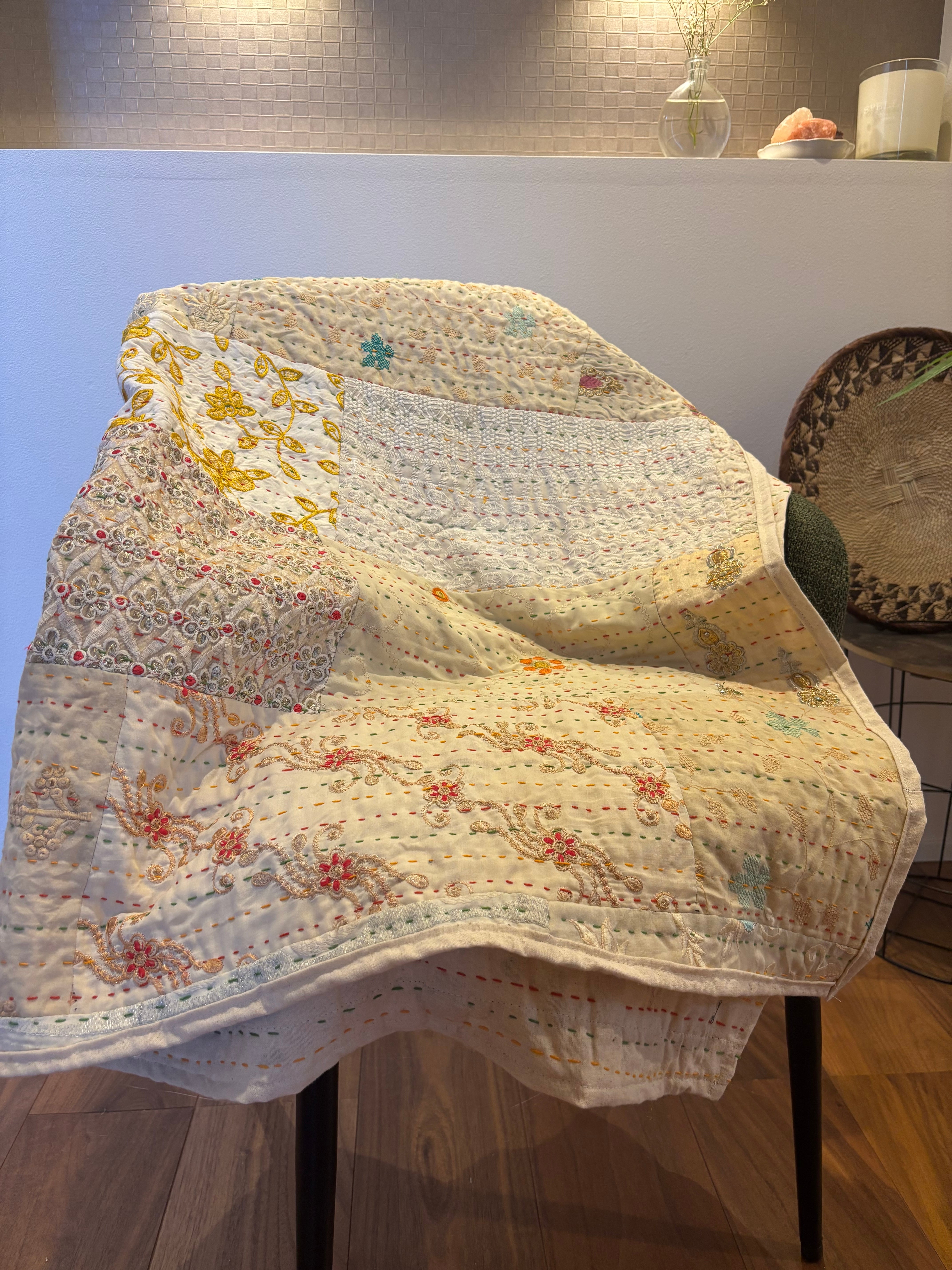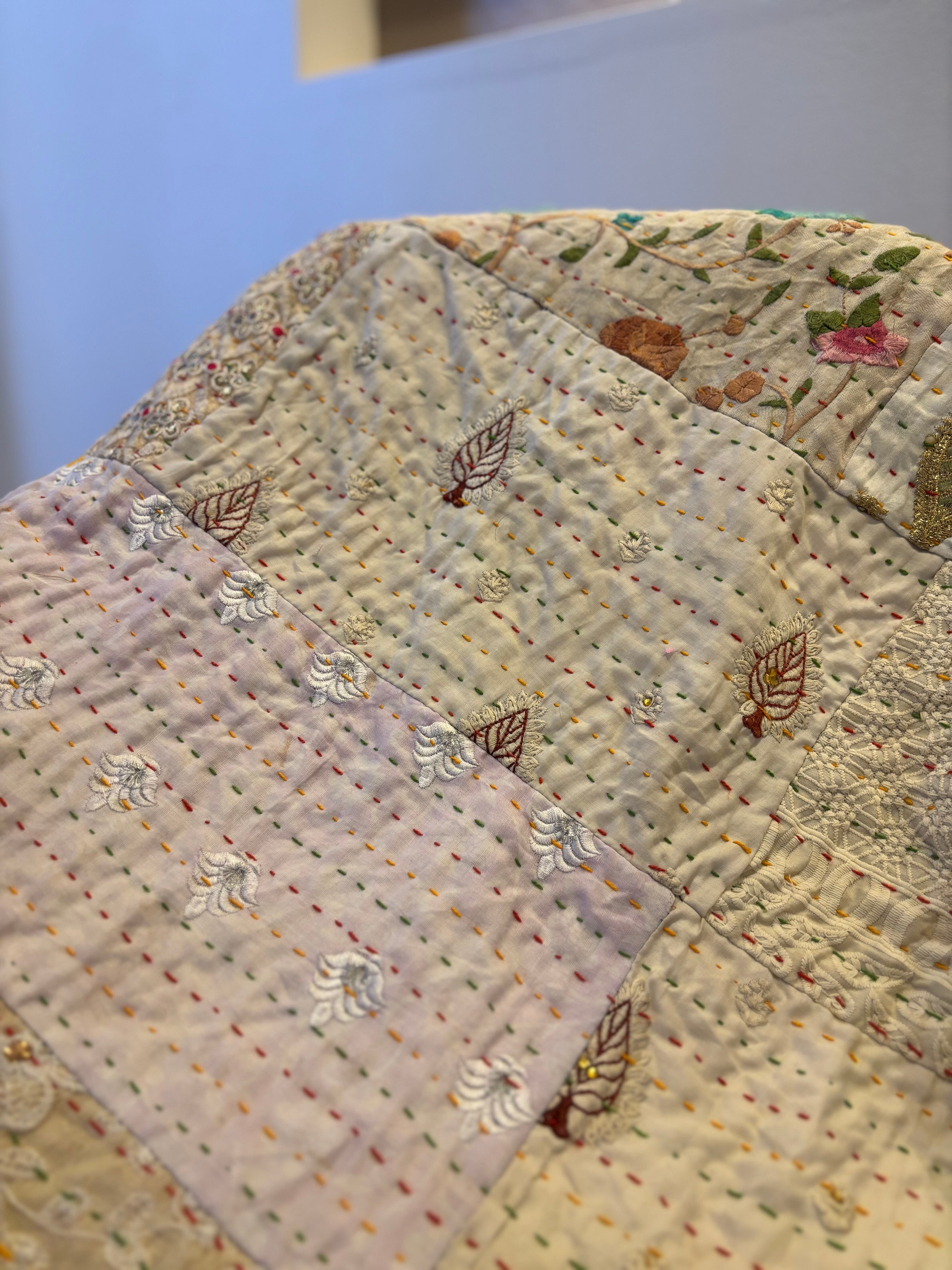 繋ぎ合わせたパッチワークキルトはとても華やか。