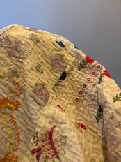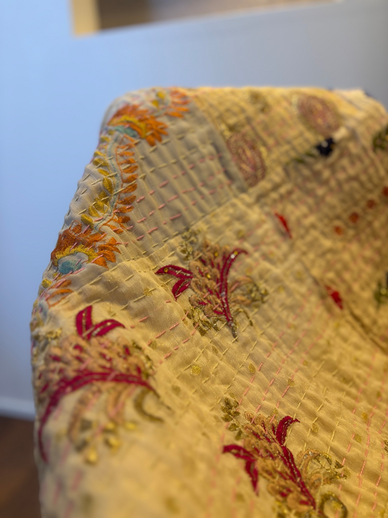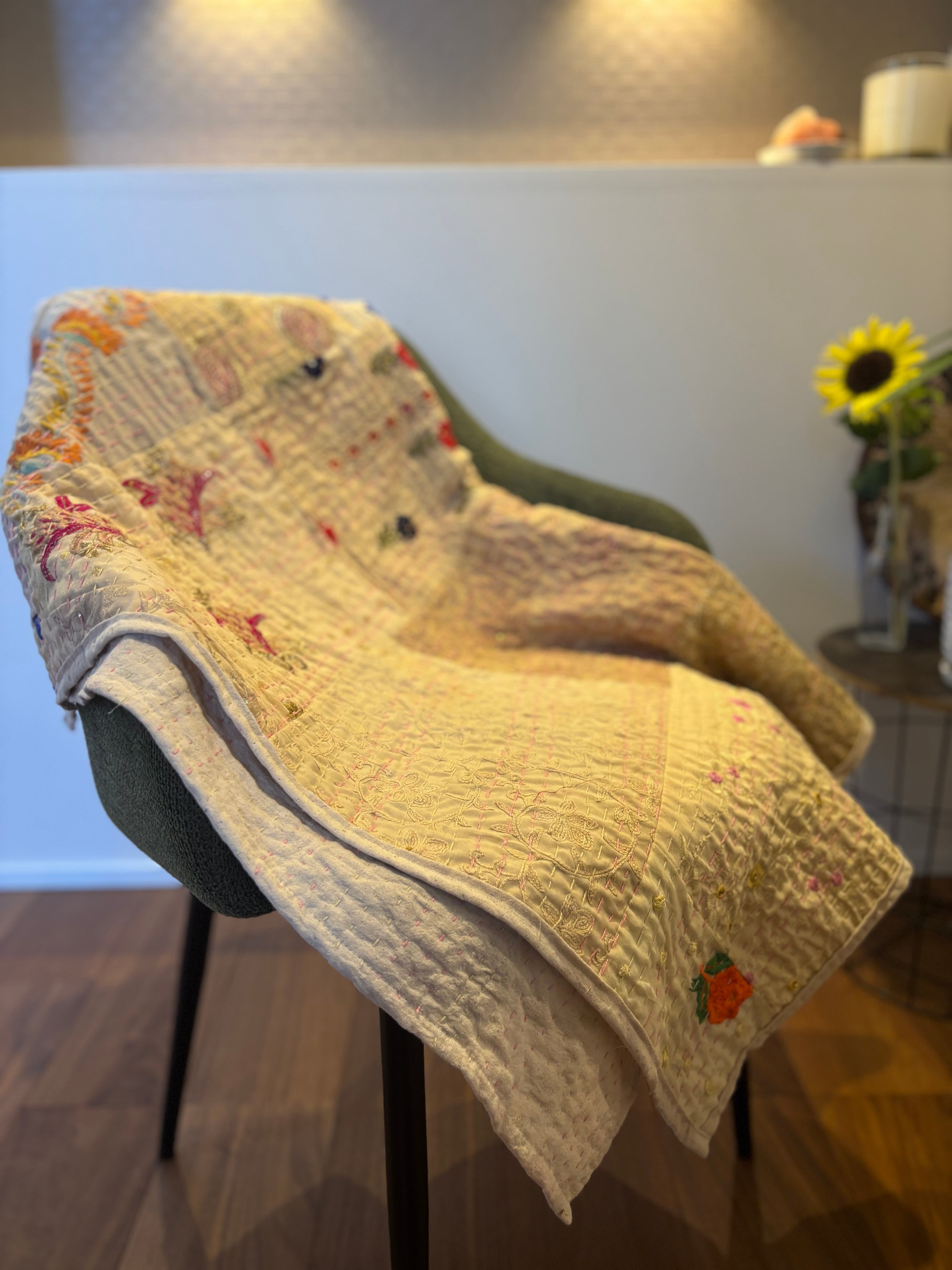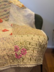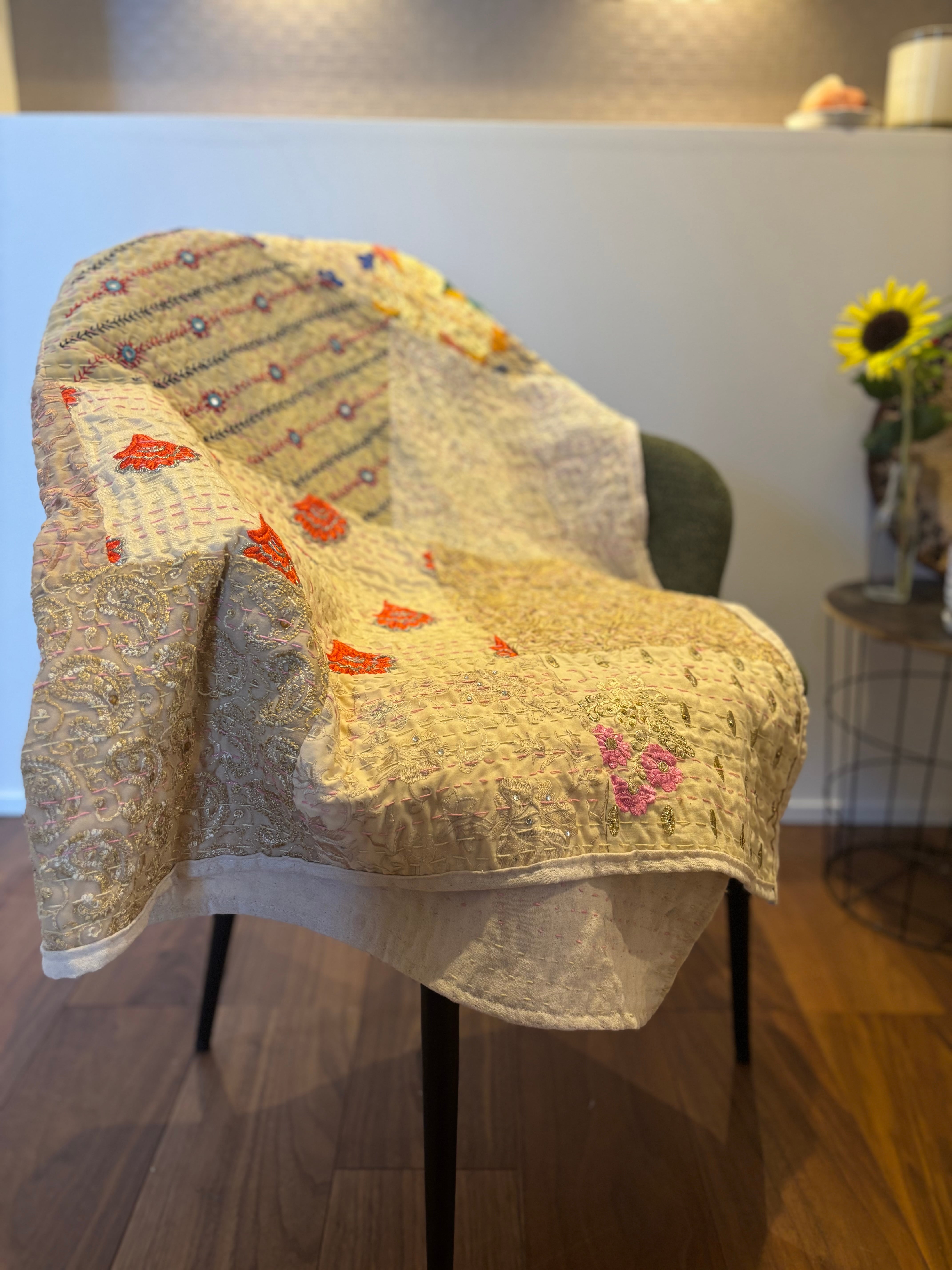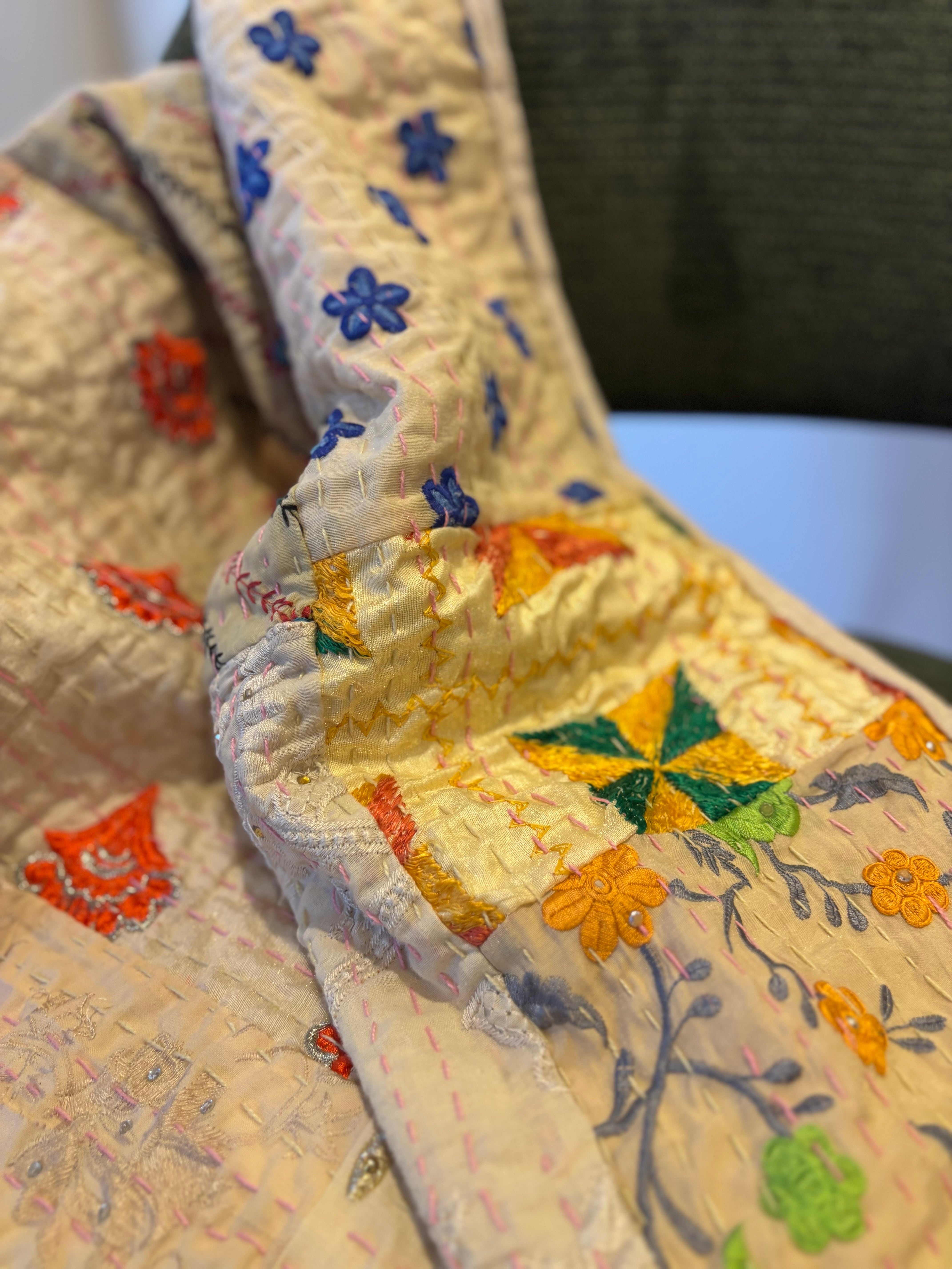 繋ぎ合わせたパッチワークキルトはとても華やか。