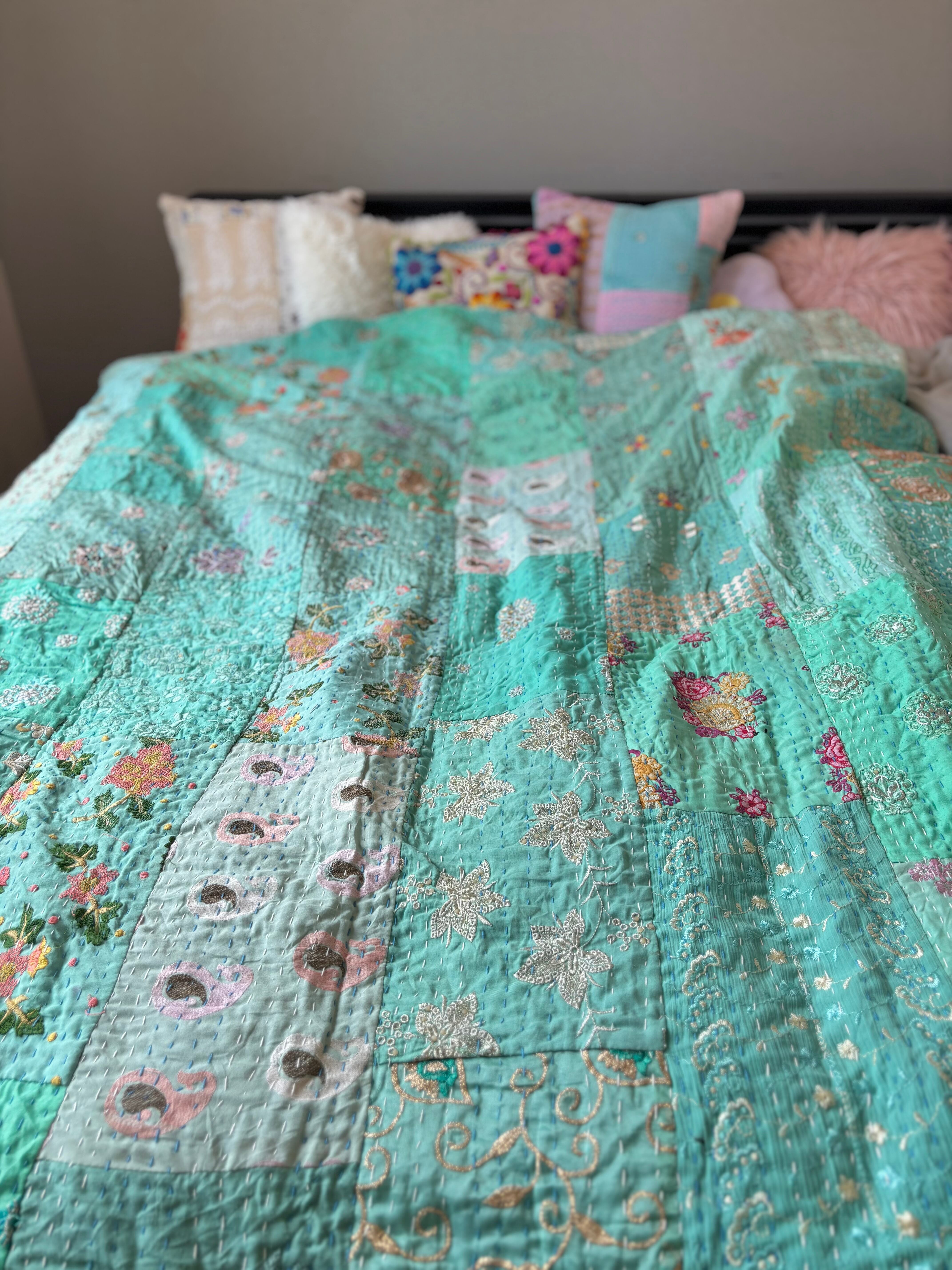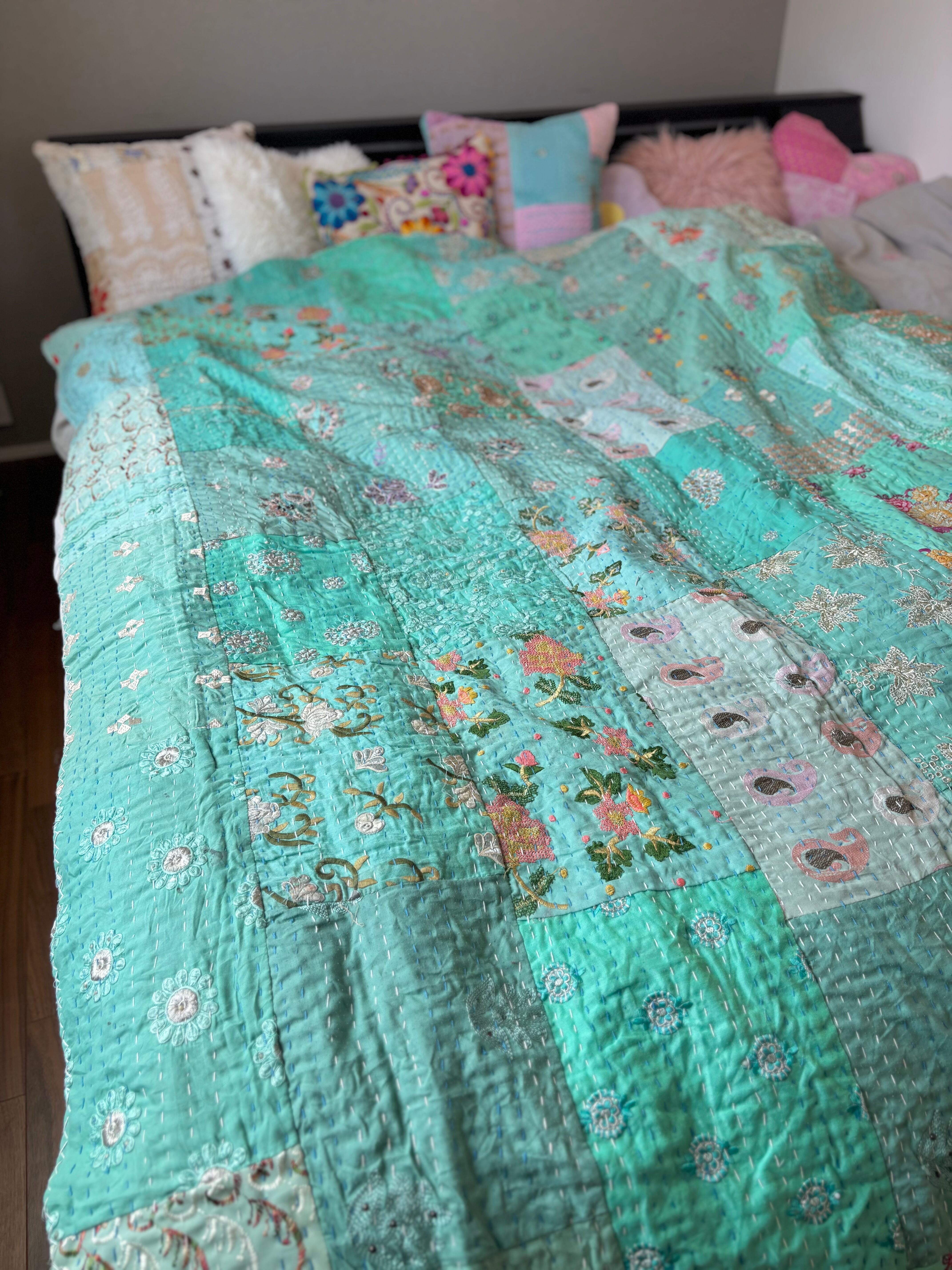 繋ぎ合わせたパッチワークキルトはとても華やか。