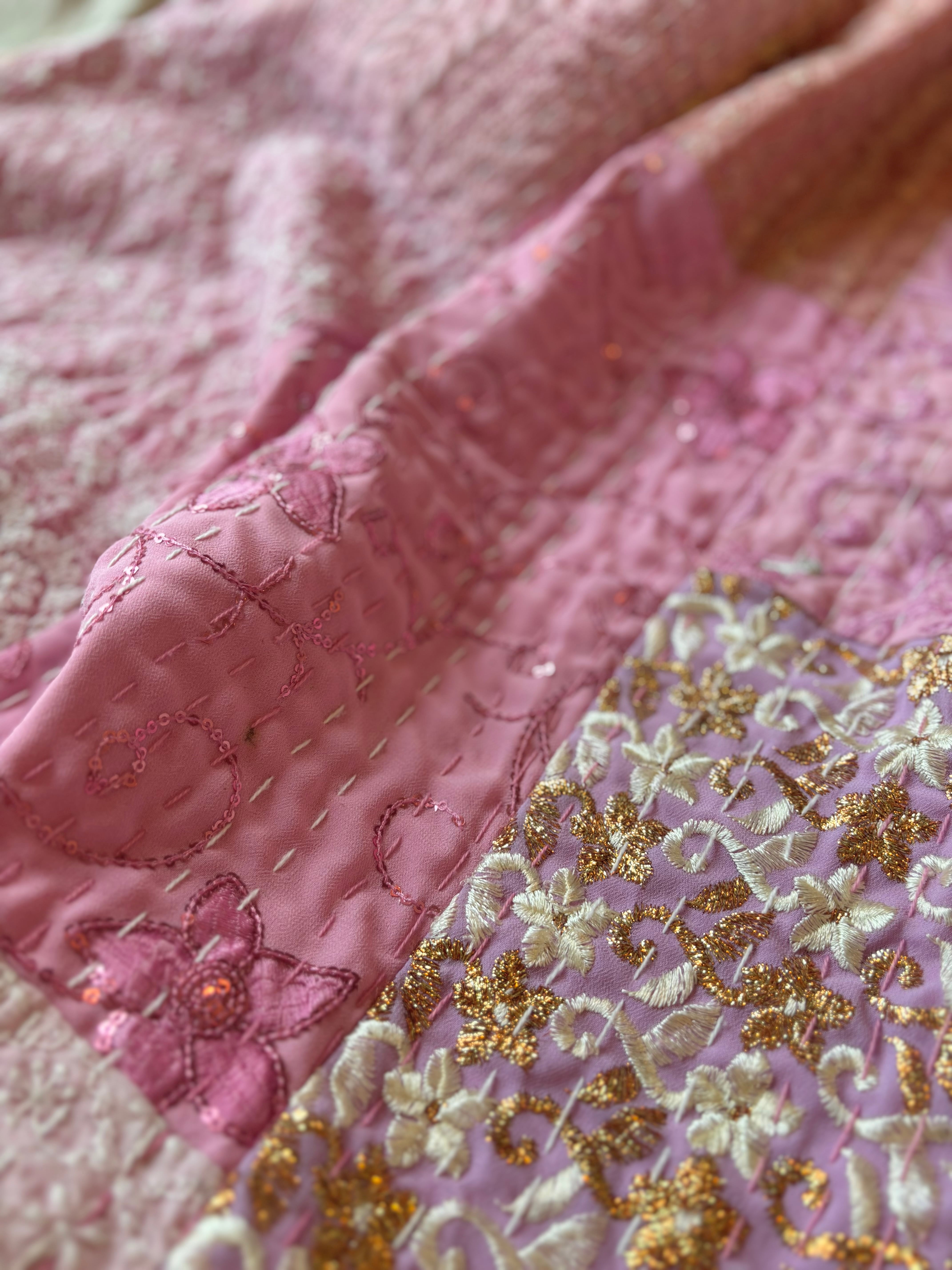 繋ぎ合わせたパッチワークキルトはとても華やか。