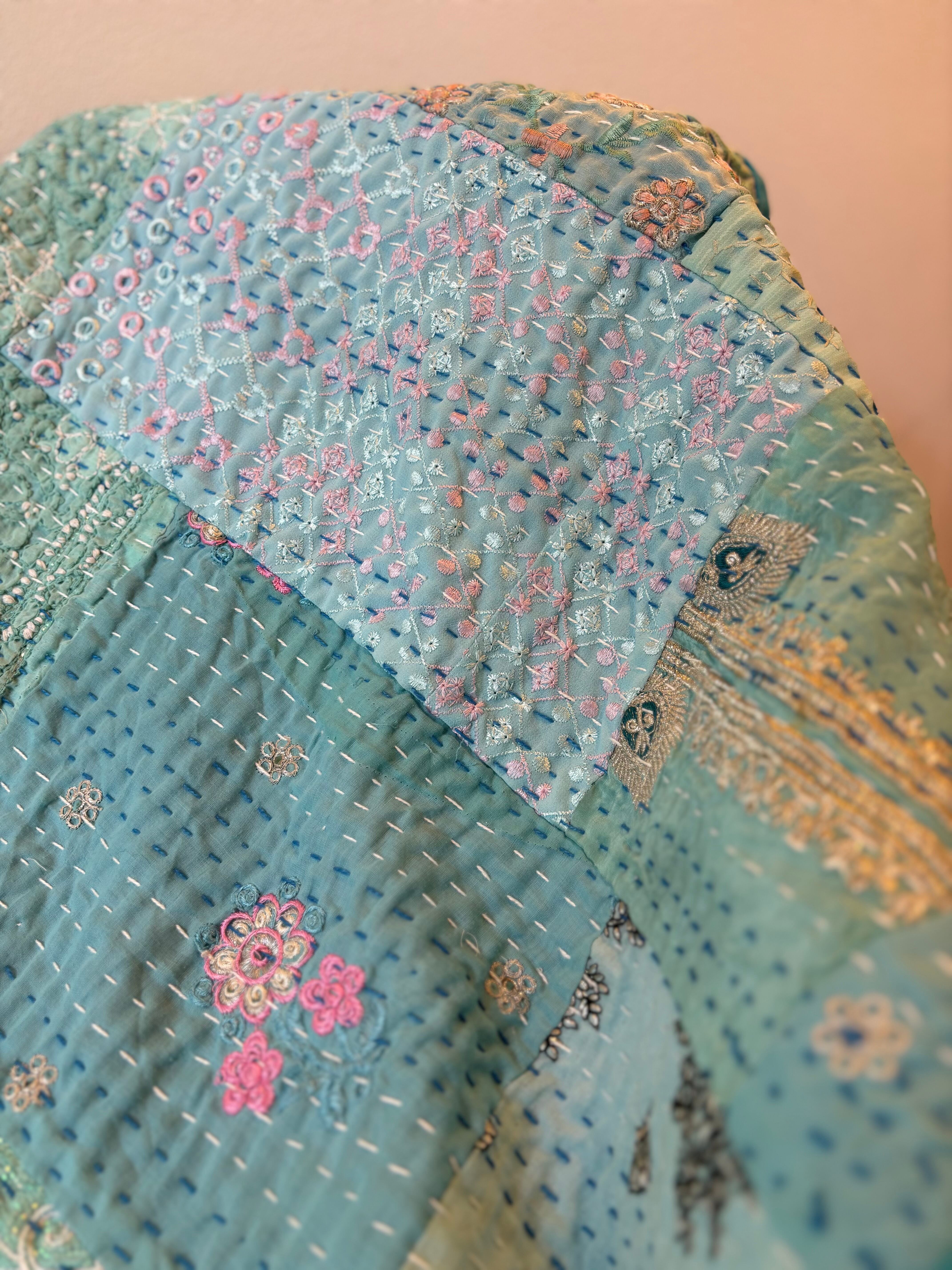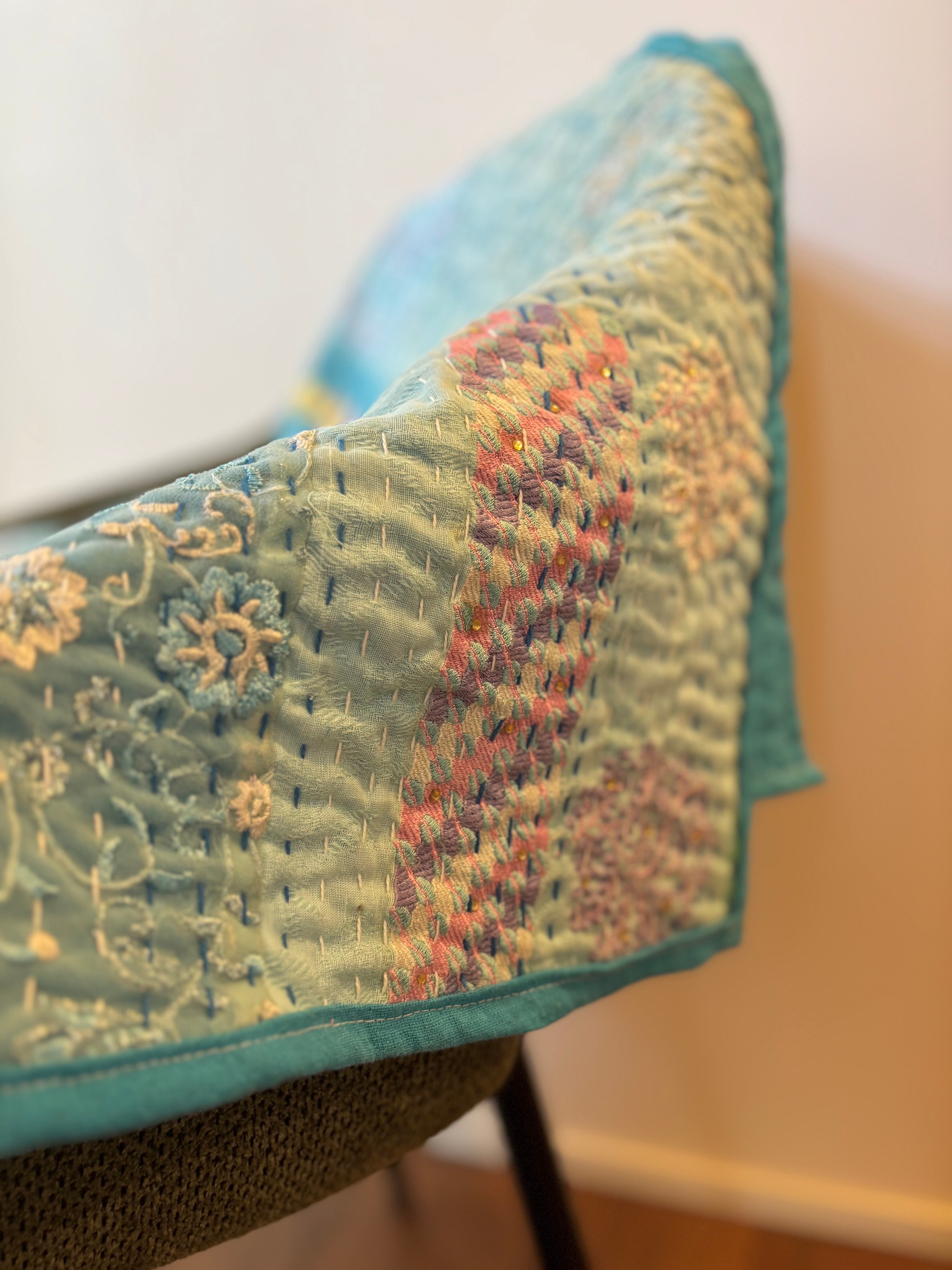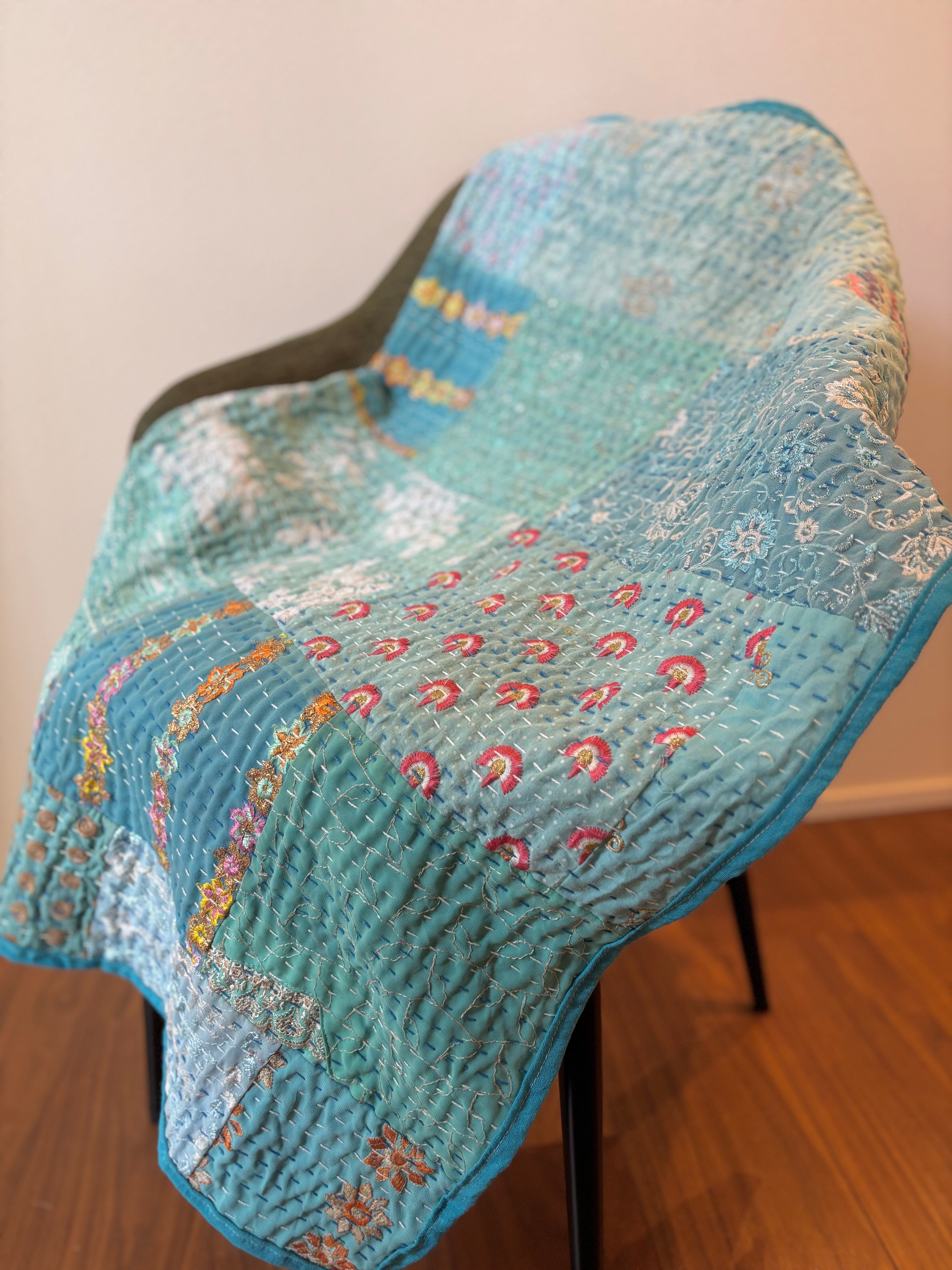 繋ぎ合わせたパッチワークキルトはとても華やか。