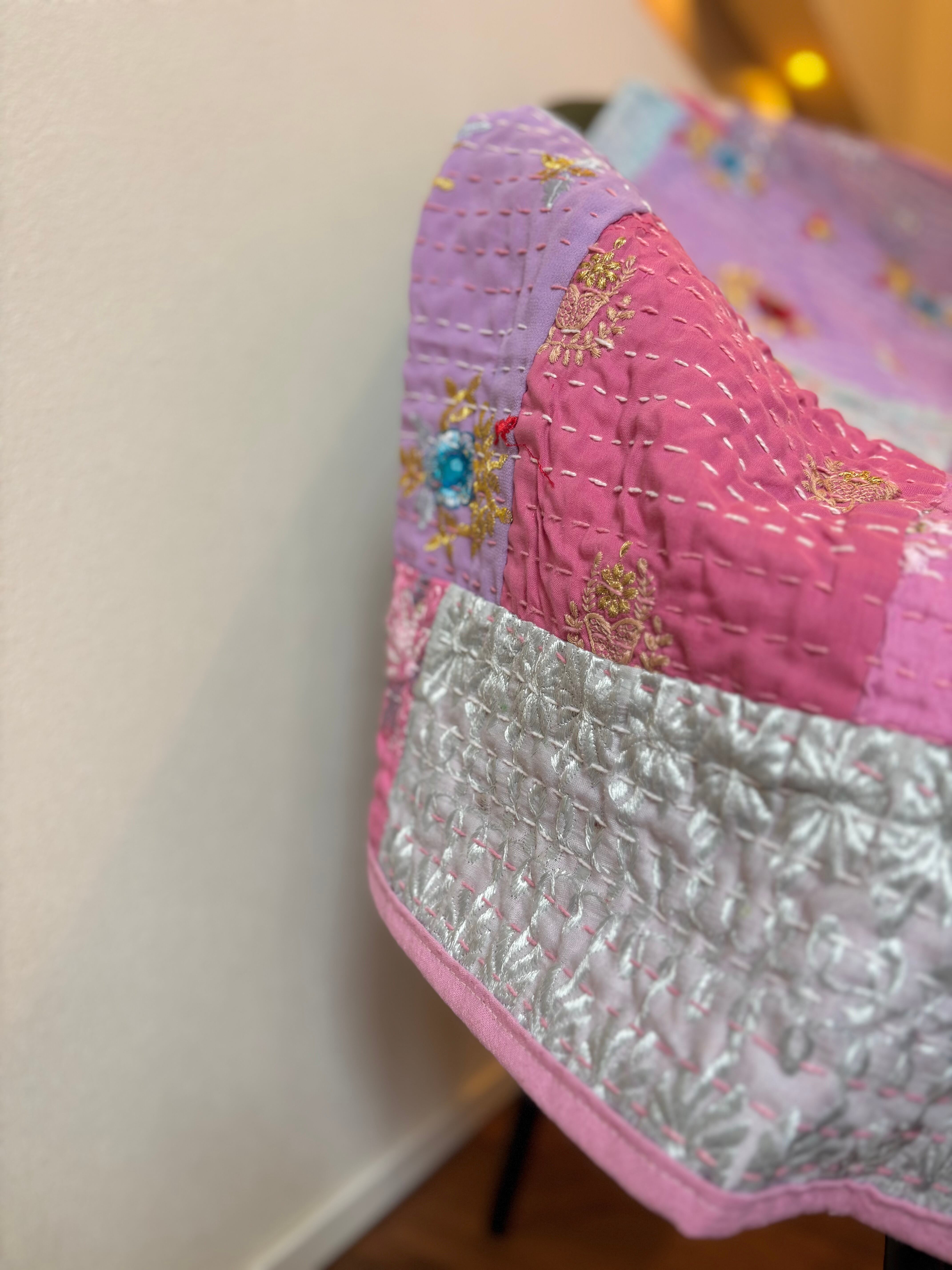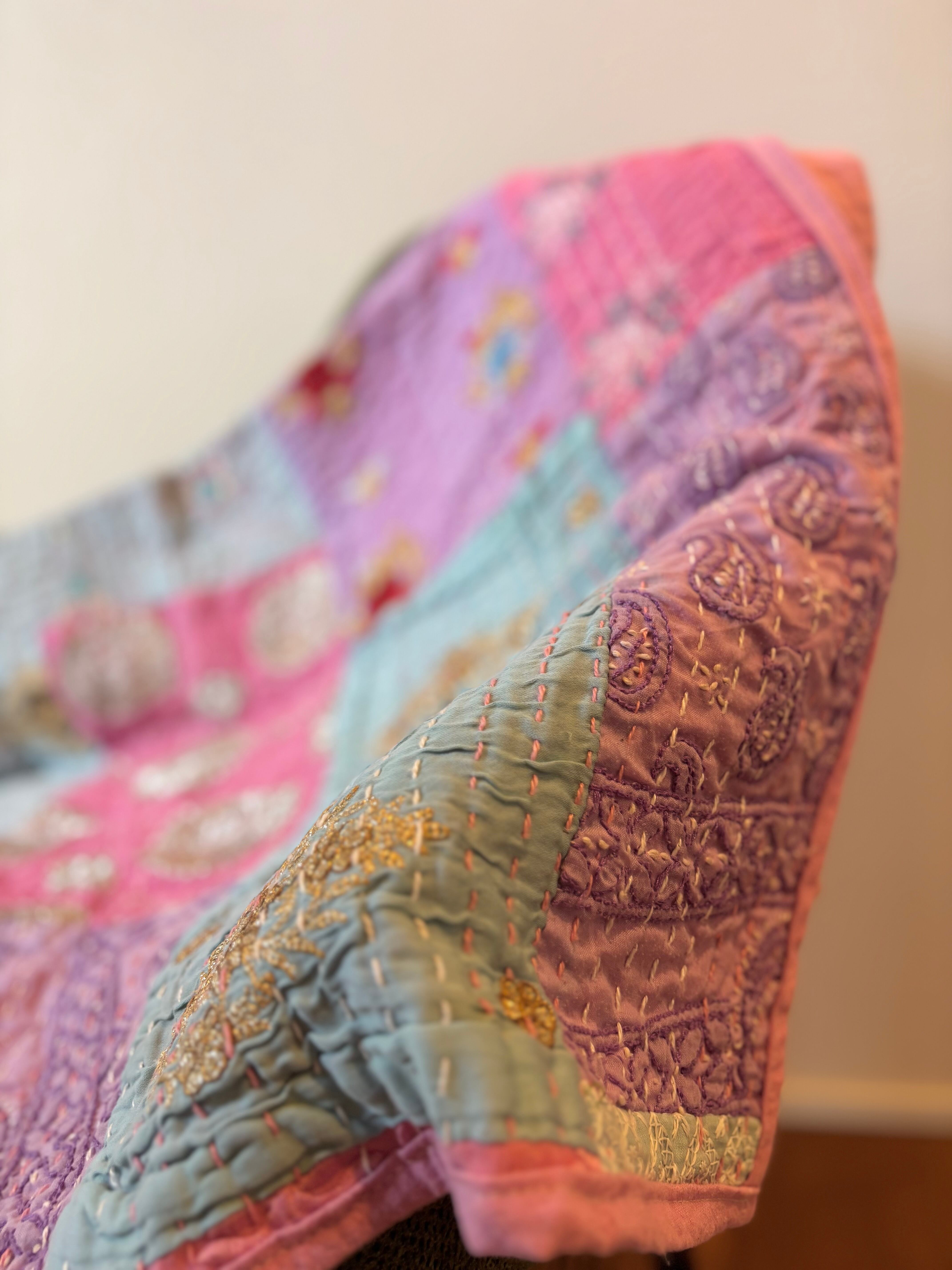 繋ぎ合わせたパッチワークキルトはとても華やか。