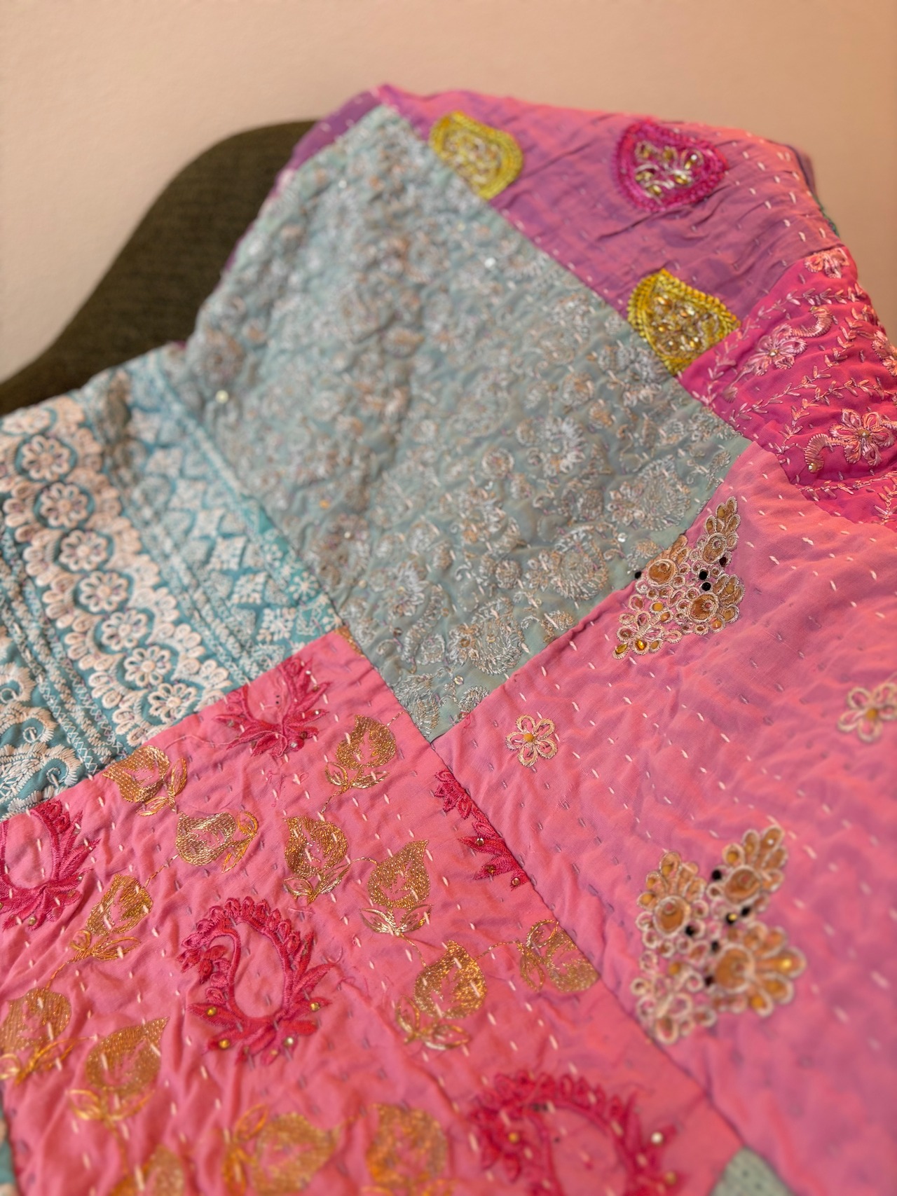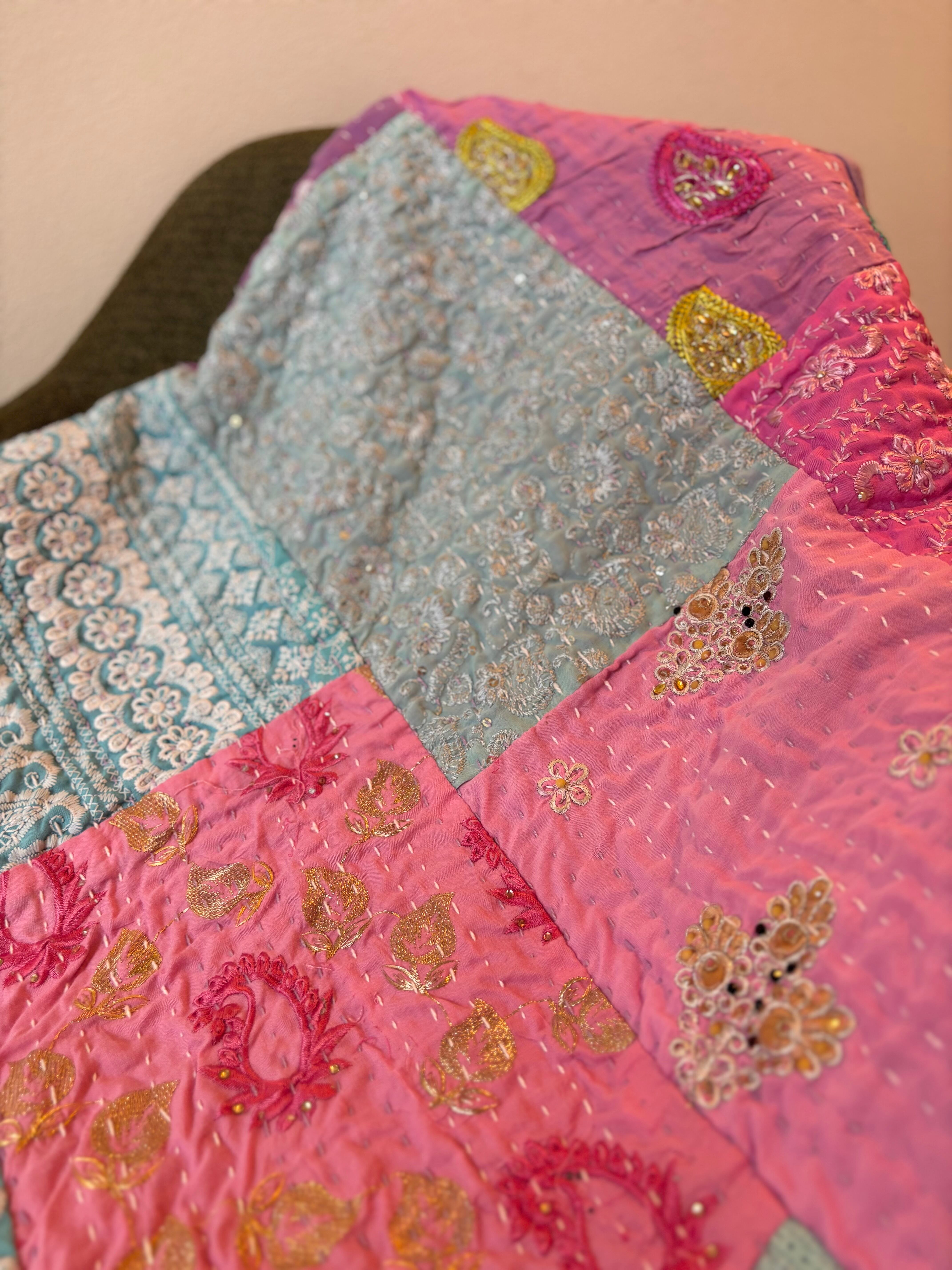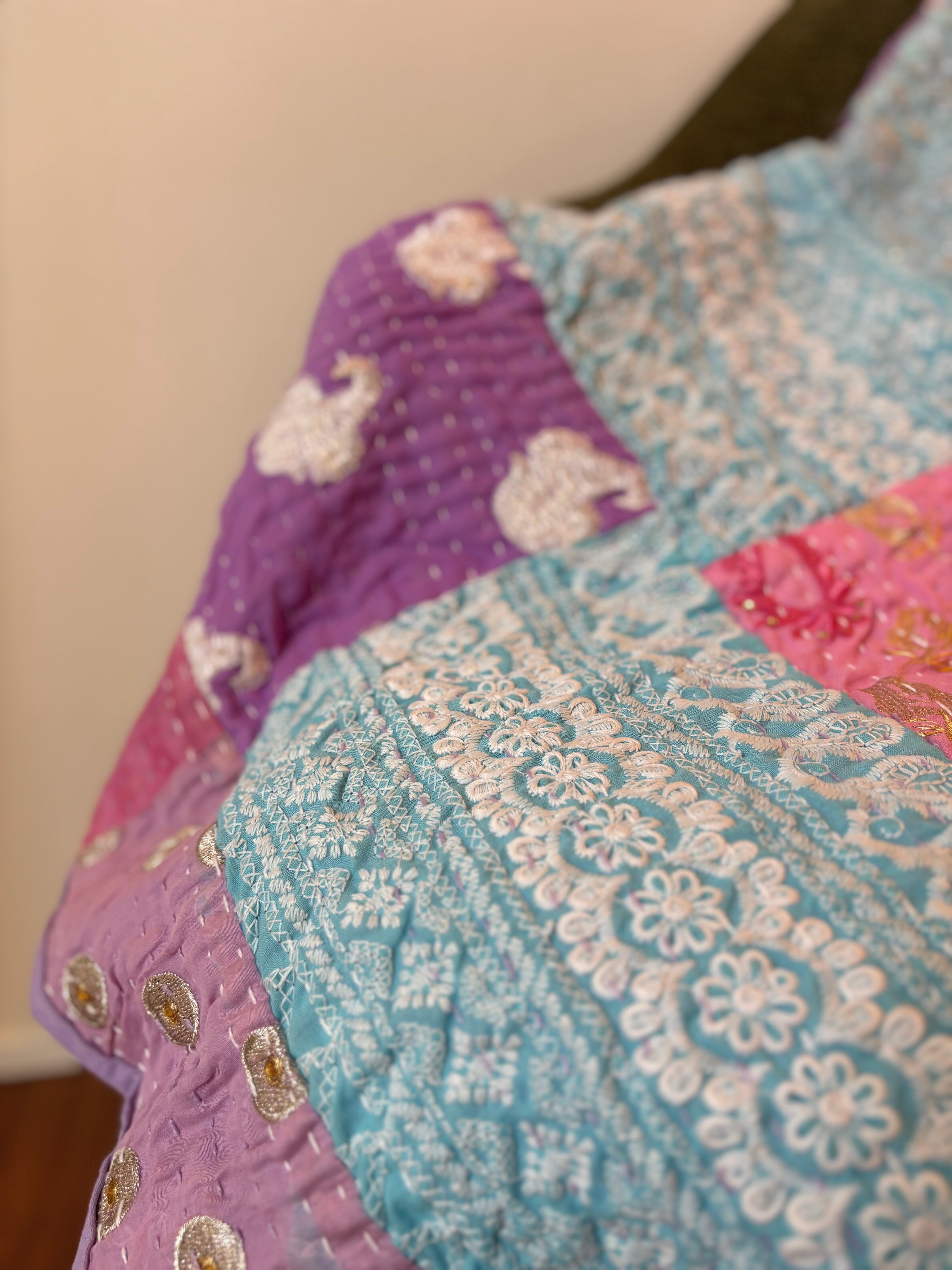 繋ぎ合わせたパッチワークキルトはとても華やか。