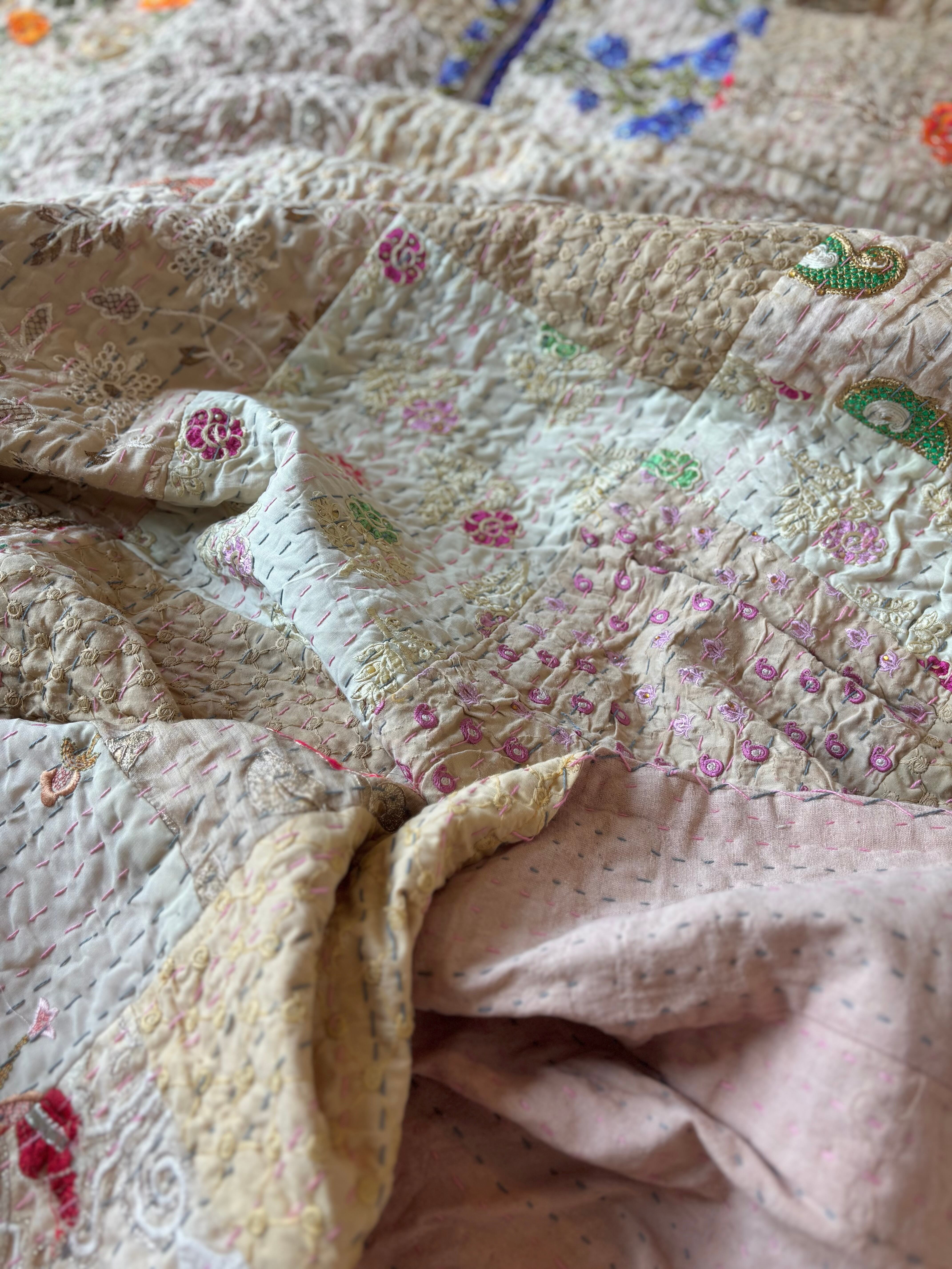 繋ぎ合わせたパッチワークキルトはとても華やか。