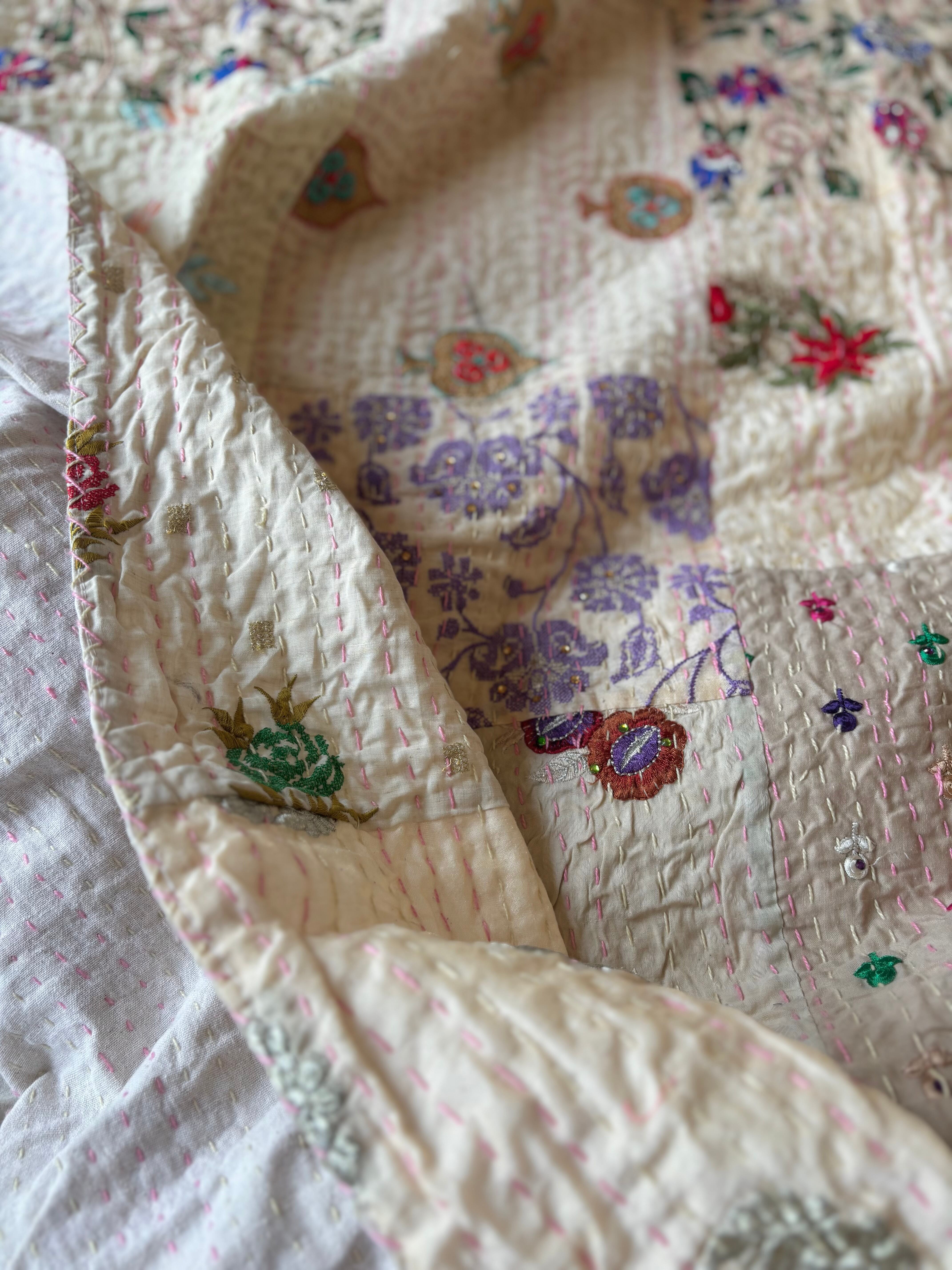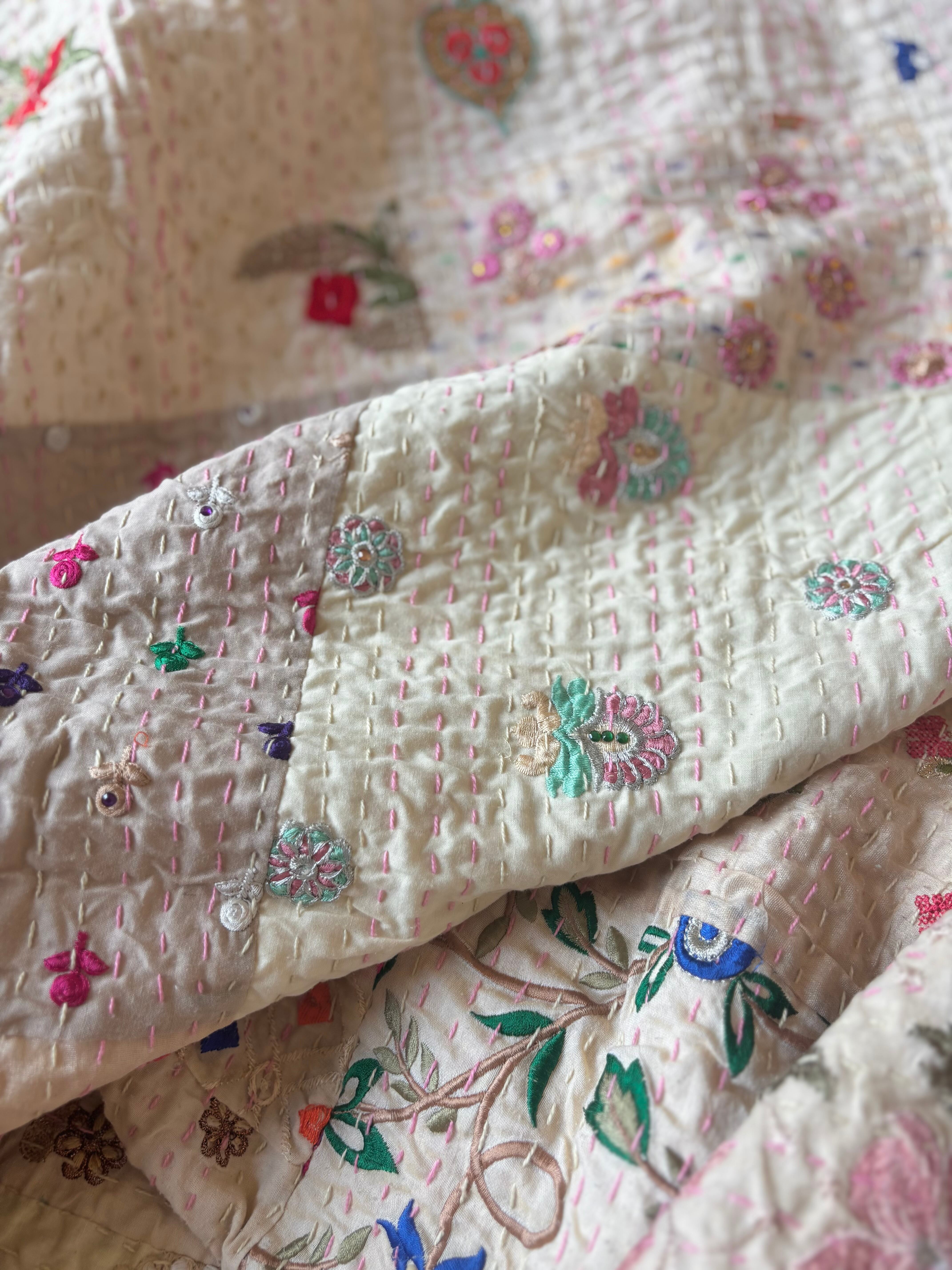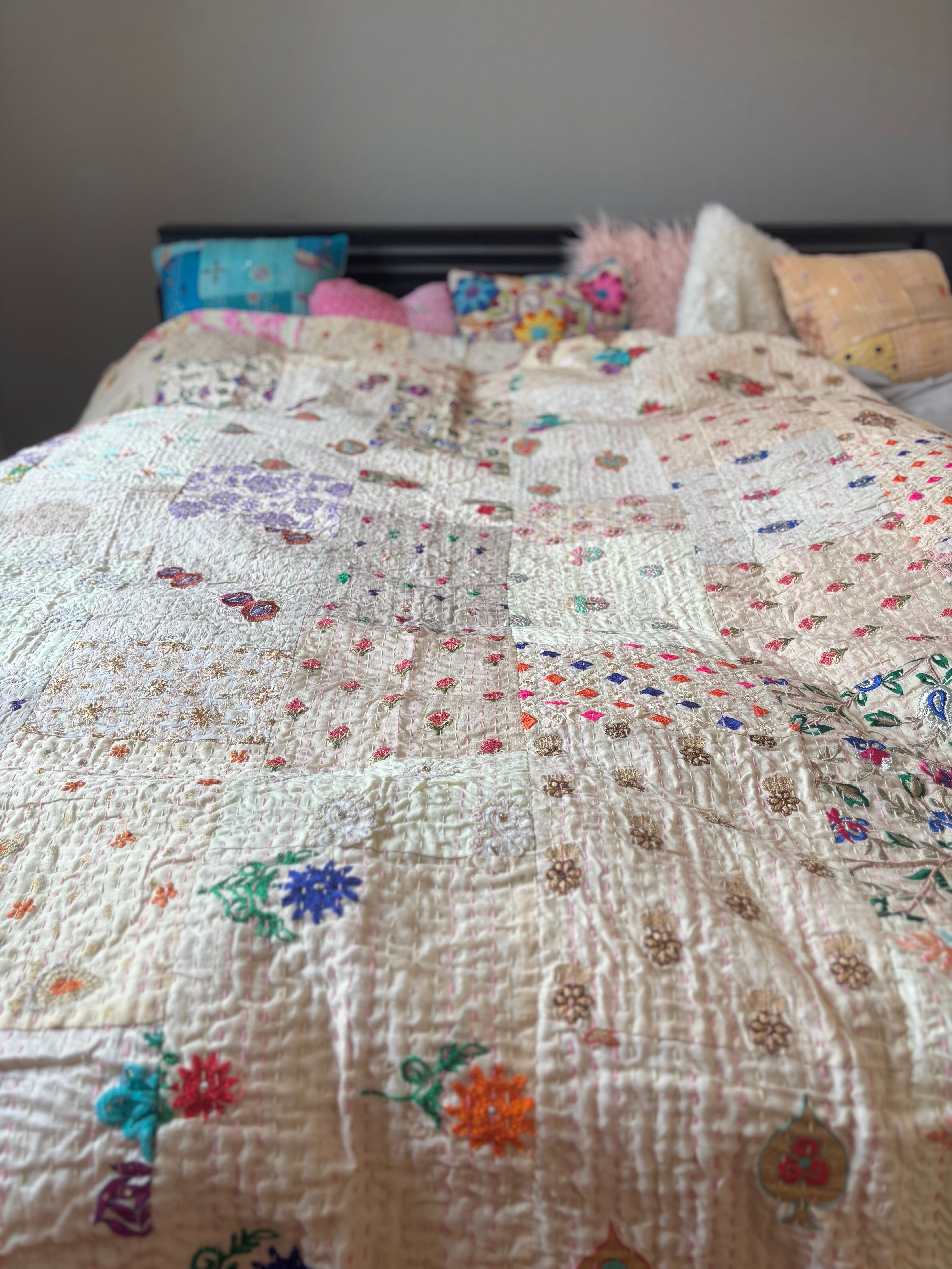 繋ぎ合わせたパッチワークキルトはとても華やか。