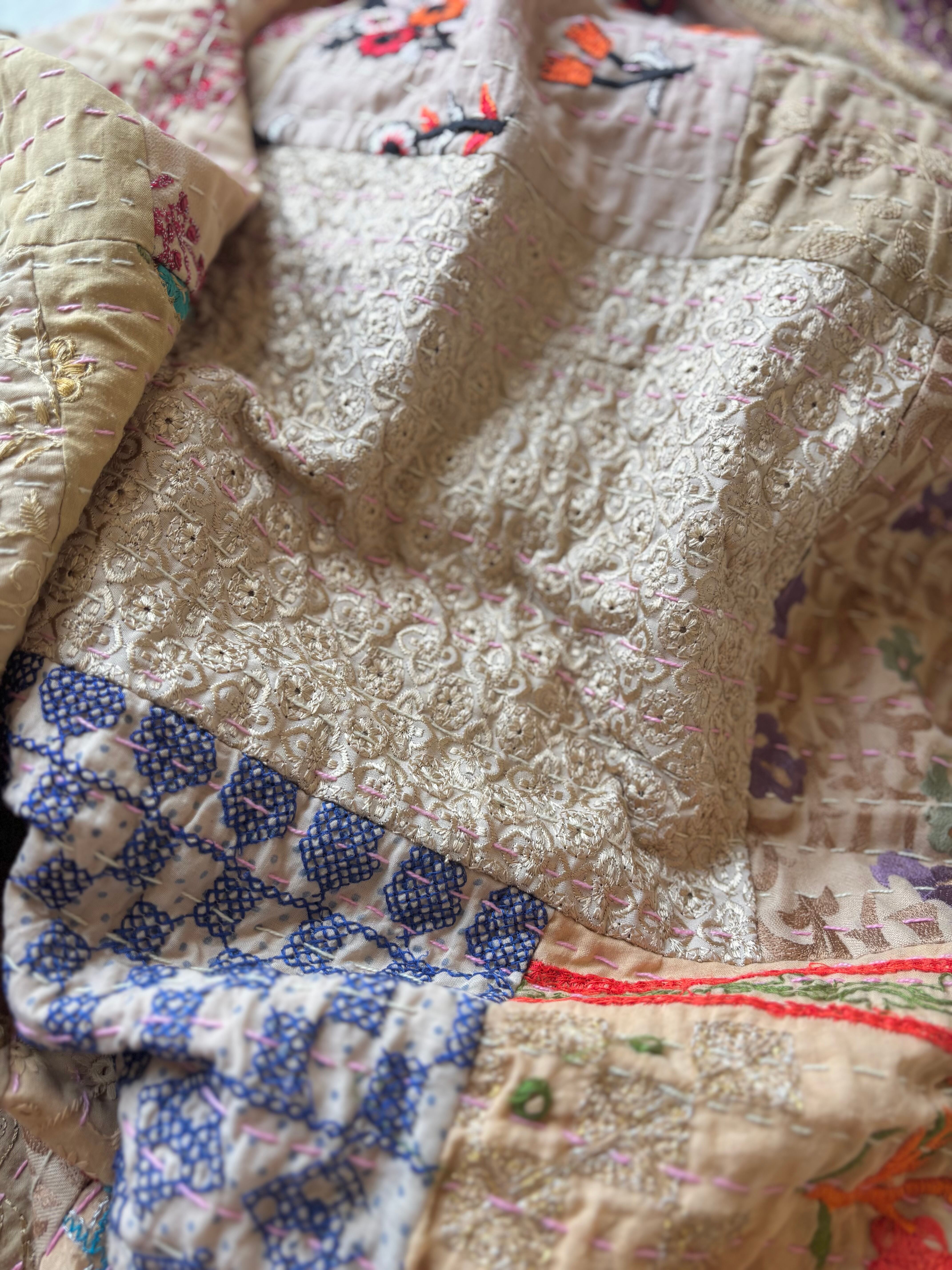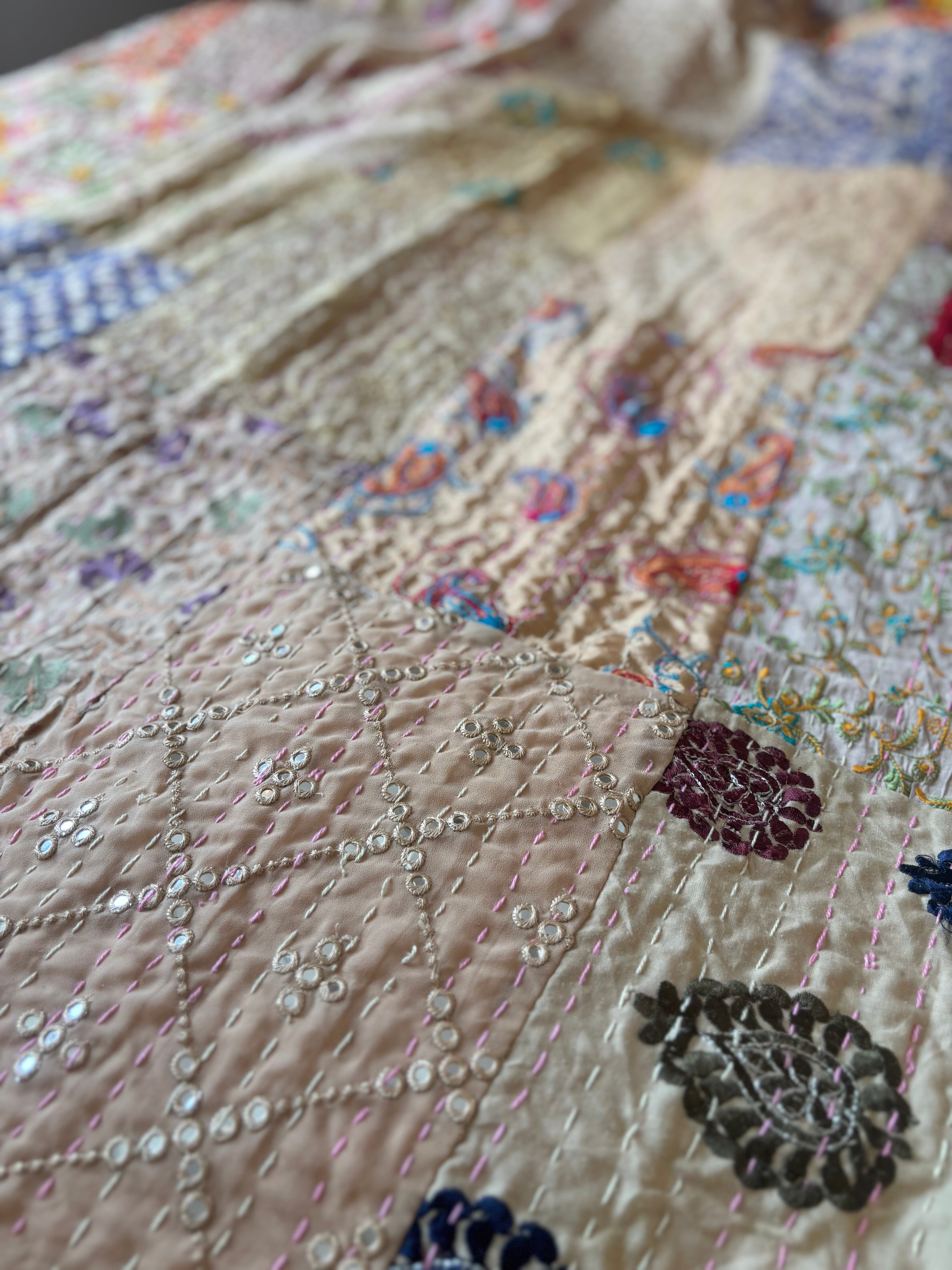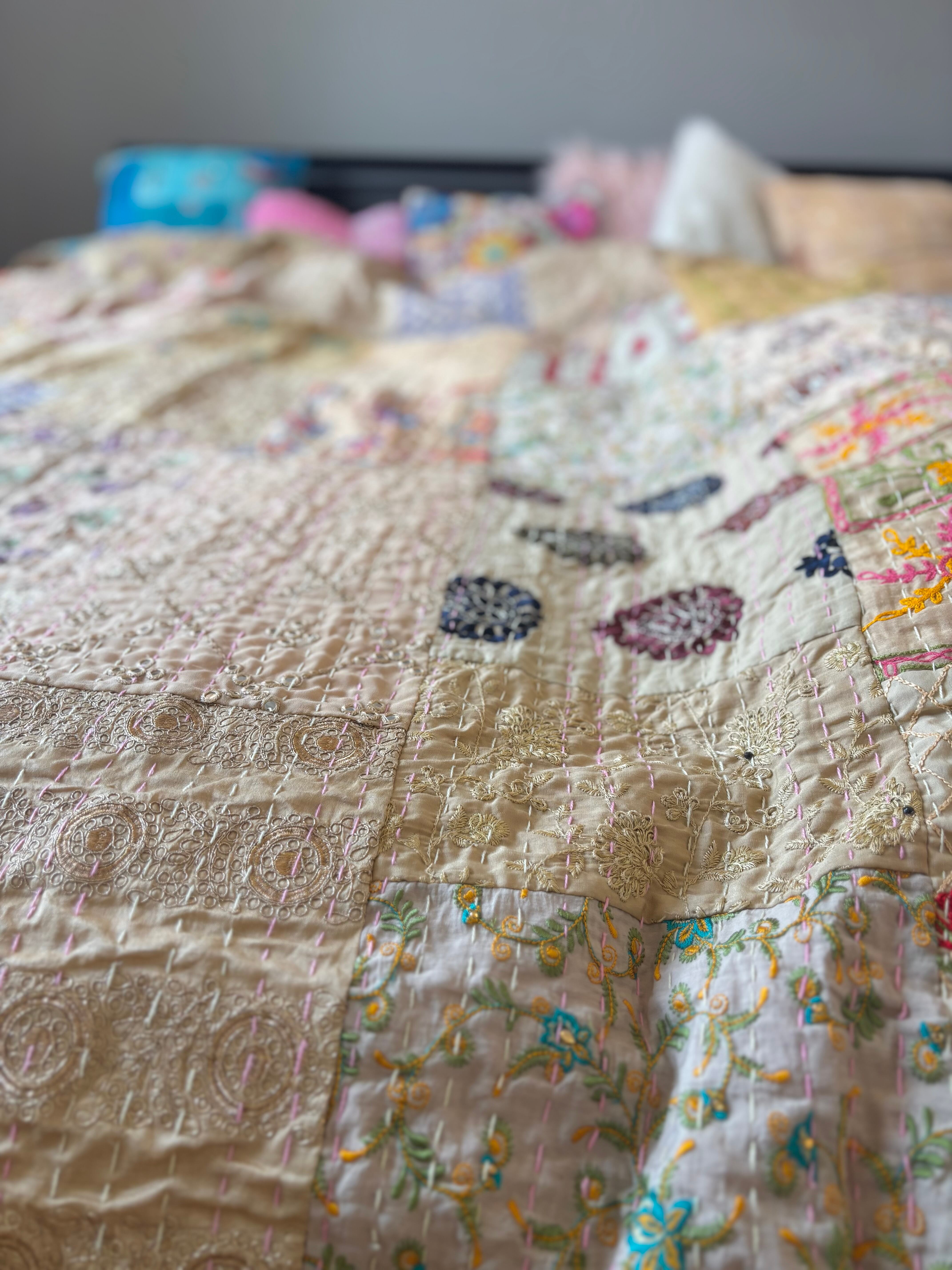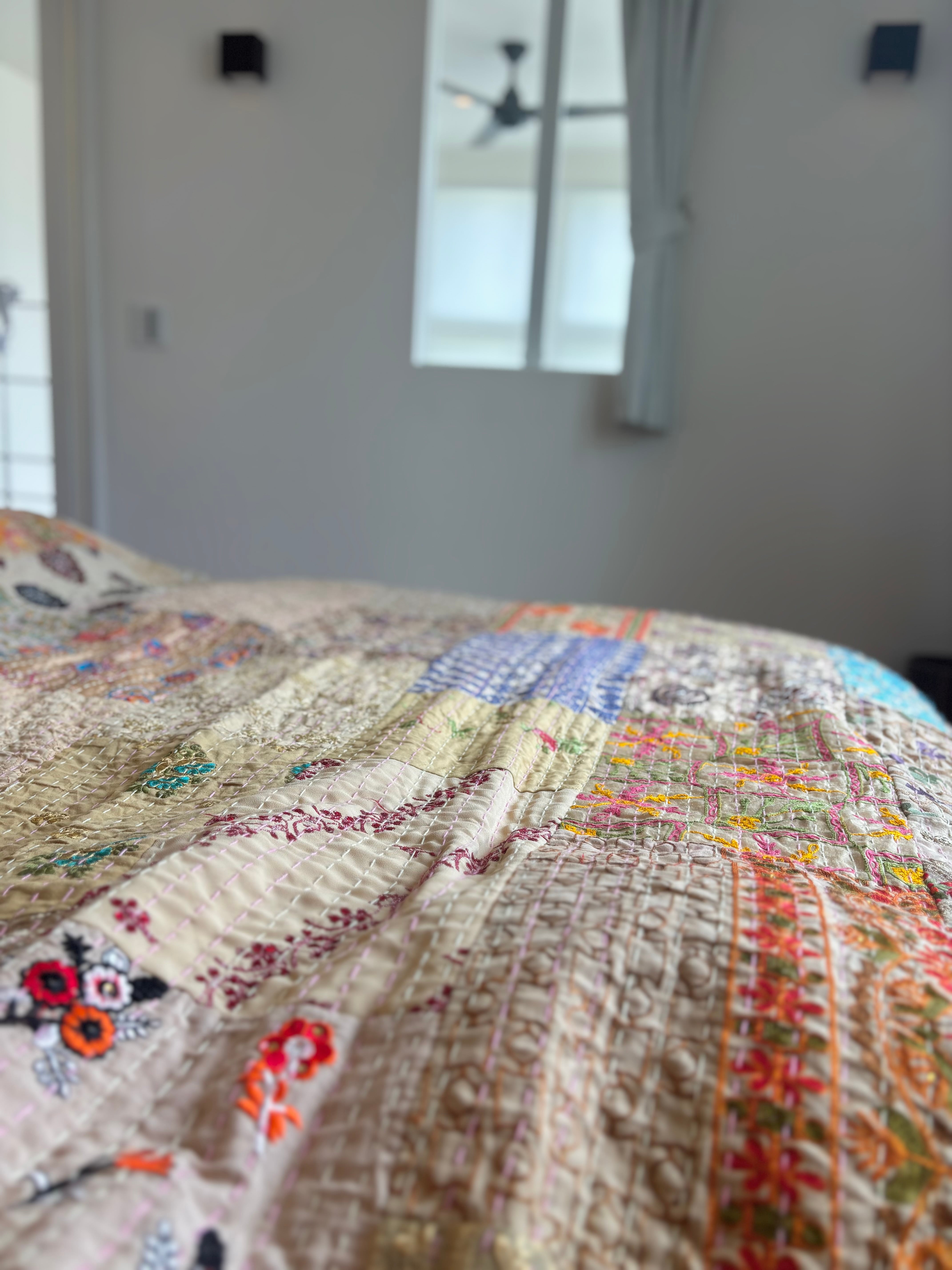 繋ぎ合わせたパッチワークキルトはとても華やか。
