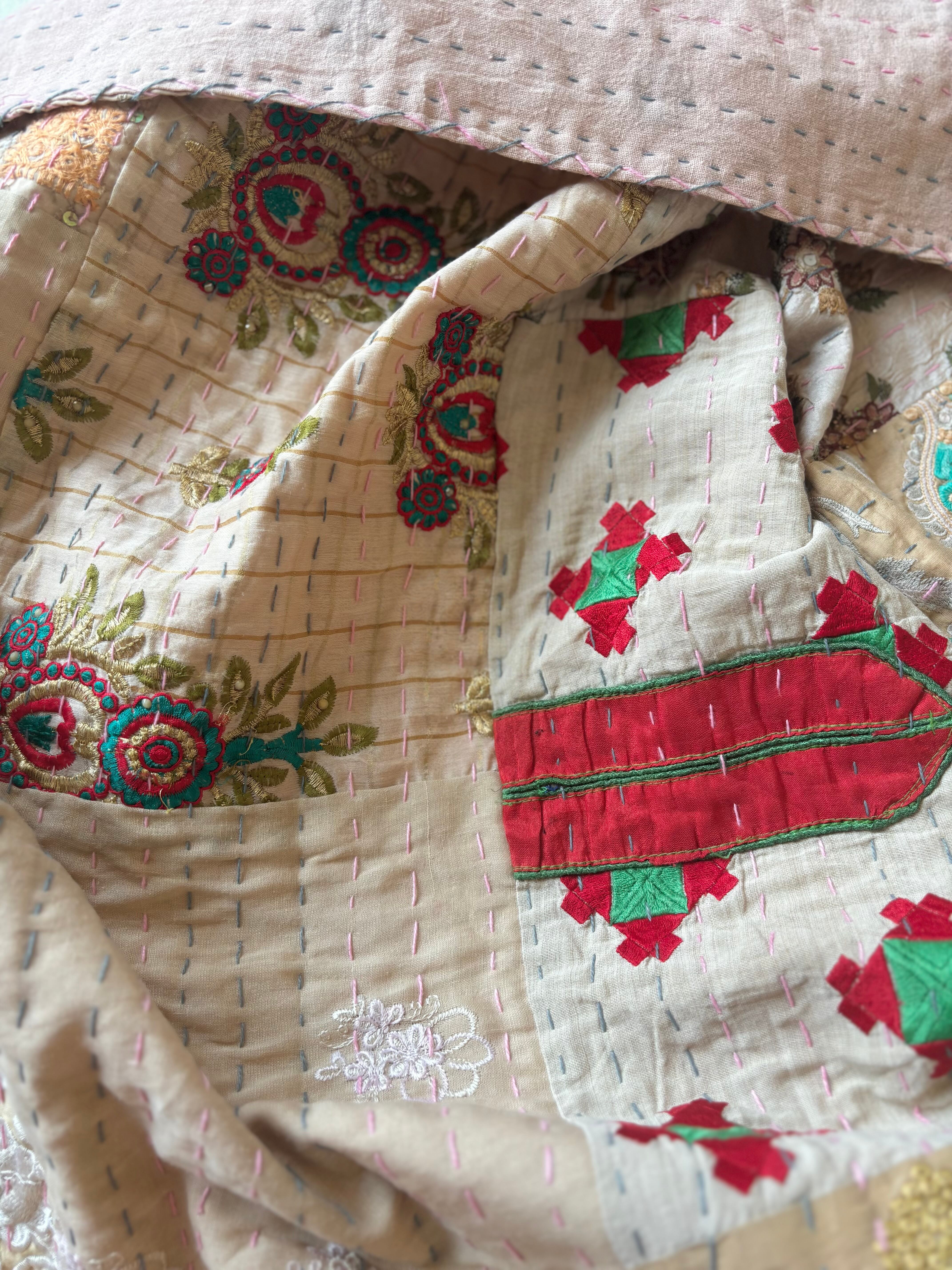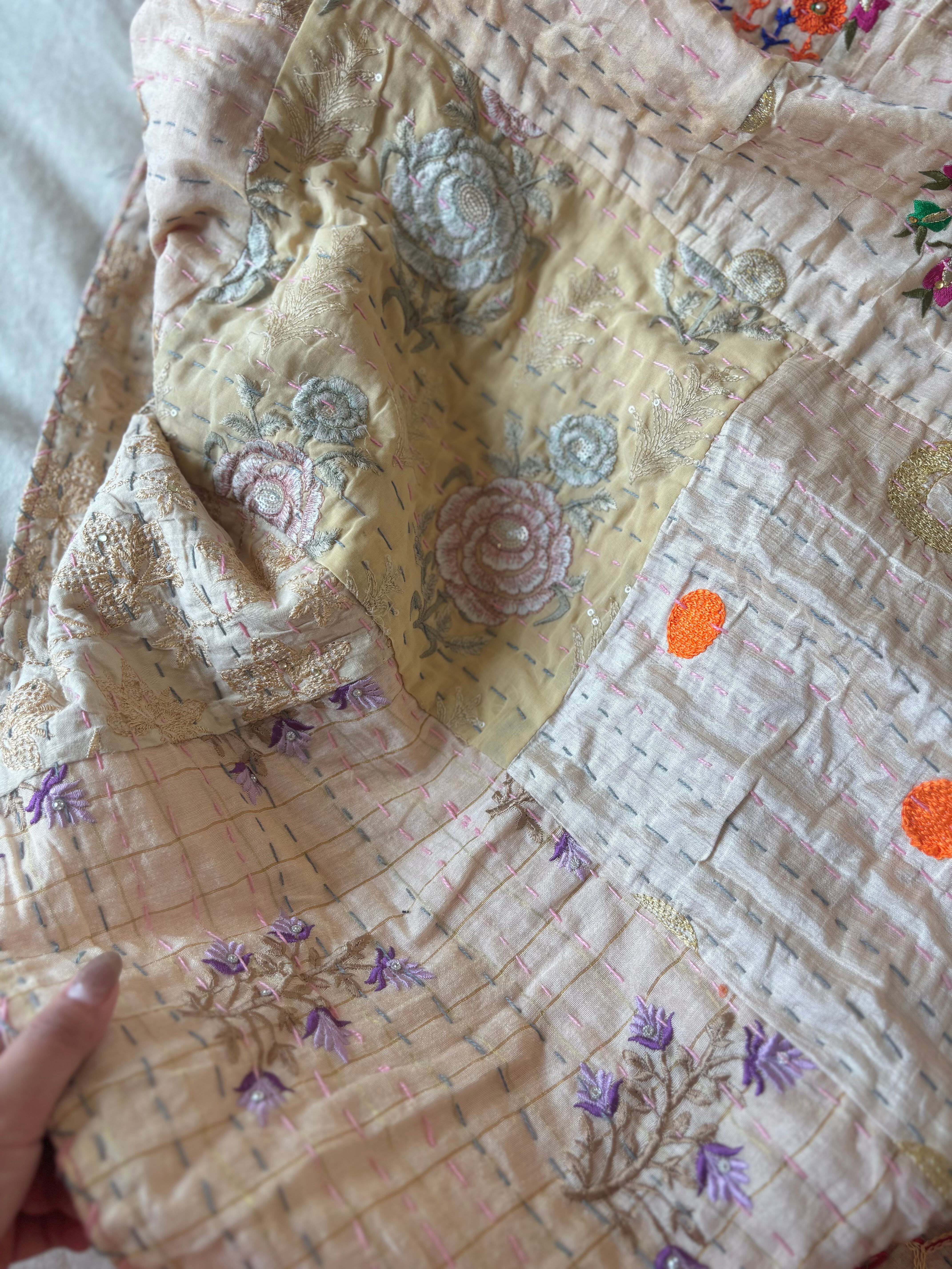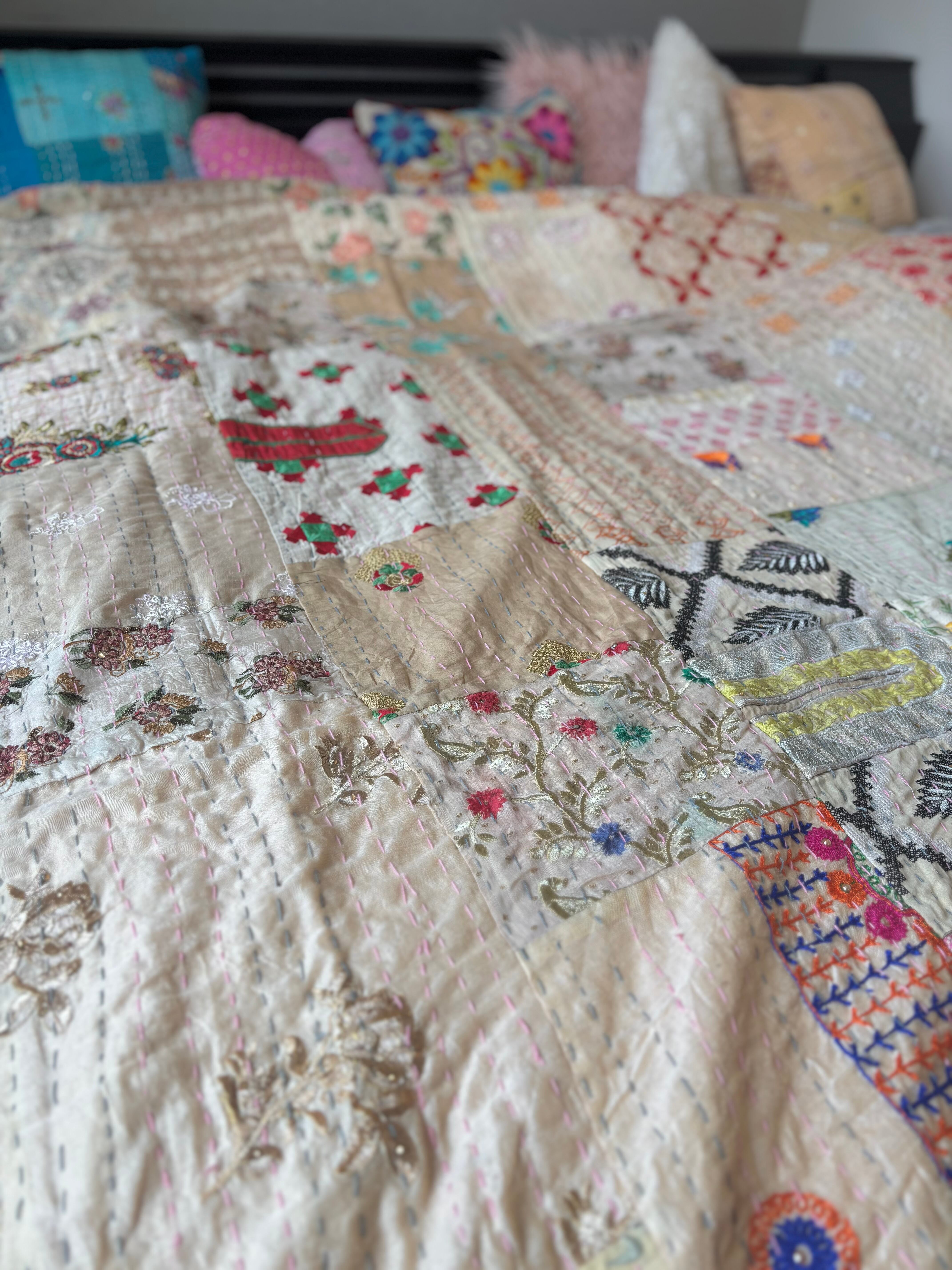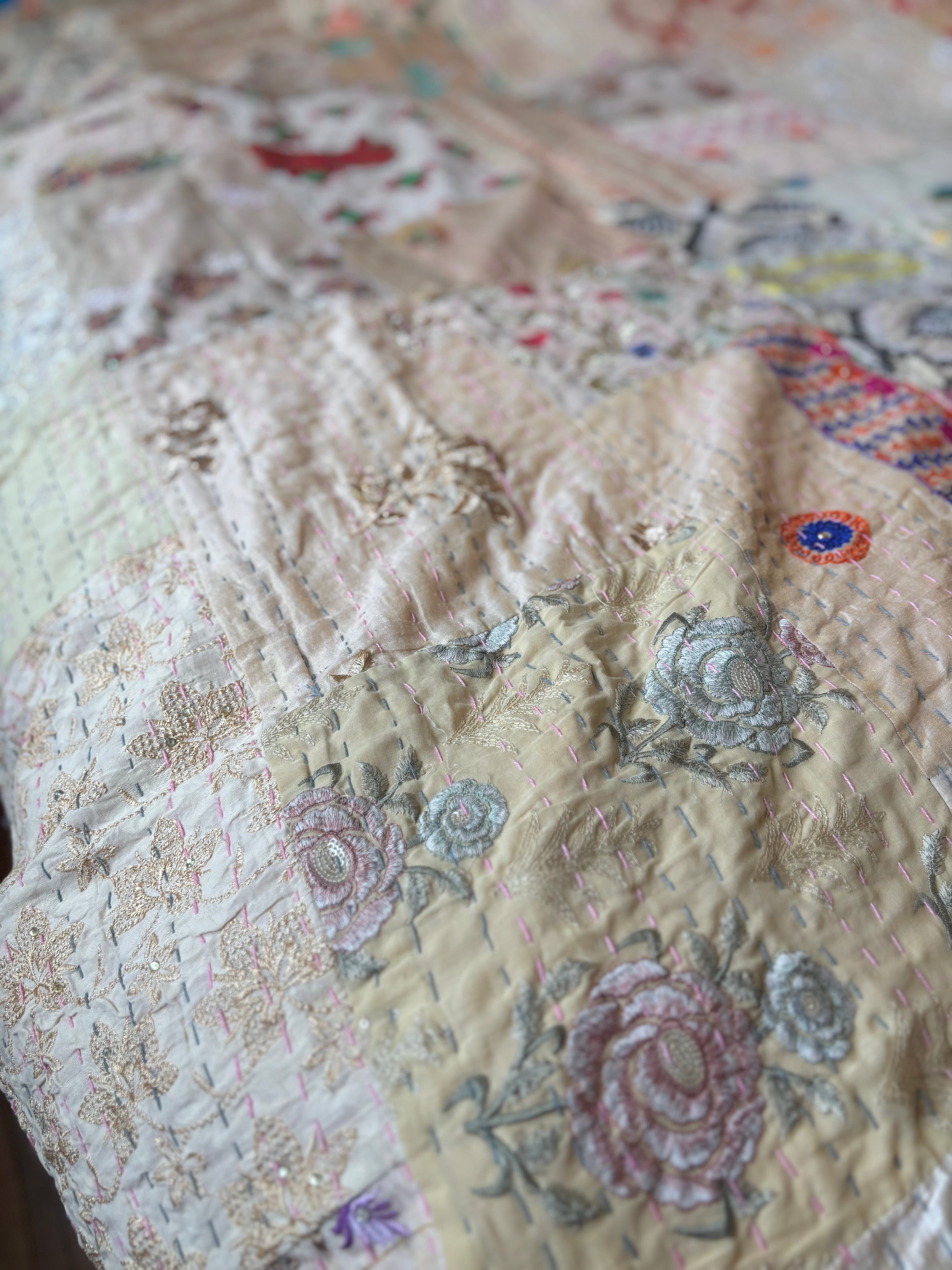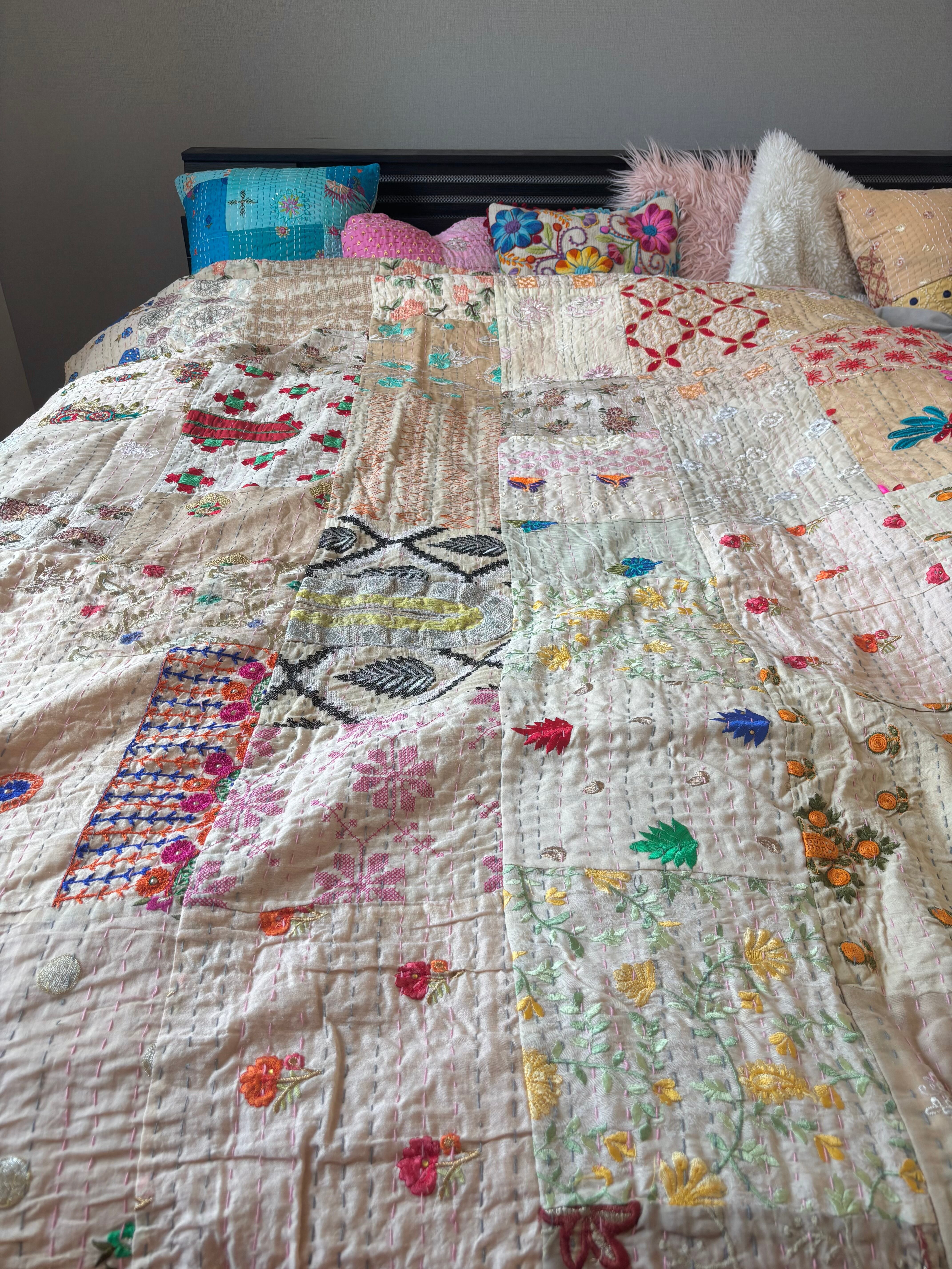 繋ぎ合わせたパッチワークキルトはとても華やか。