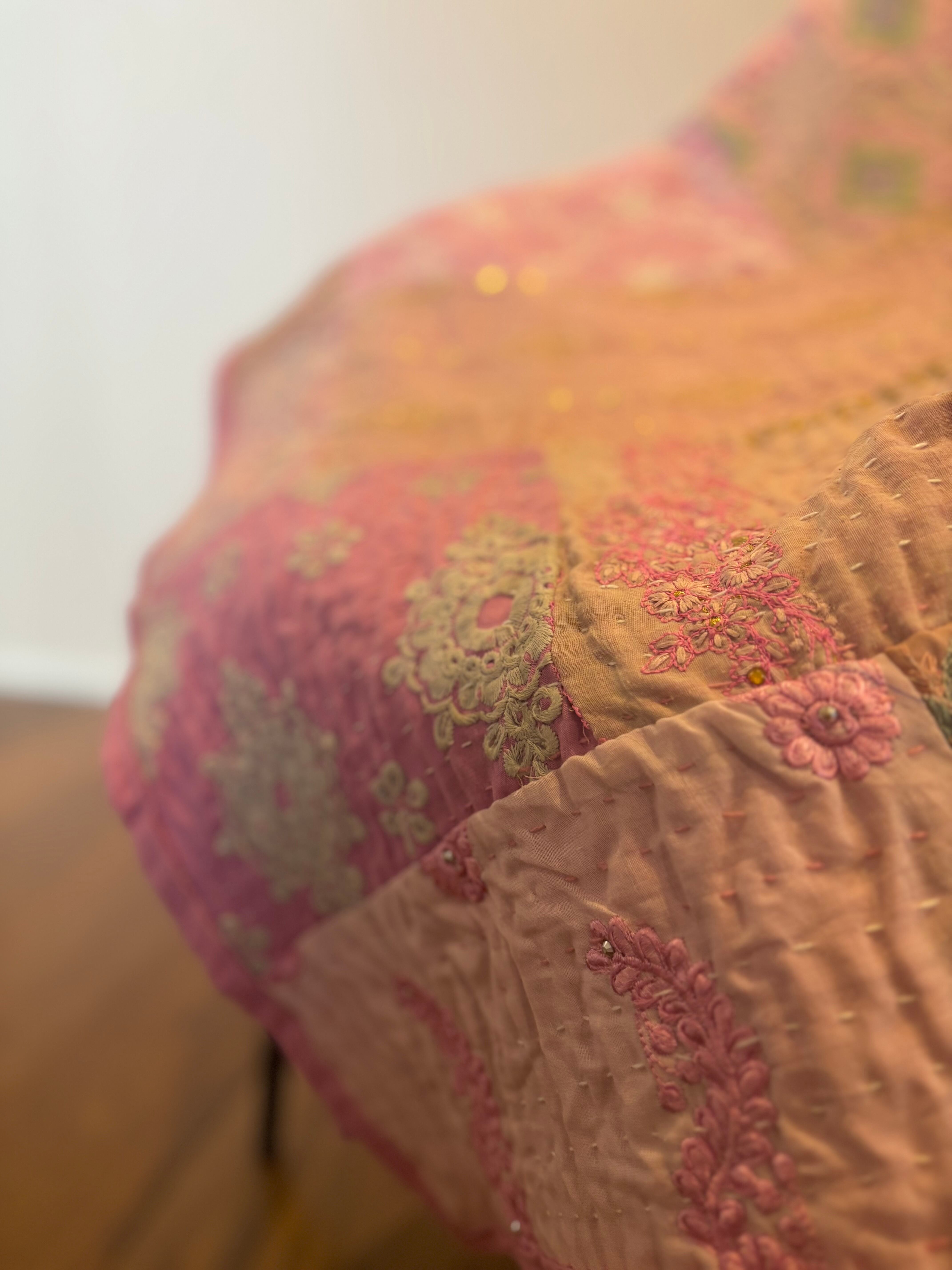 繋ぎ合わせたパッチワークキルトはとても華やか。