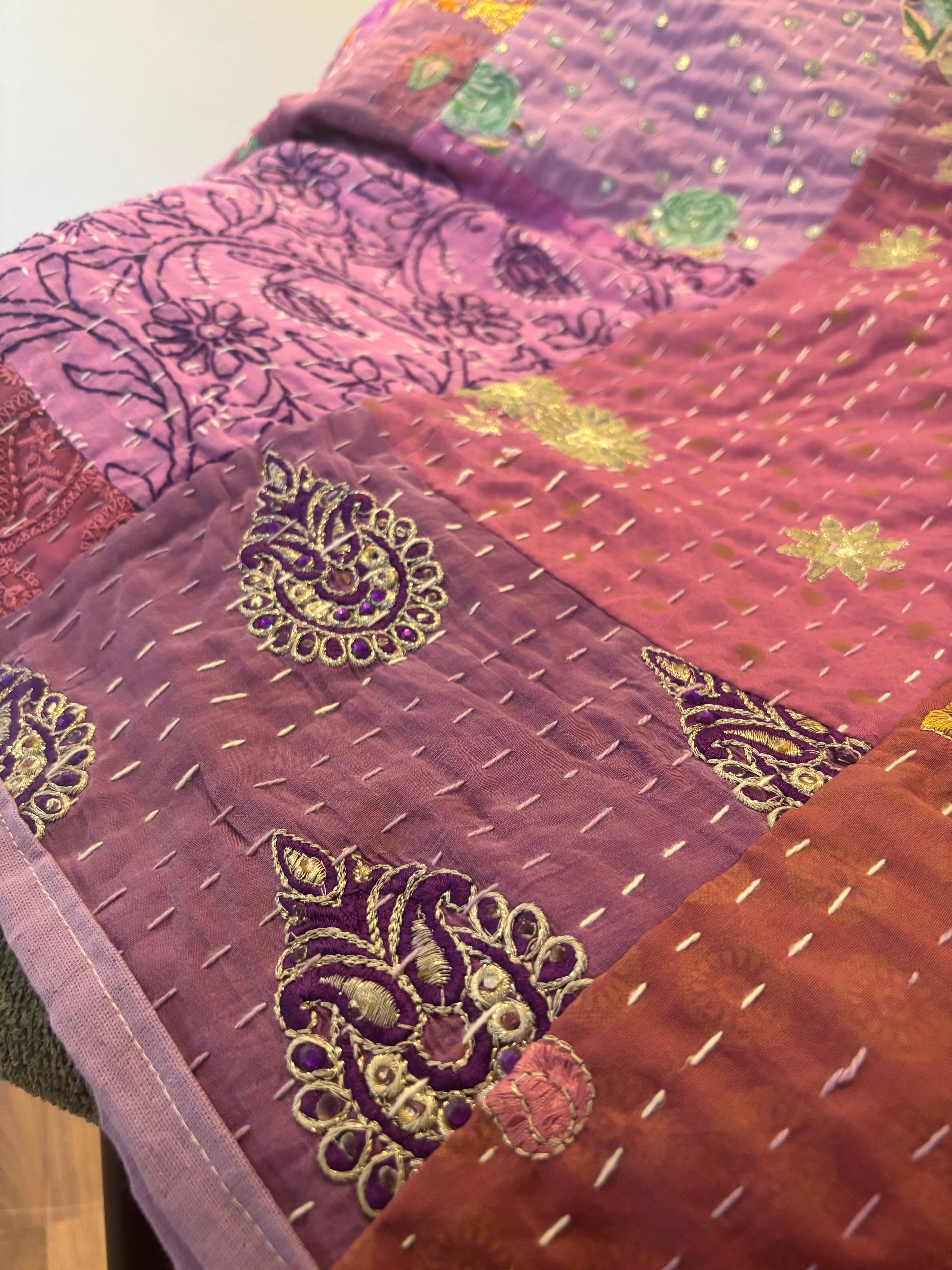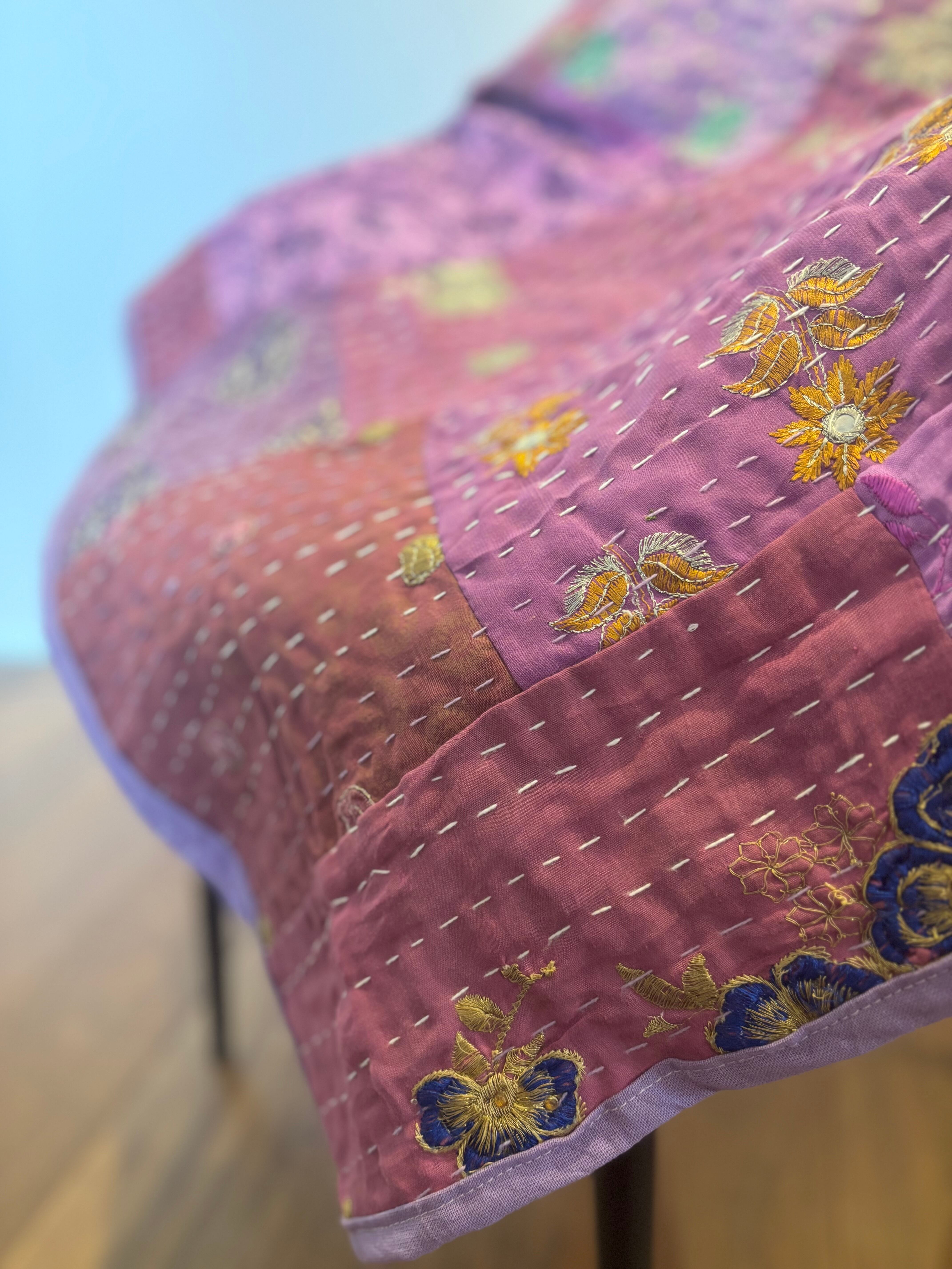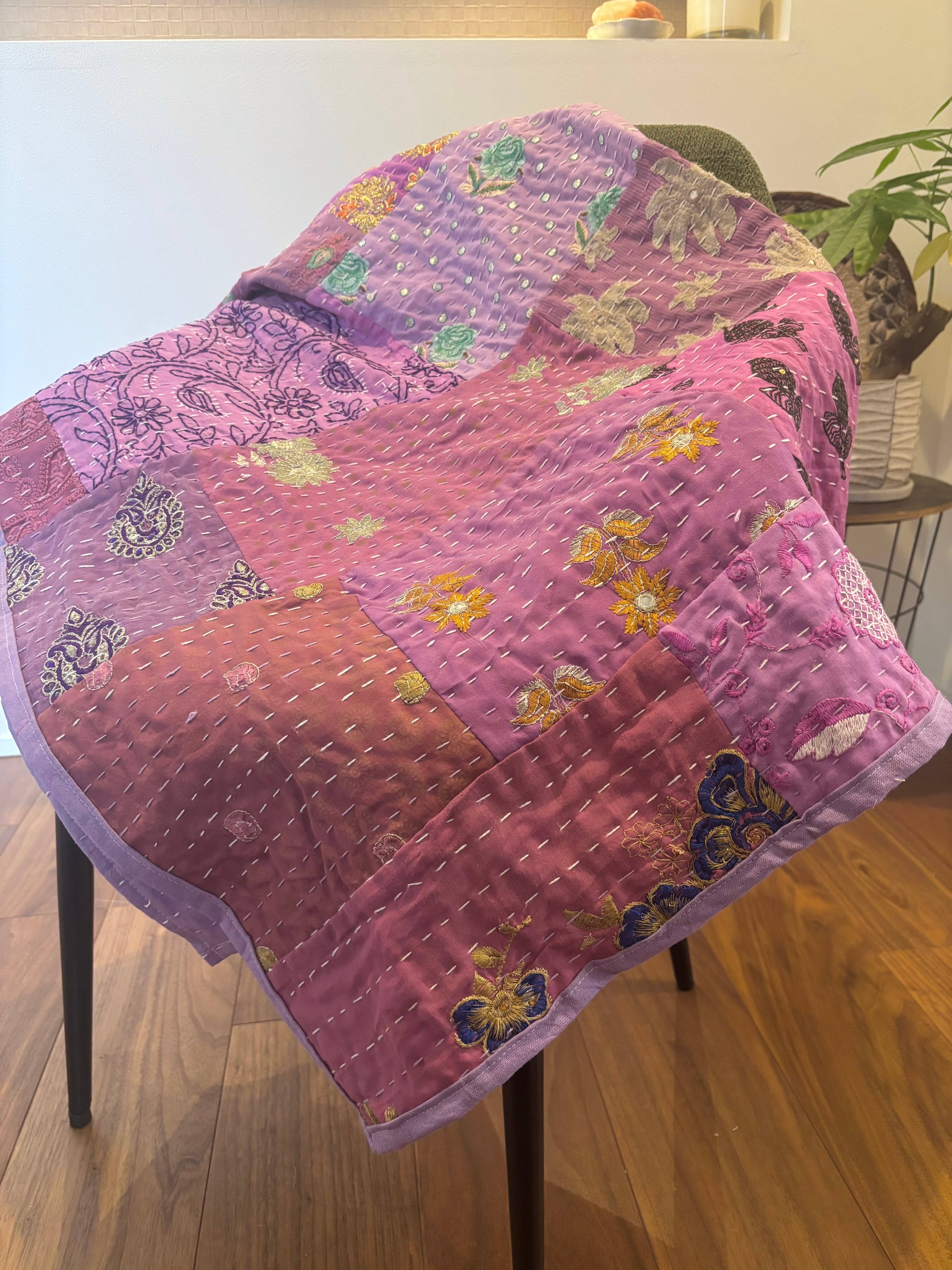 繋ぎ合わせたパッチワークキルトはとても華やか。
