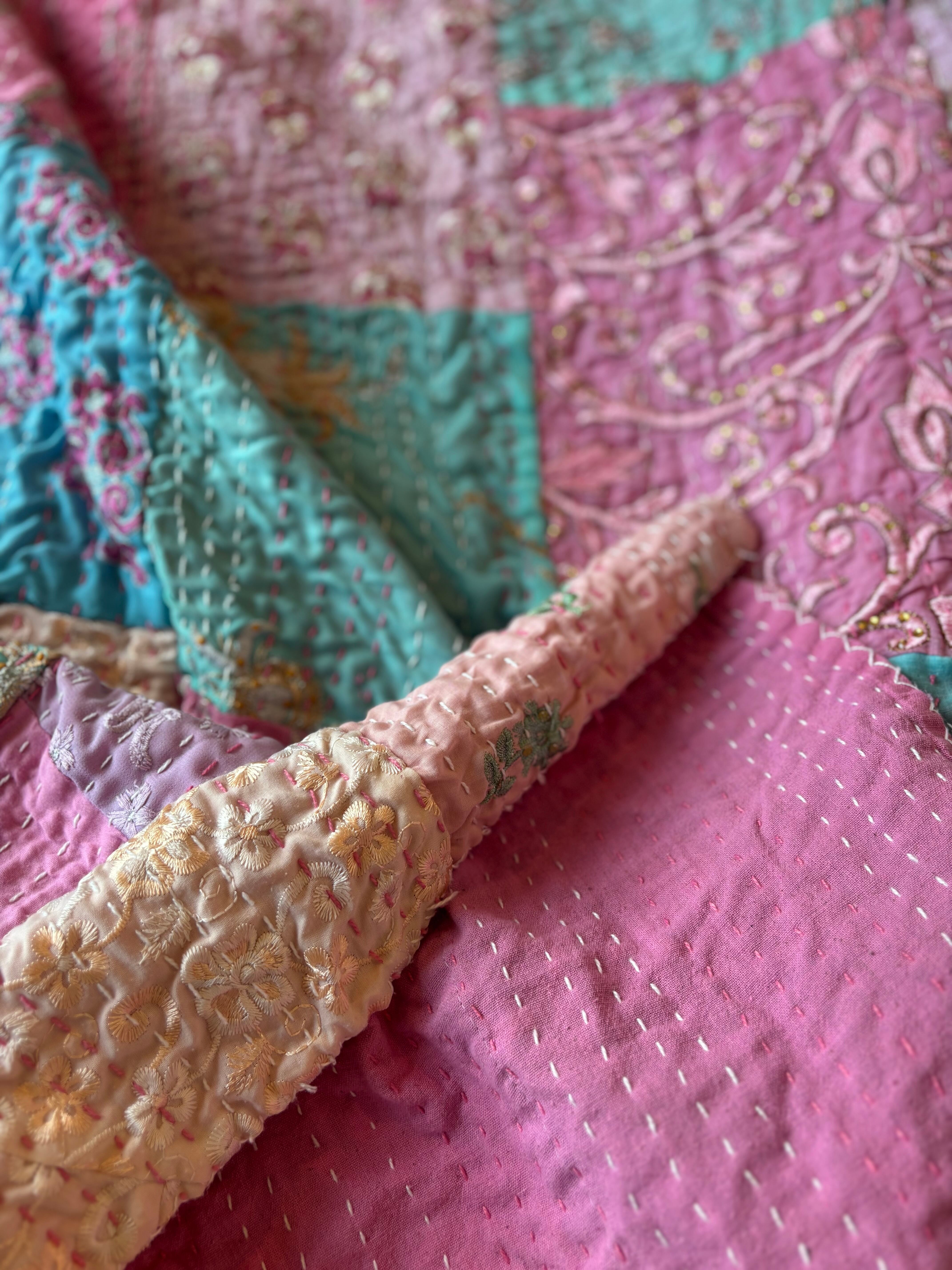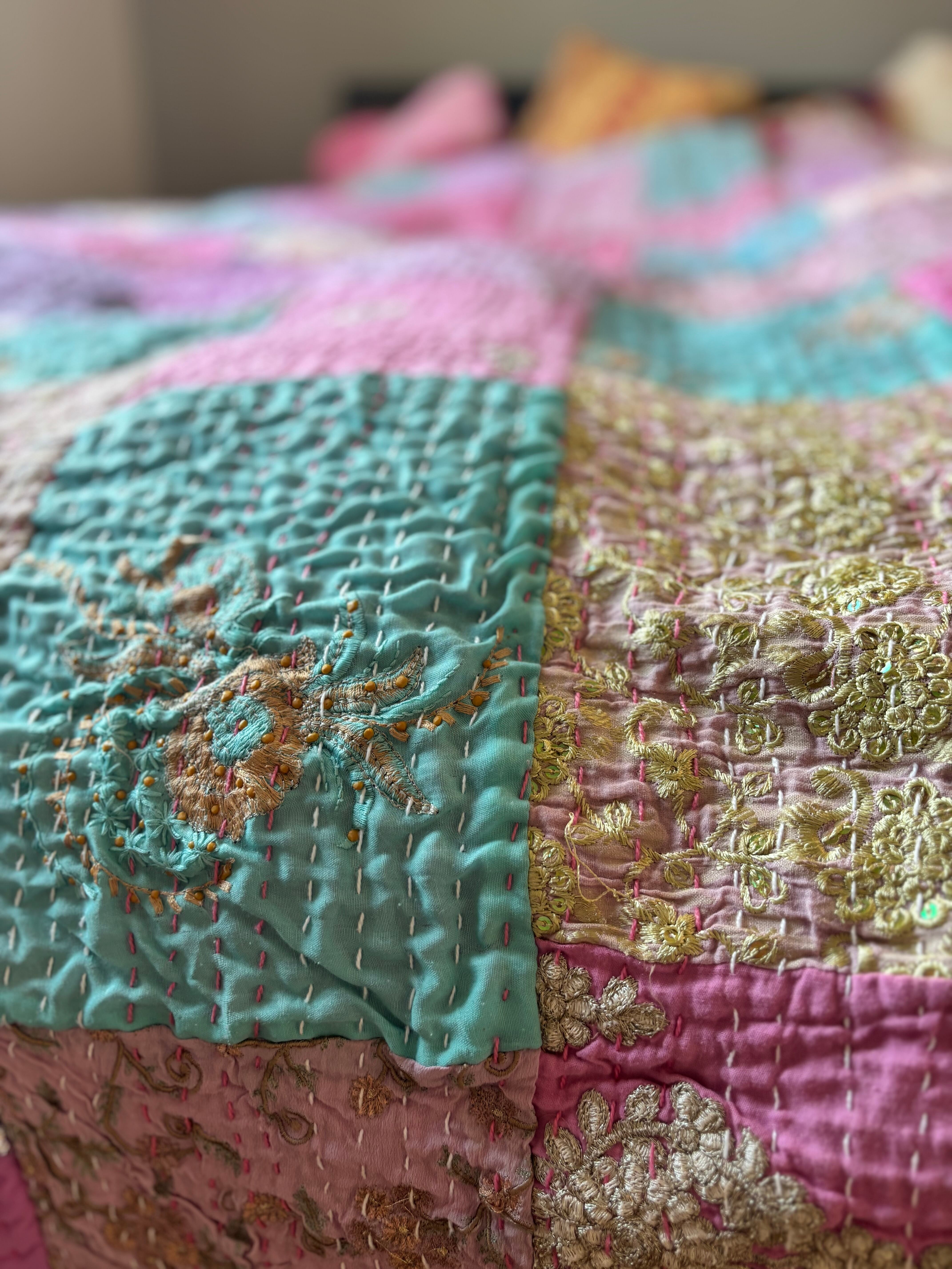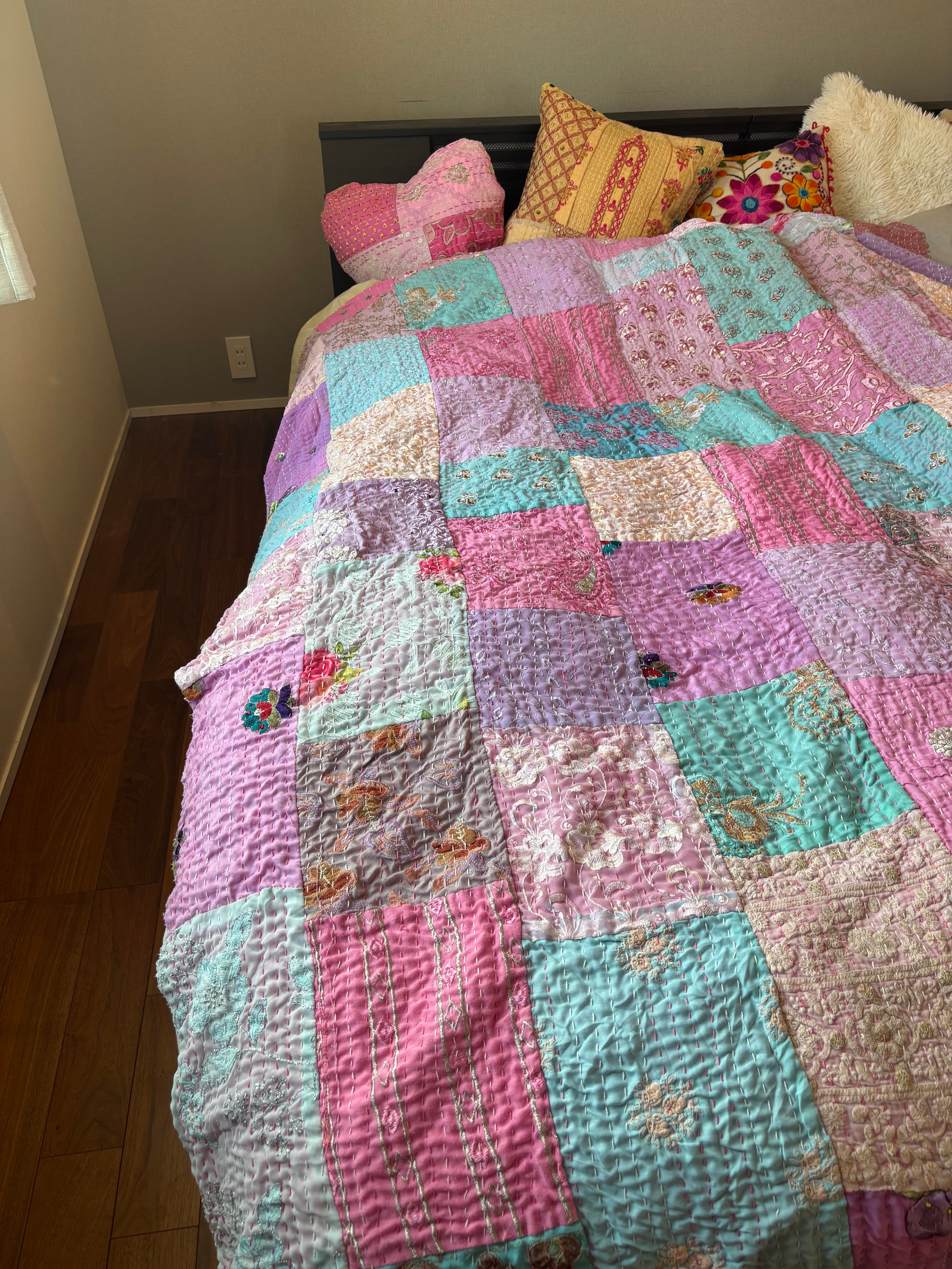 繋ぎ合わせたパッチワークキルトはとても華やか。