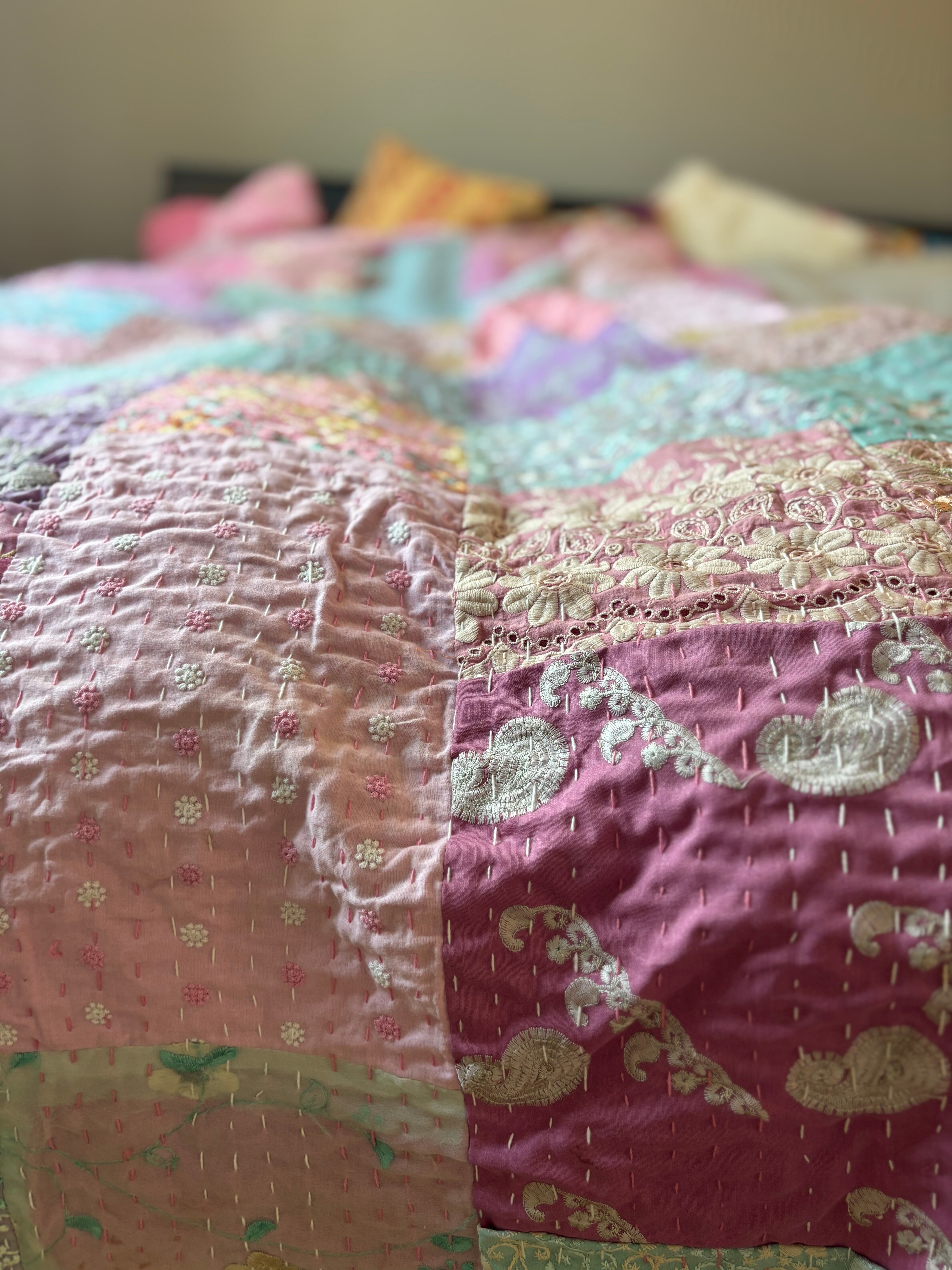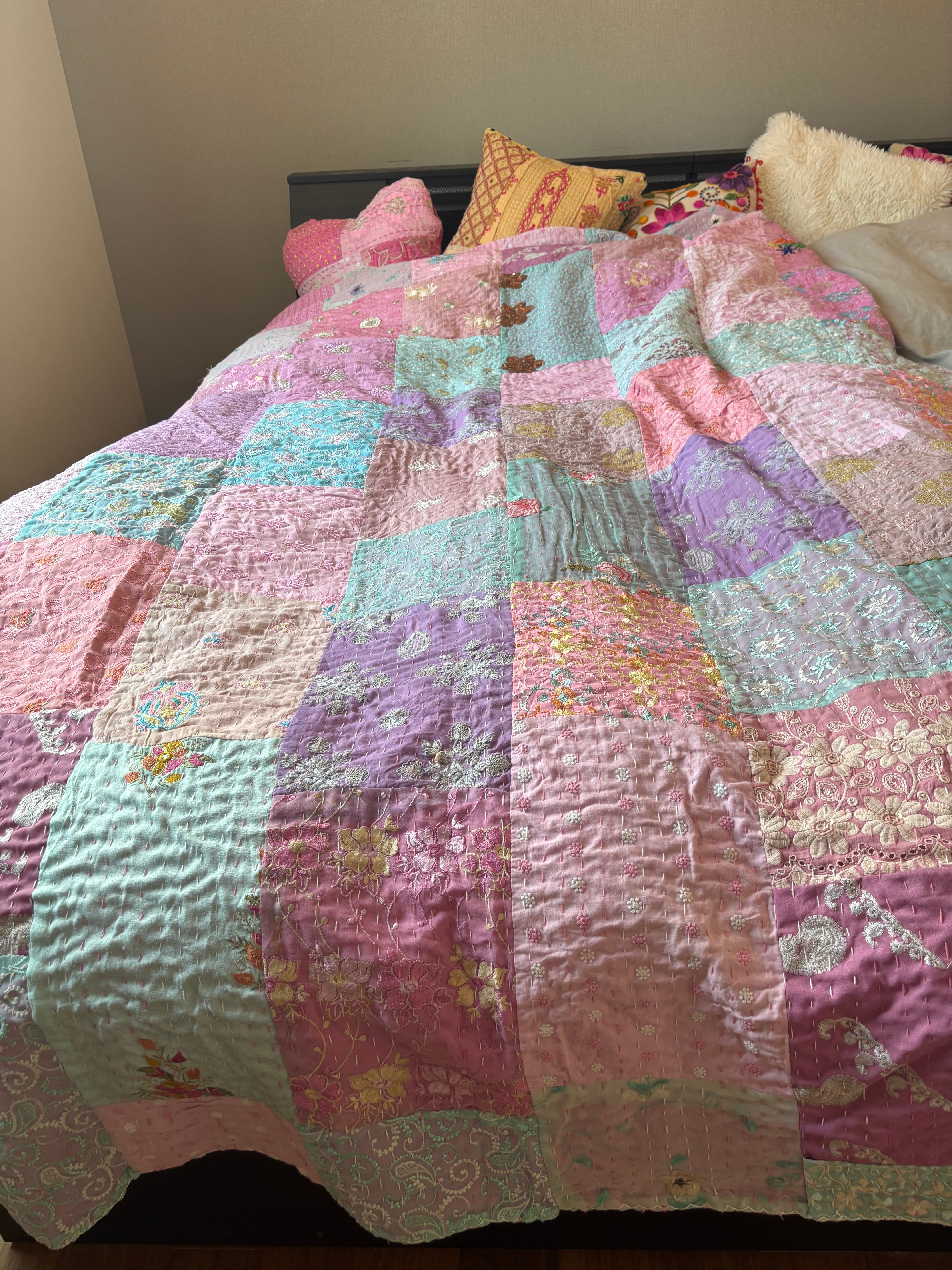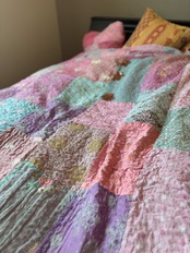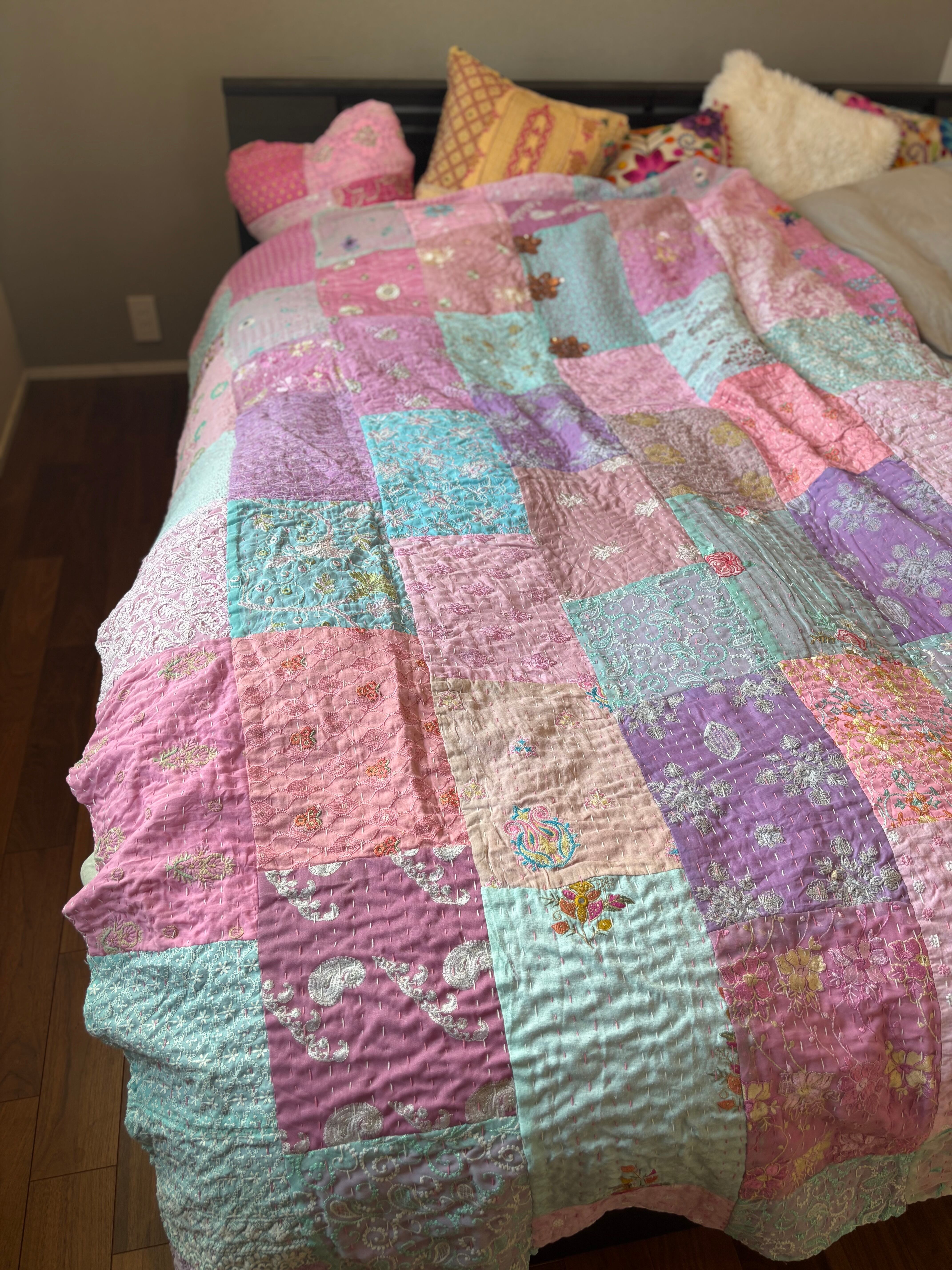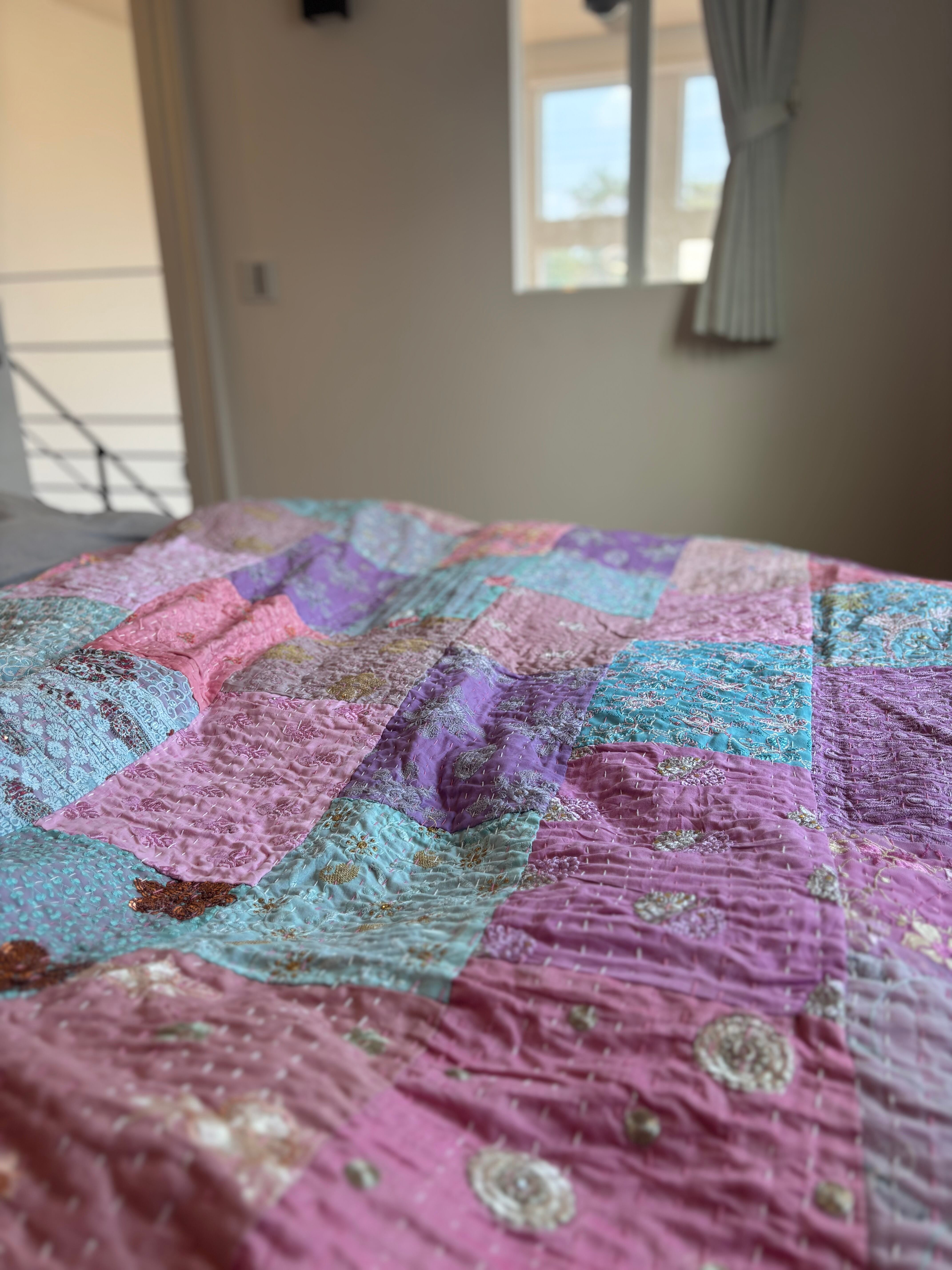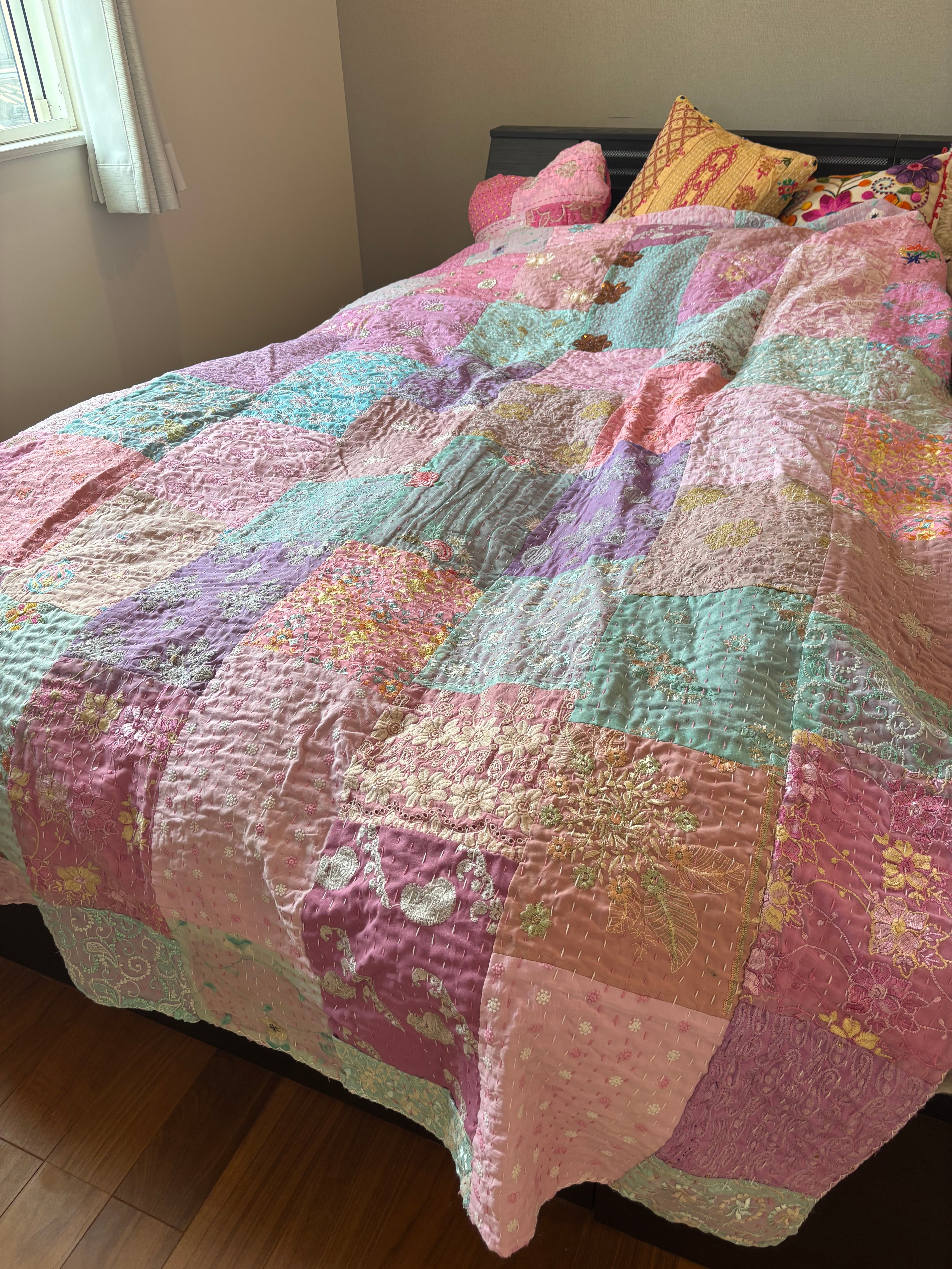 繋ぎ合わせたパッチワークキルトはとても華やか。