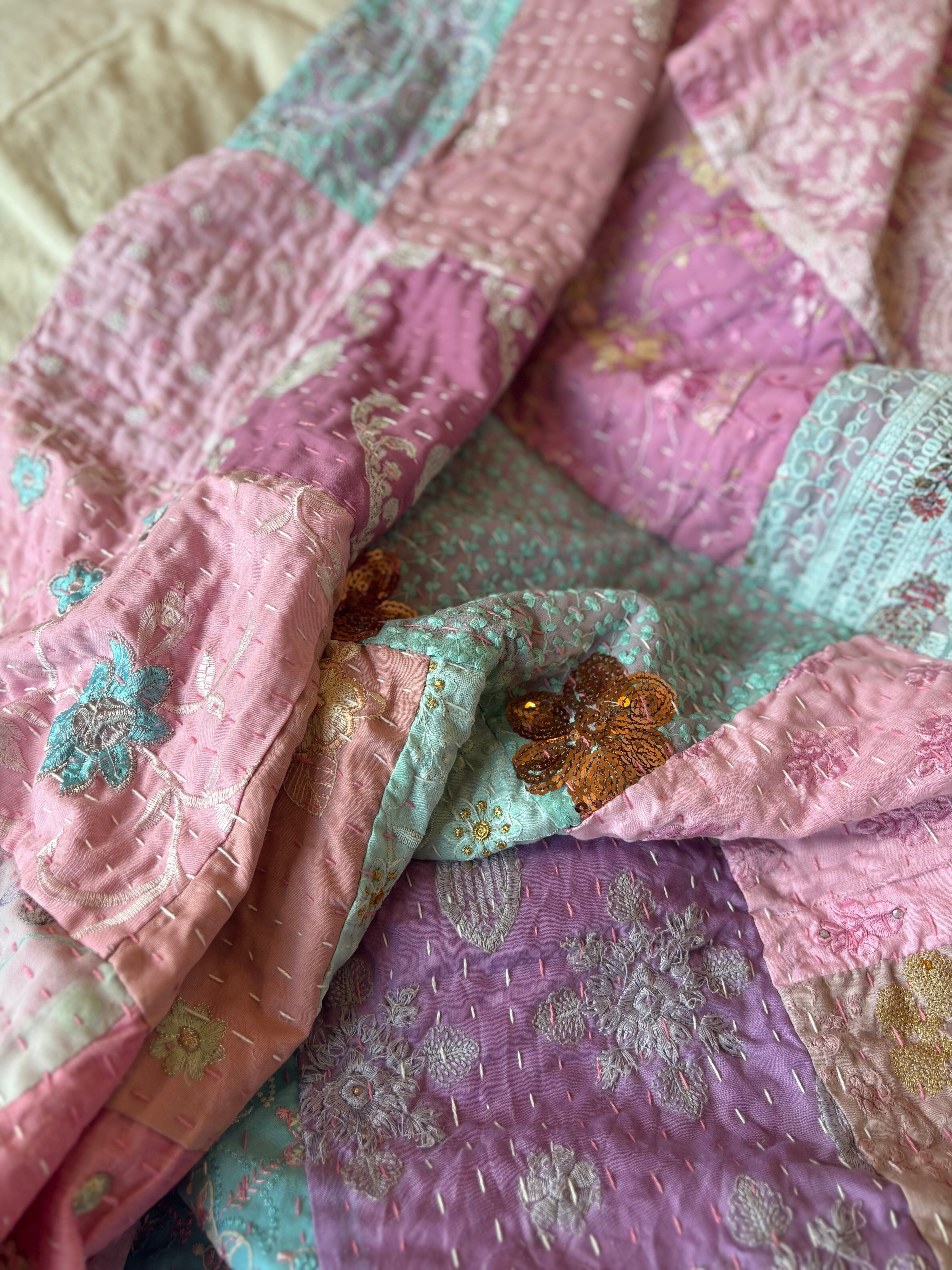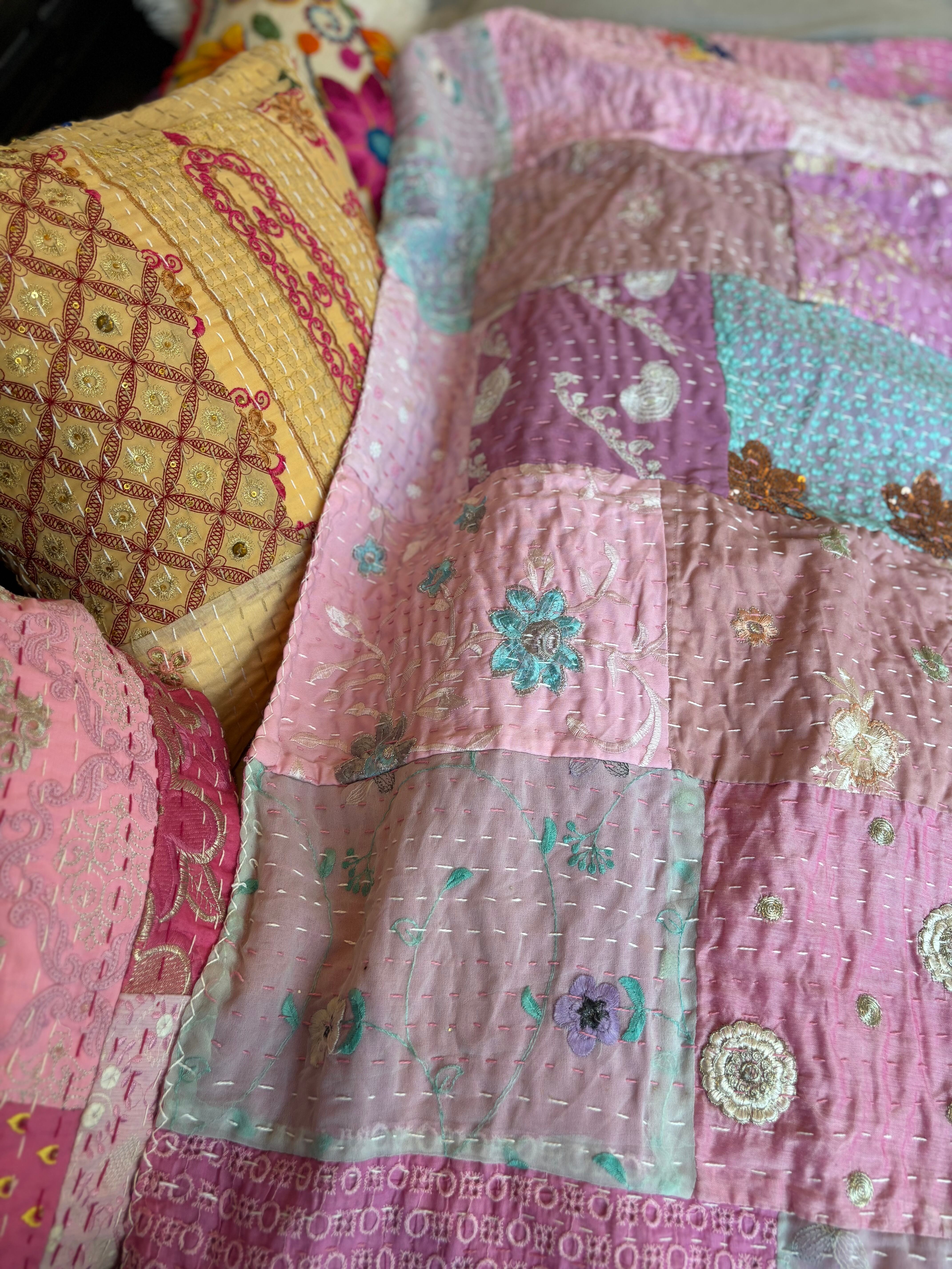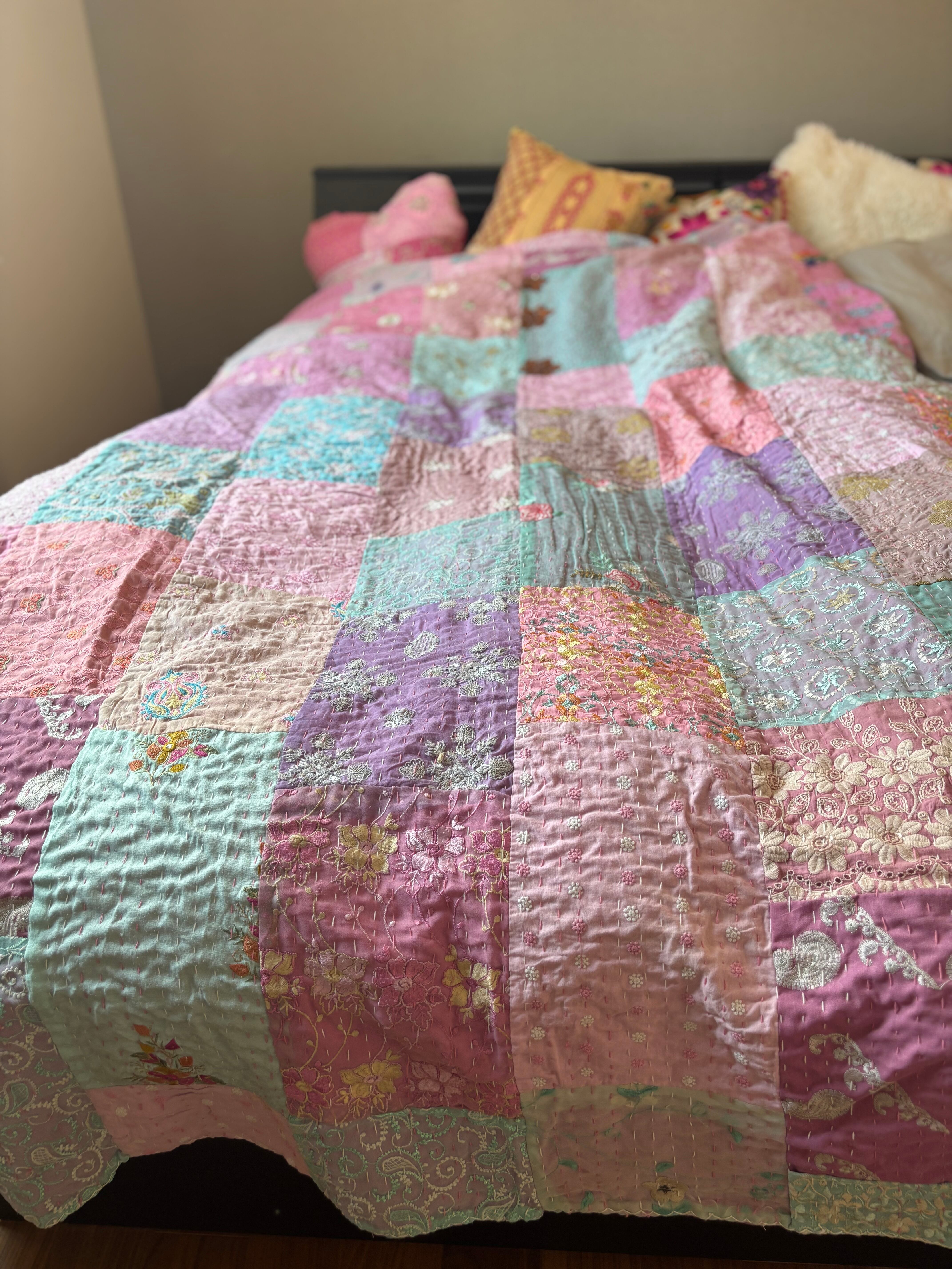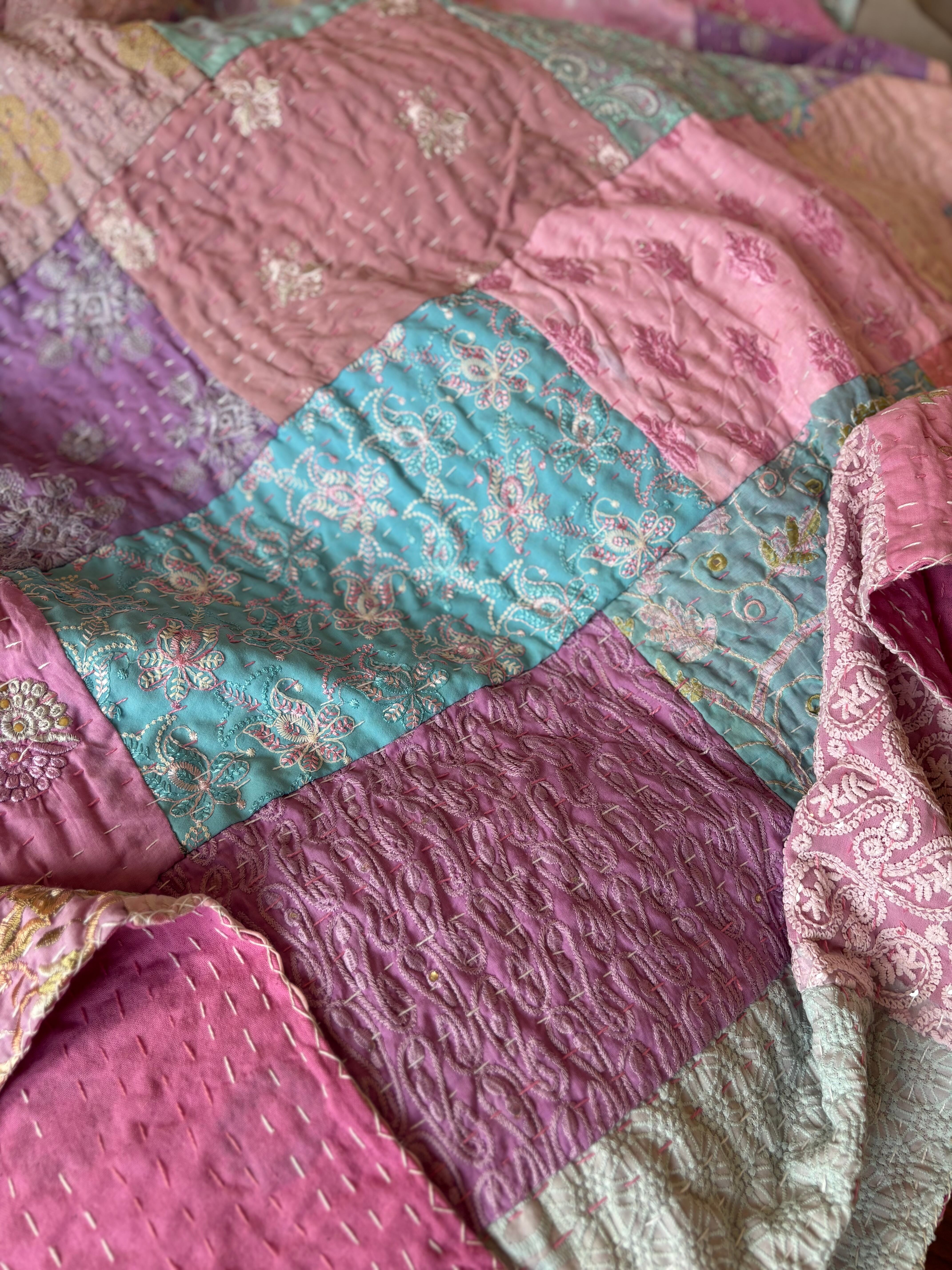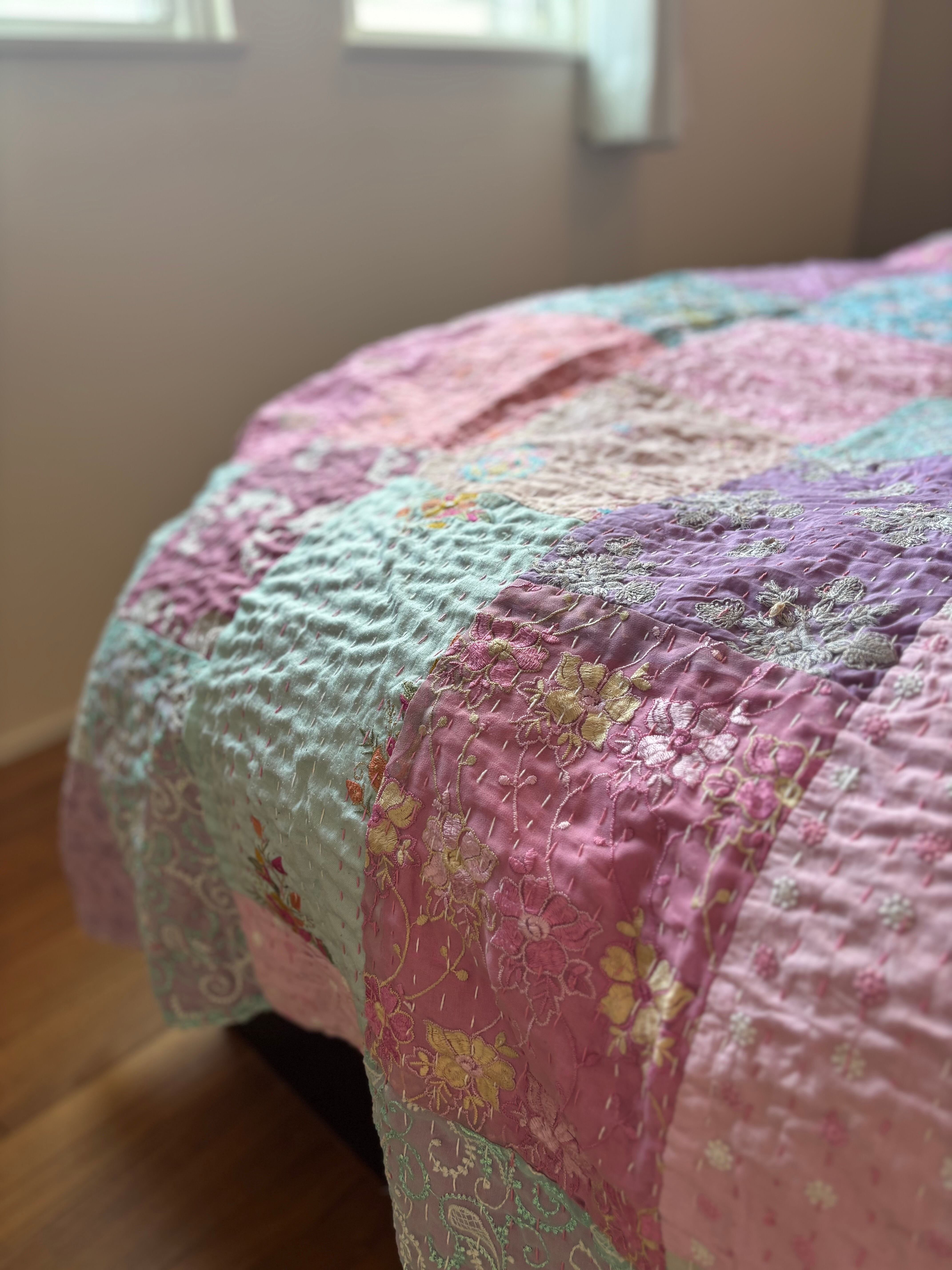 繋ぎ合わせたパッチワークキルトはとても華やか。