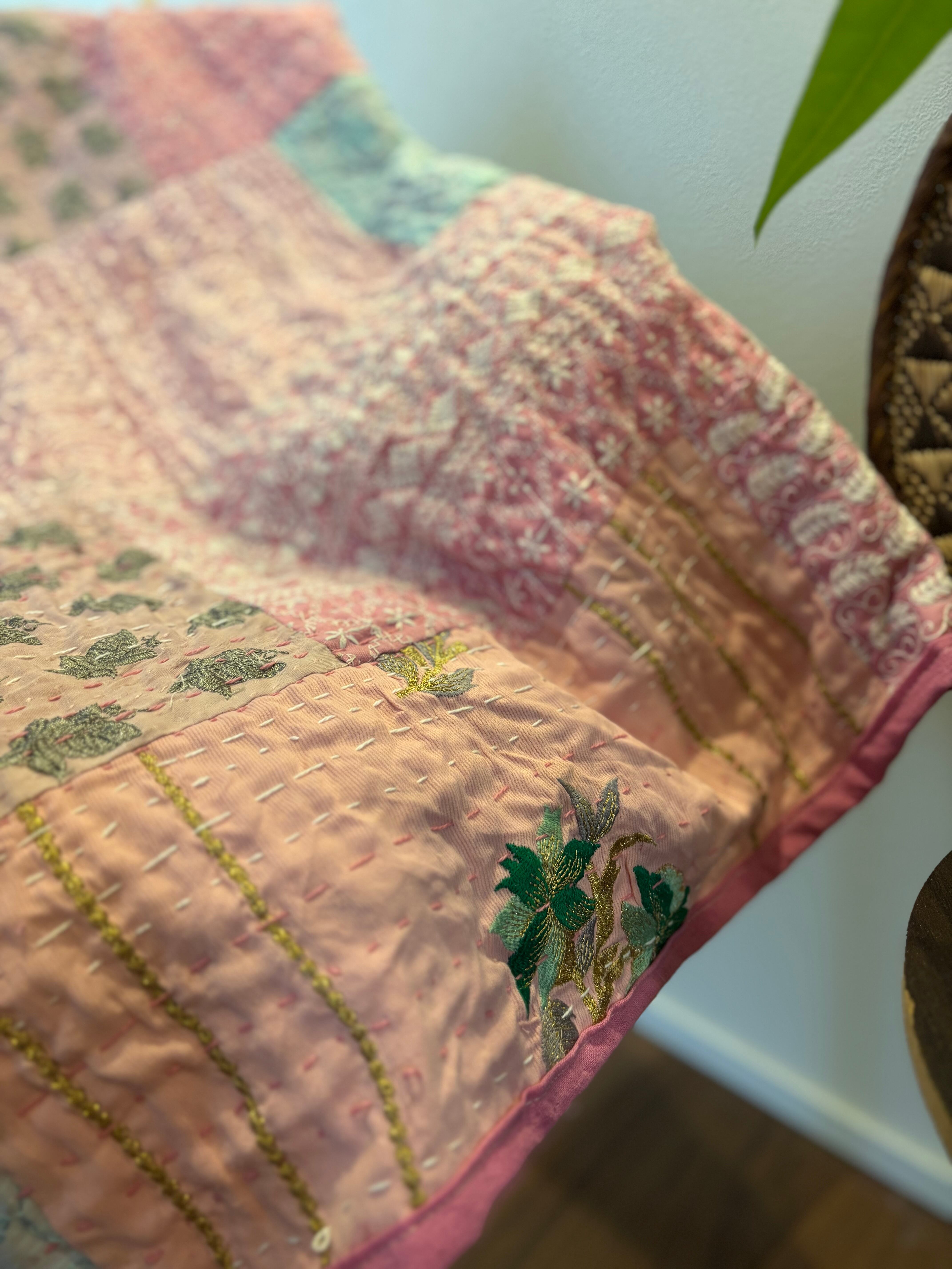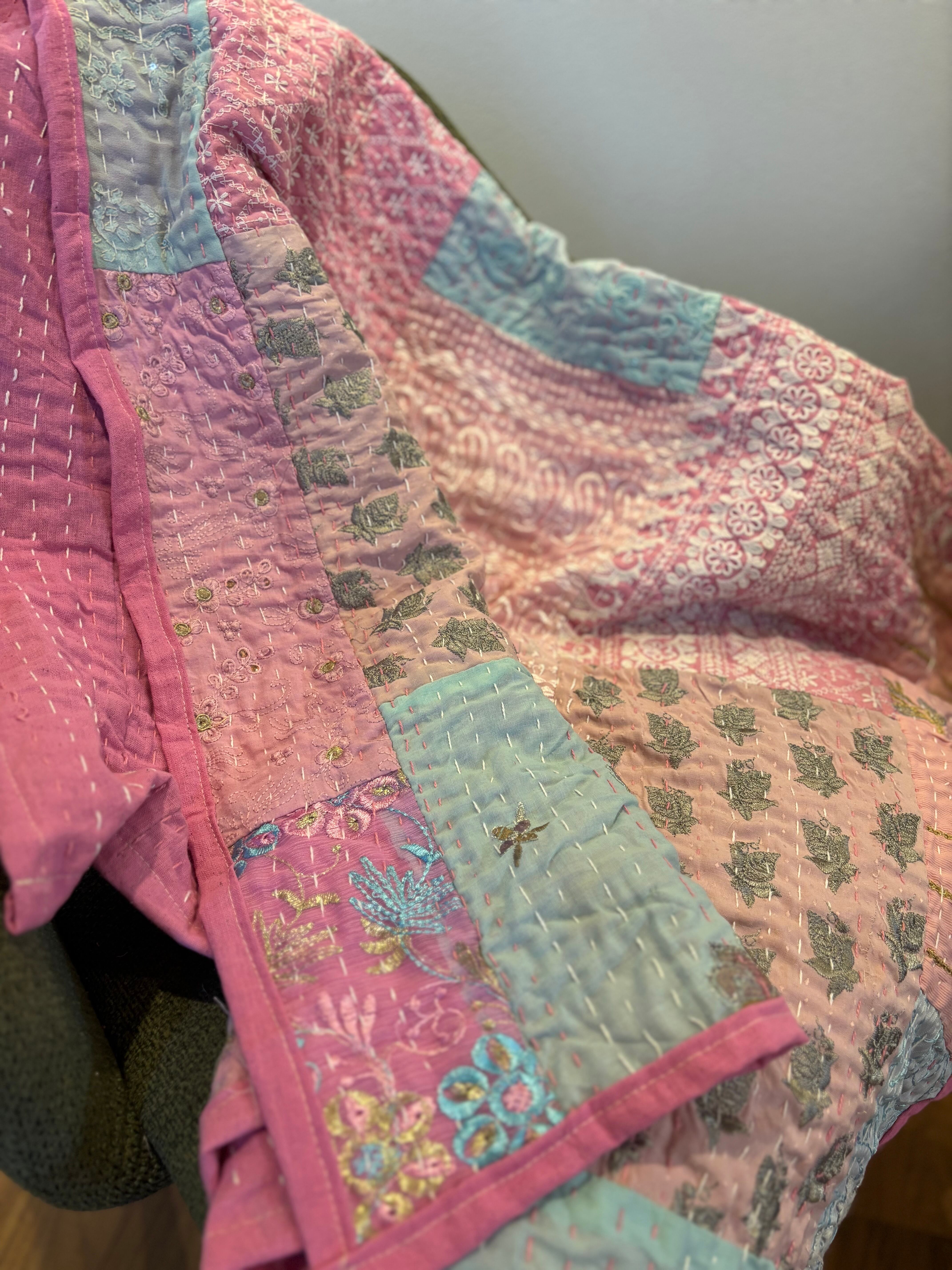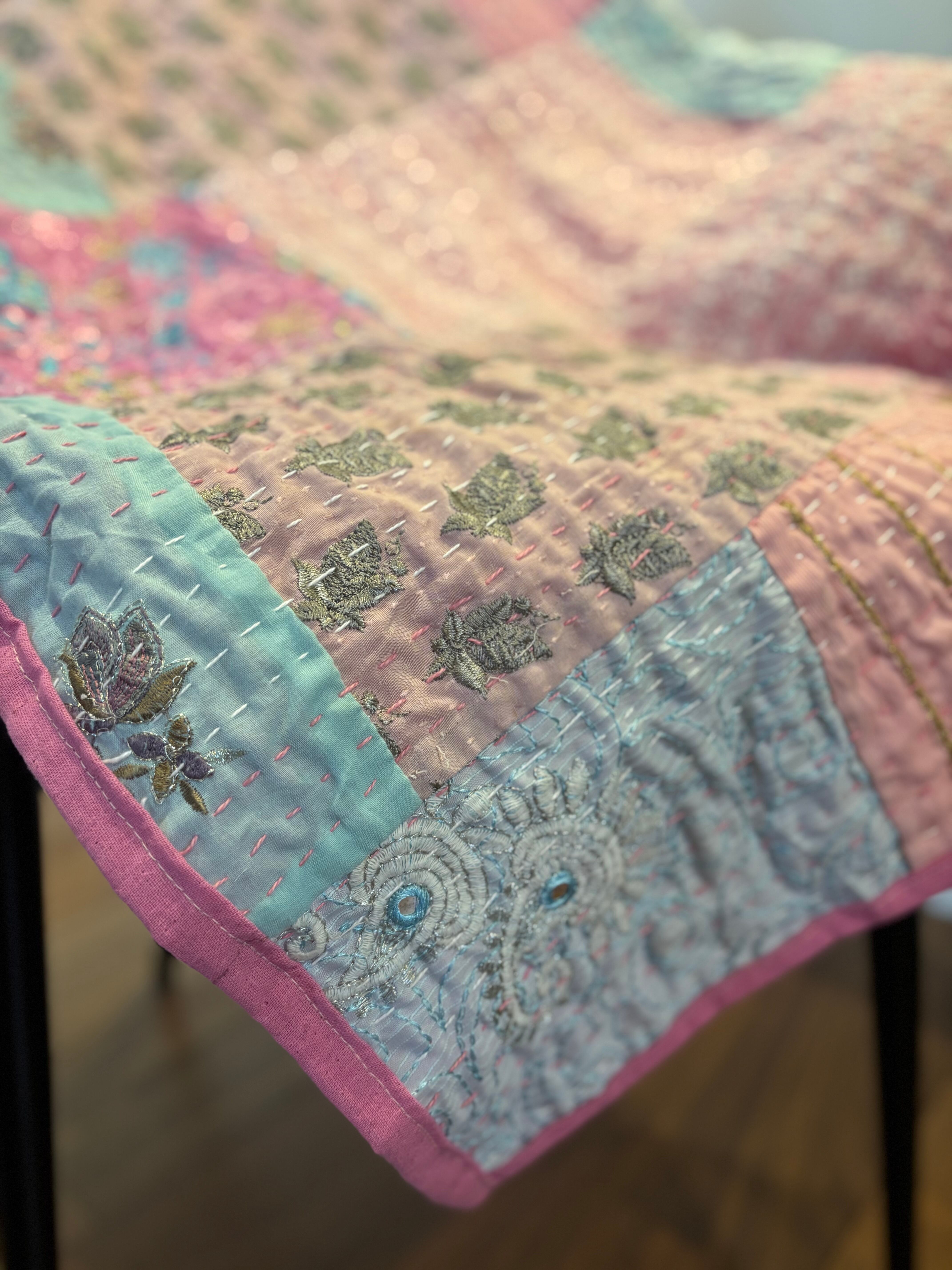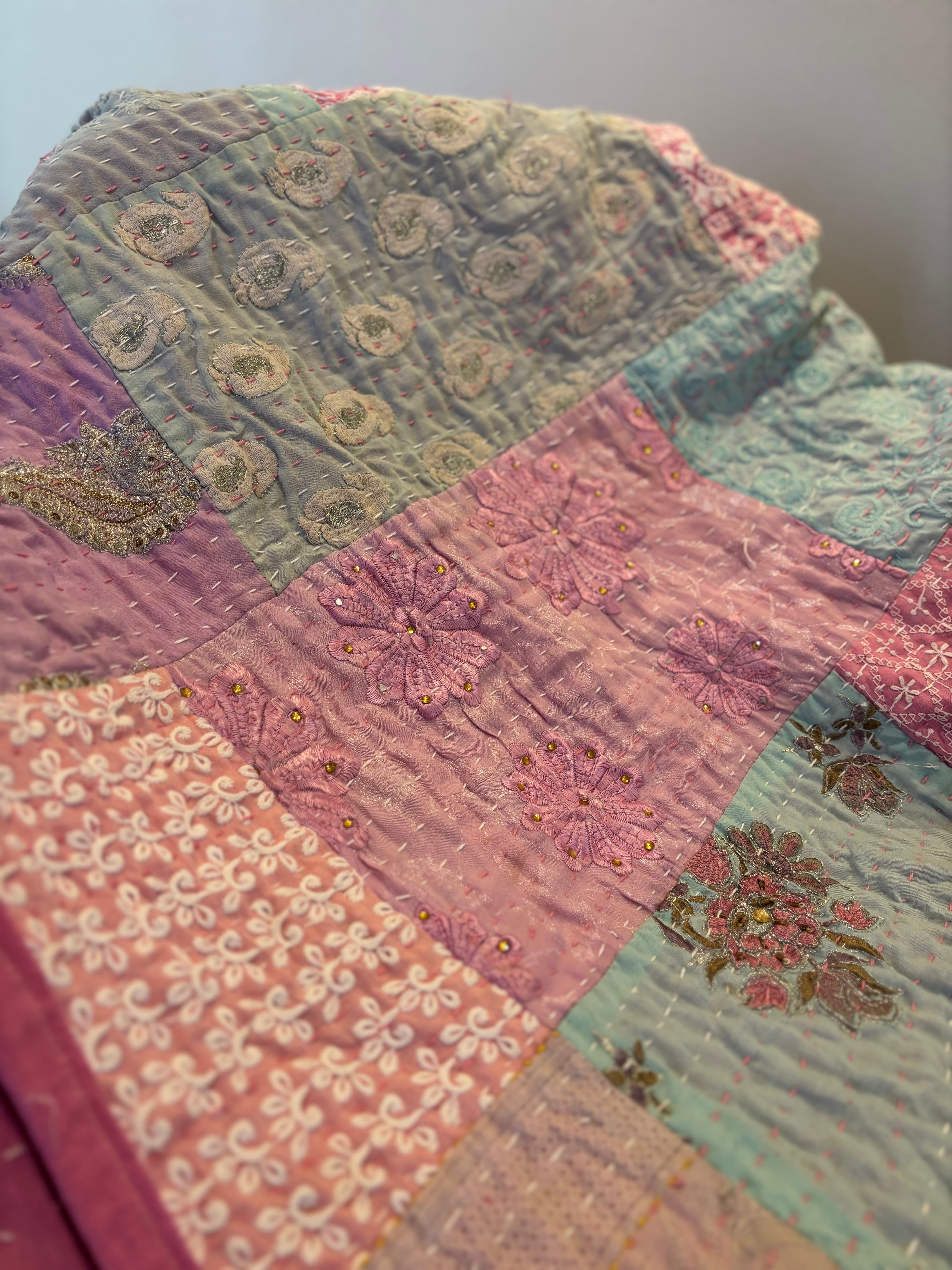 繋ぎ合わせたパッチワークキルトはとても華やか。