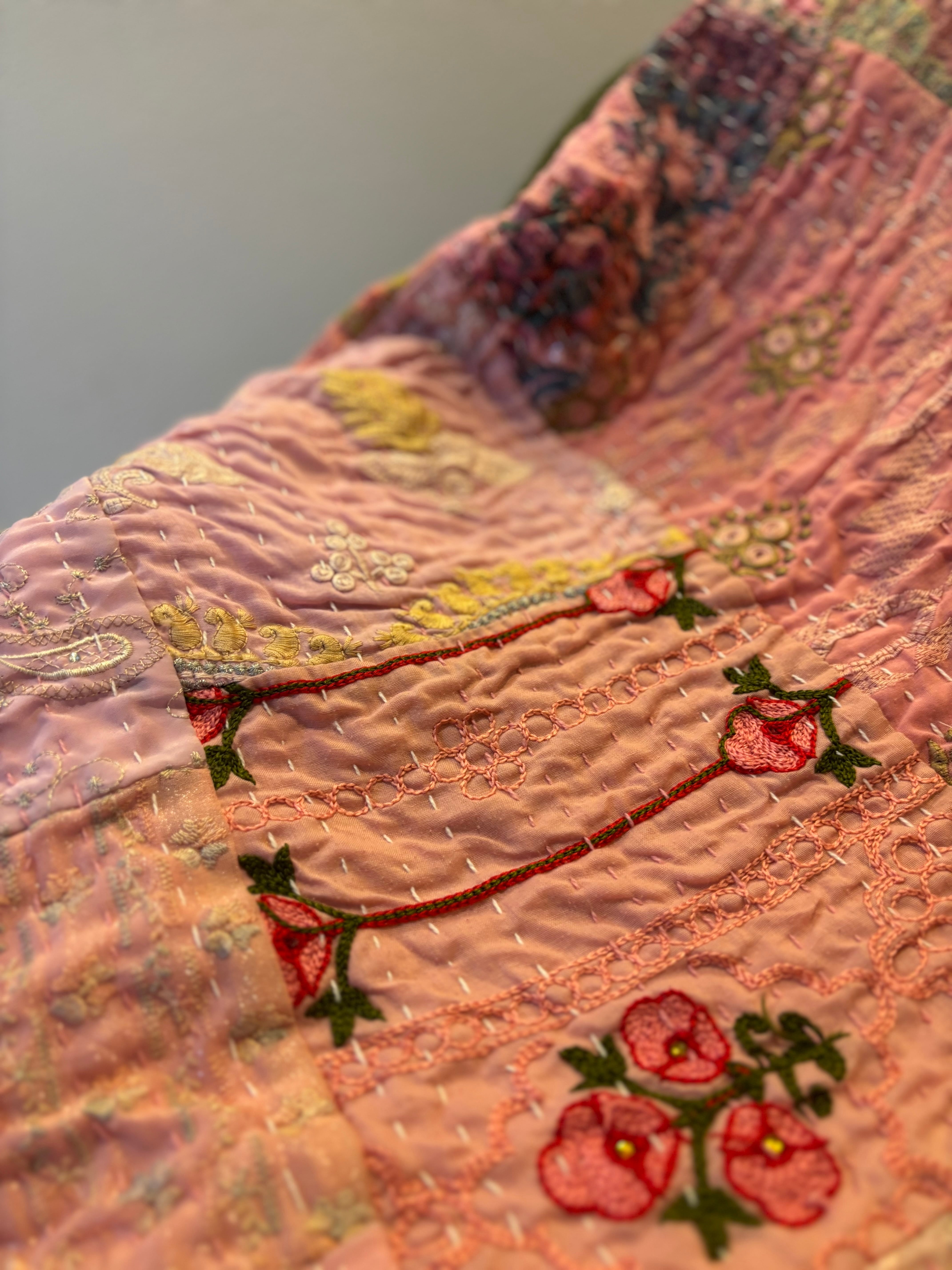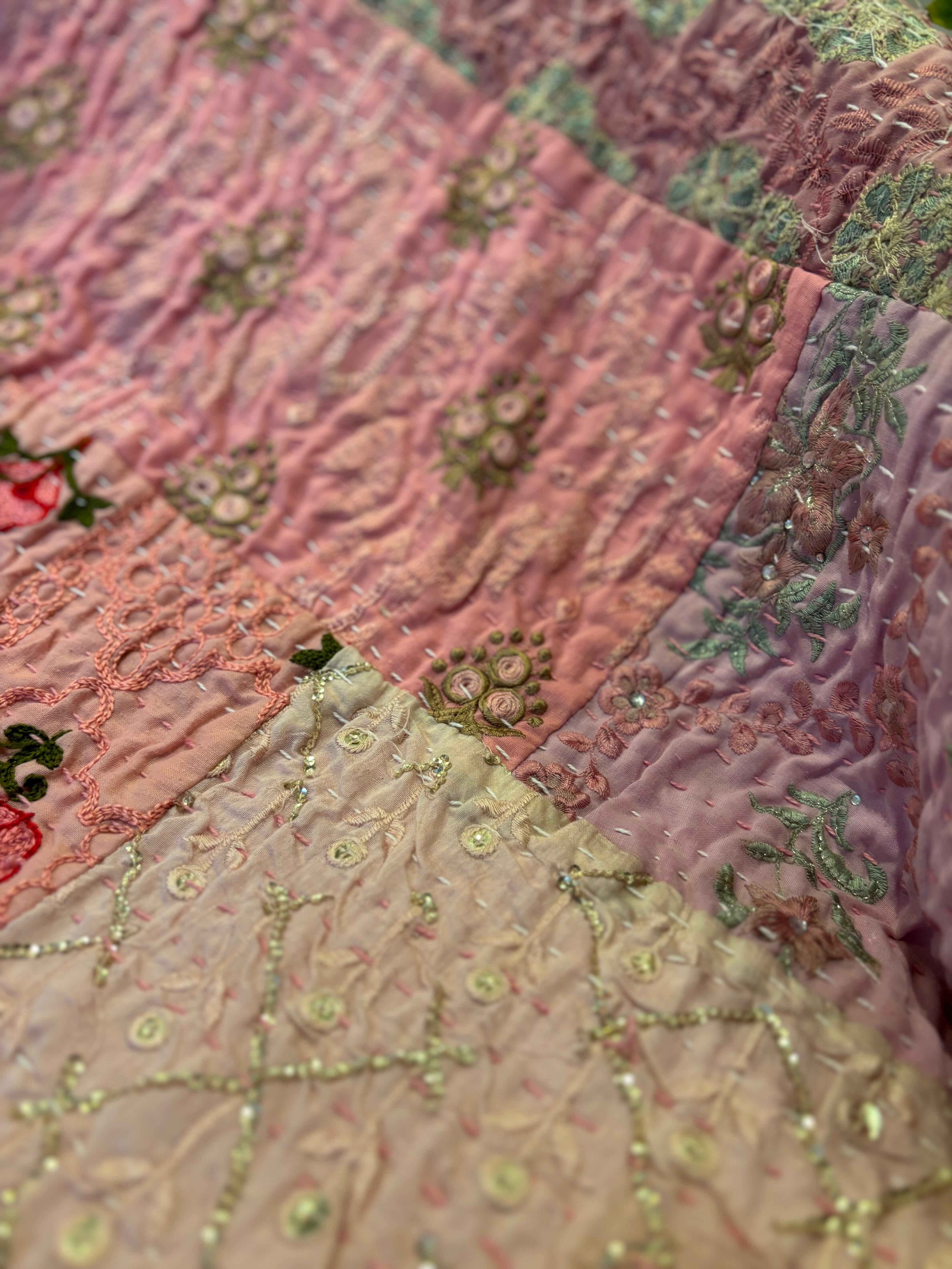 繋ぎ合わせたパッチワークキルトはとても華やか。