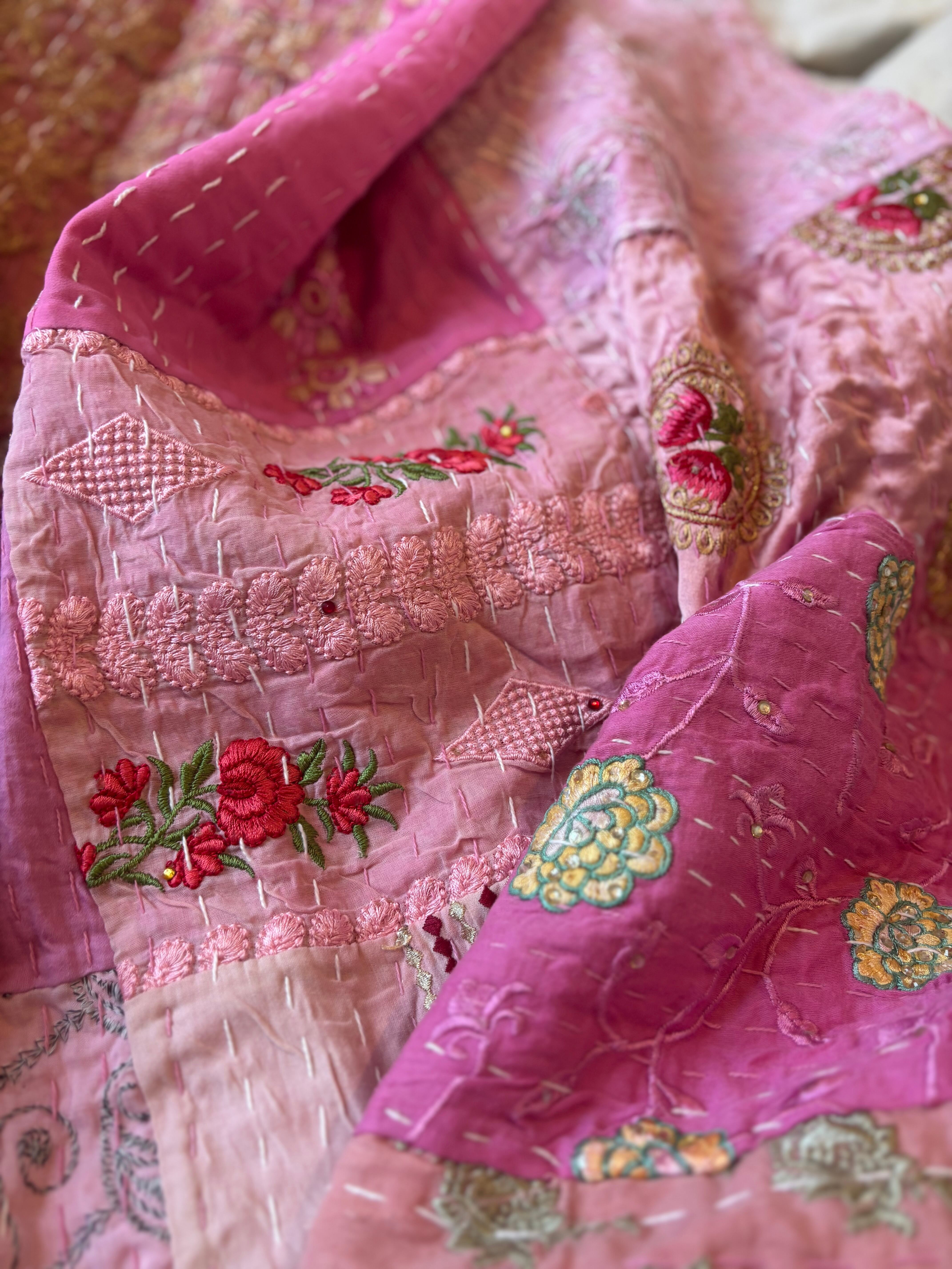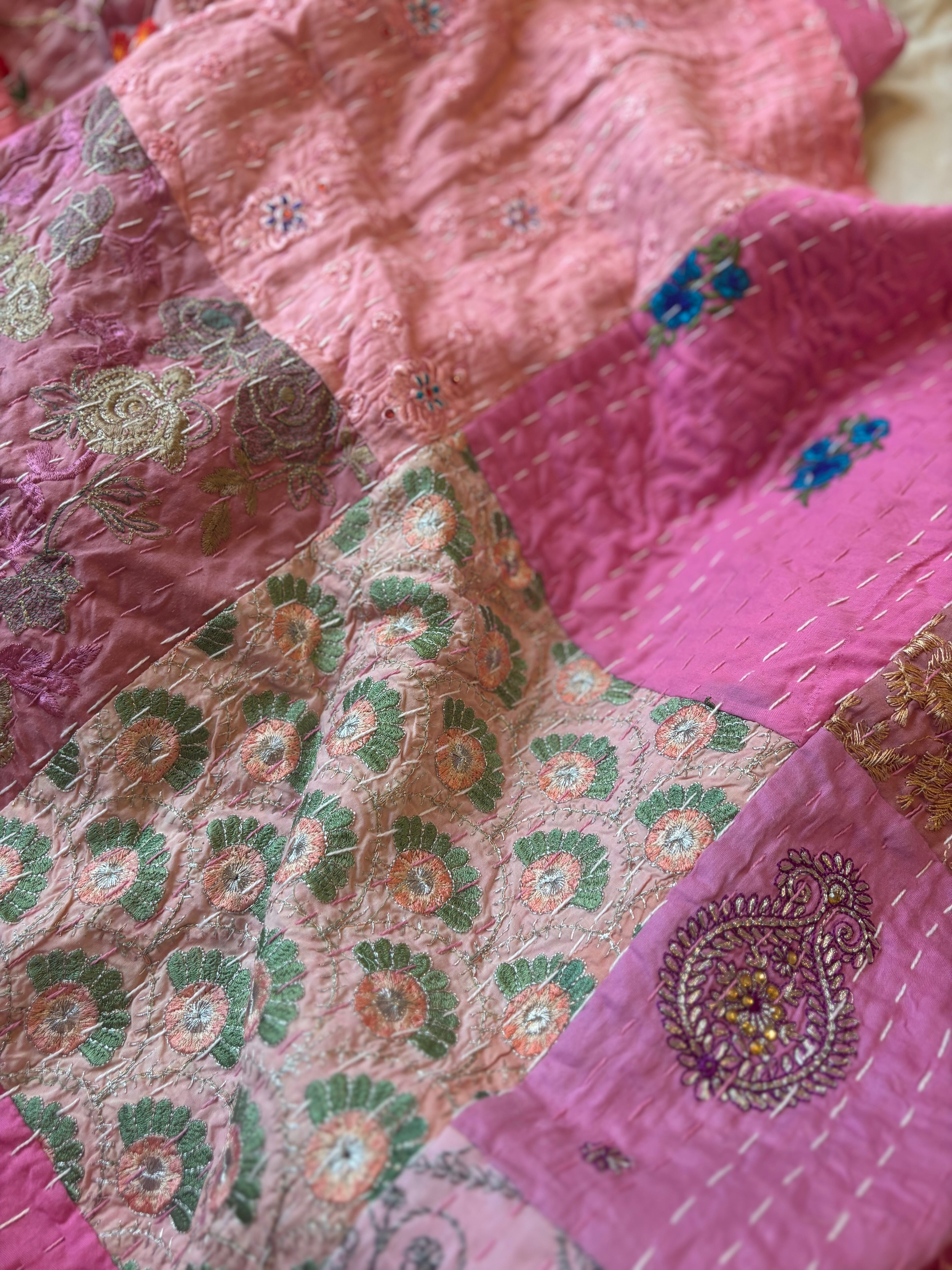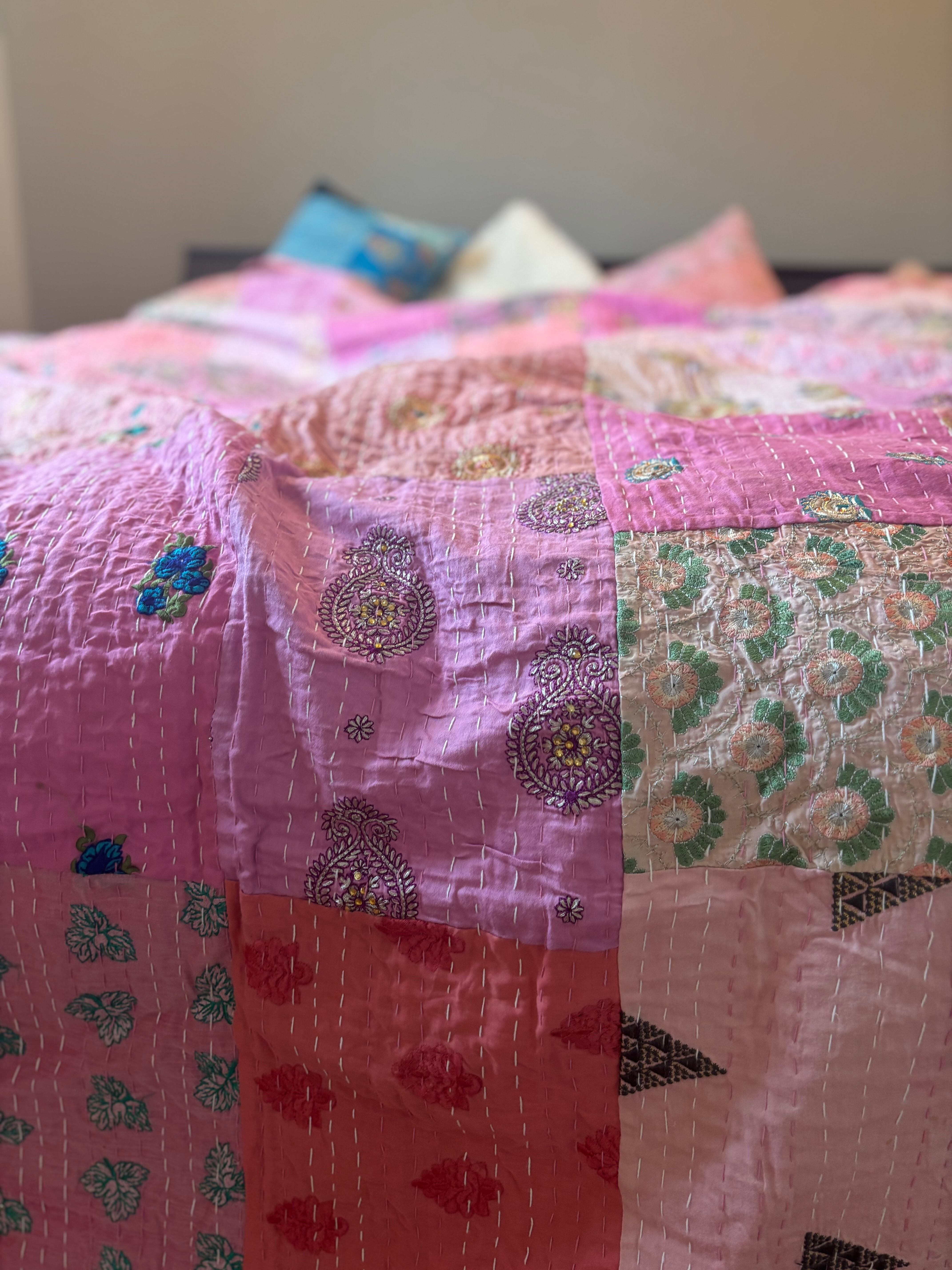 繋ぎ合わせたパッチワークキルトはとても華やか。