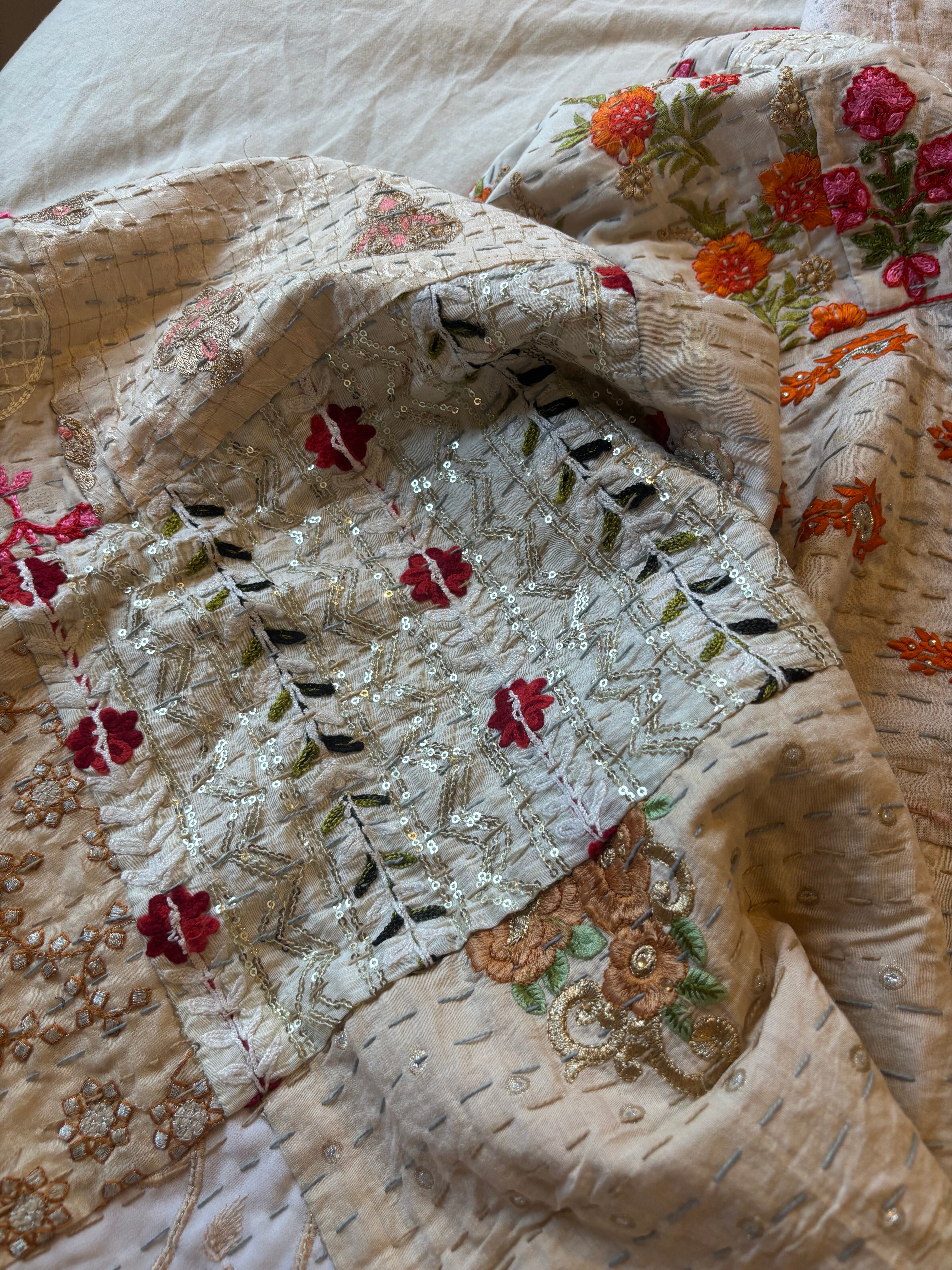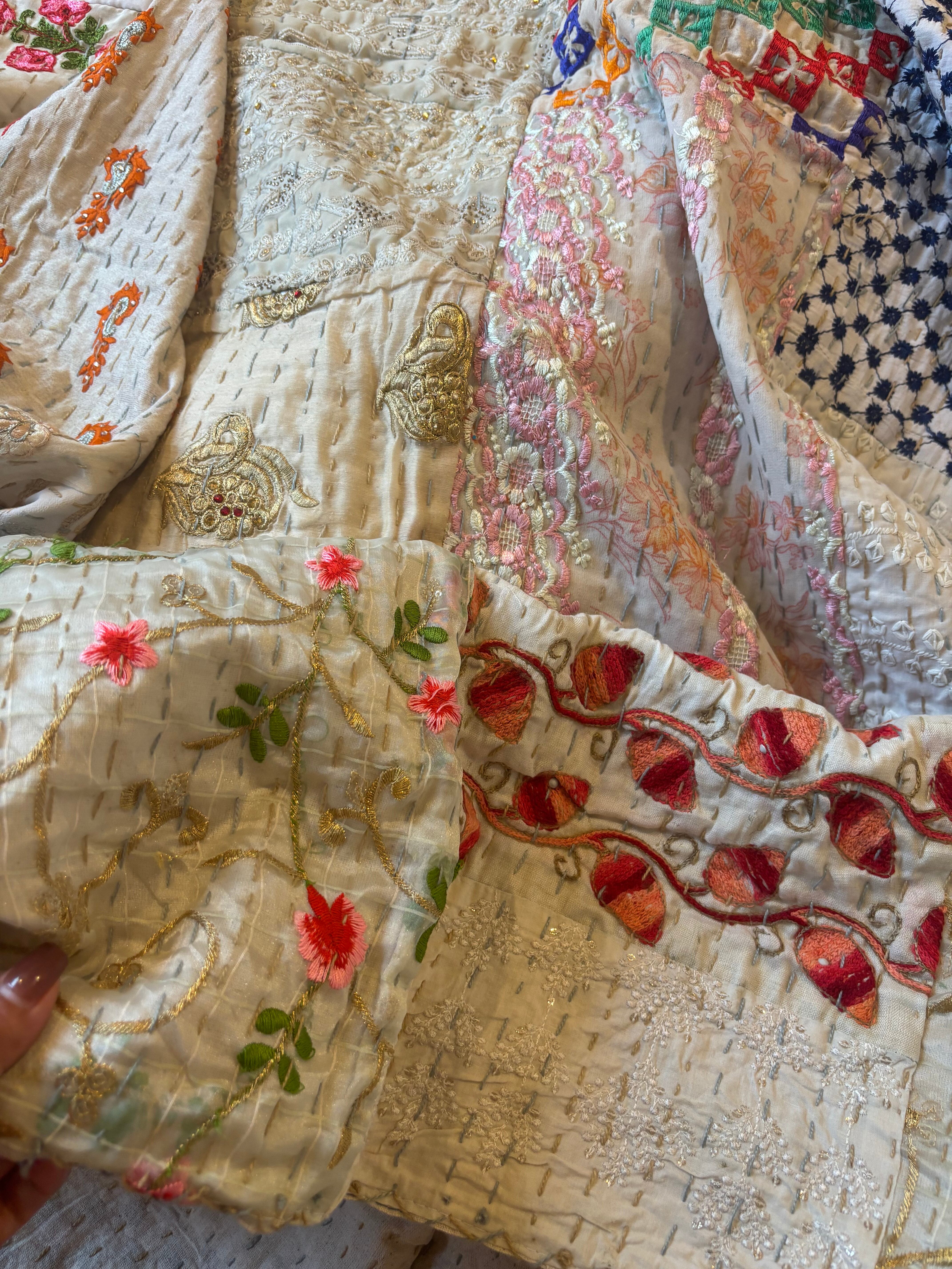 繋ぎ合わせたパッチワークキルトはとても華やか。