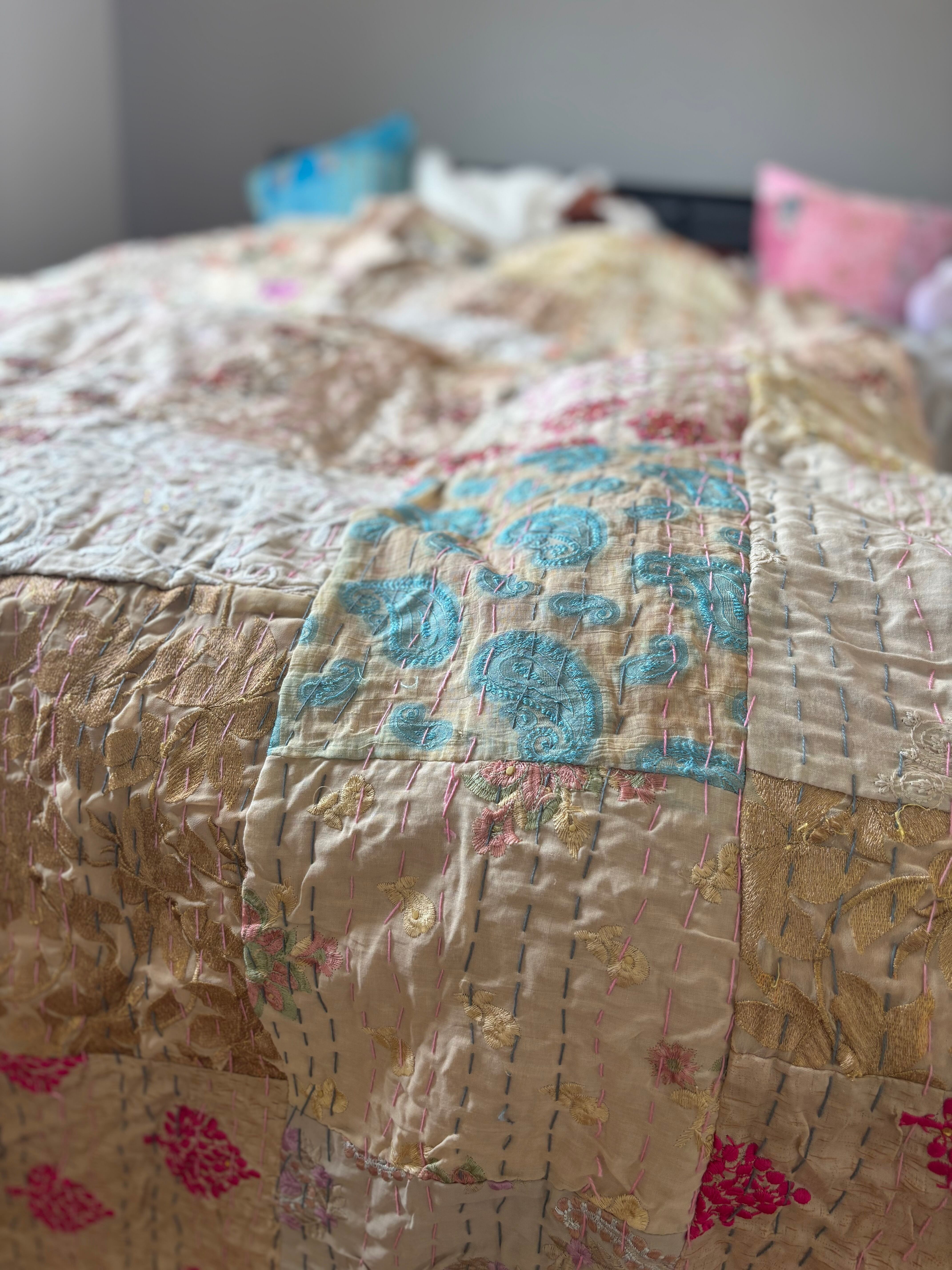 繋ぎ合わせたパッチワークキルトはとても華やか。