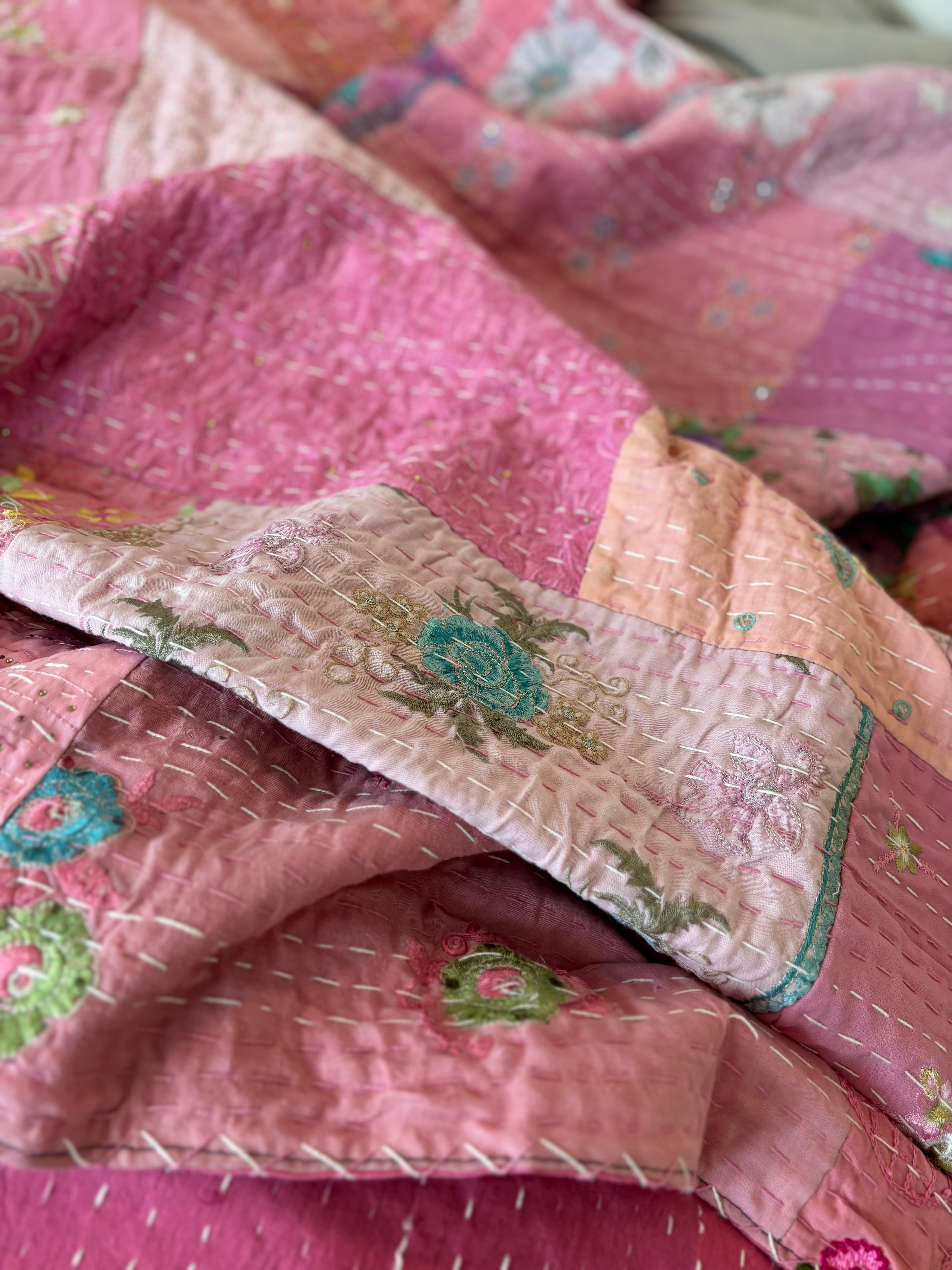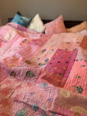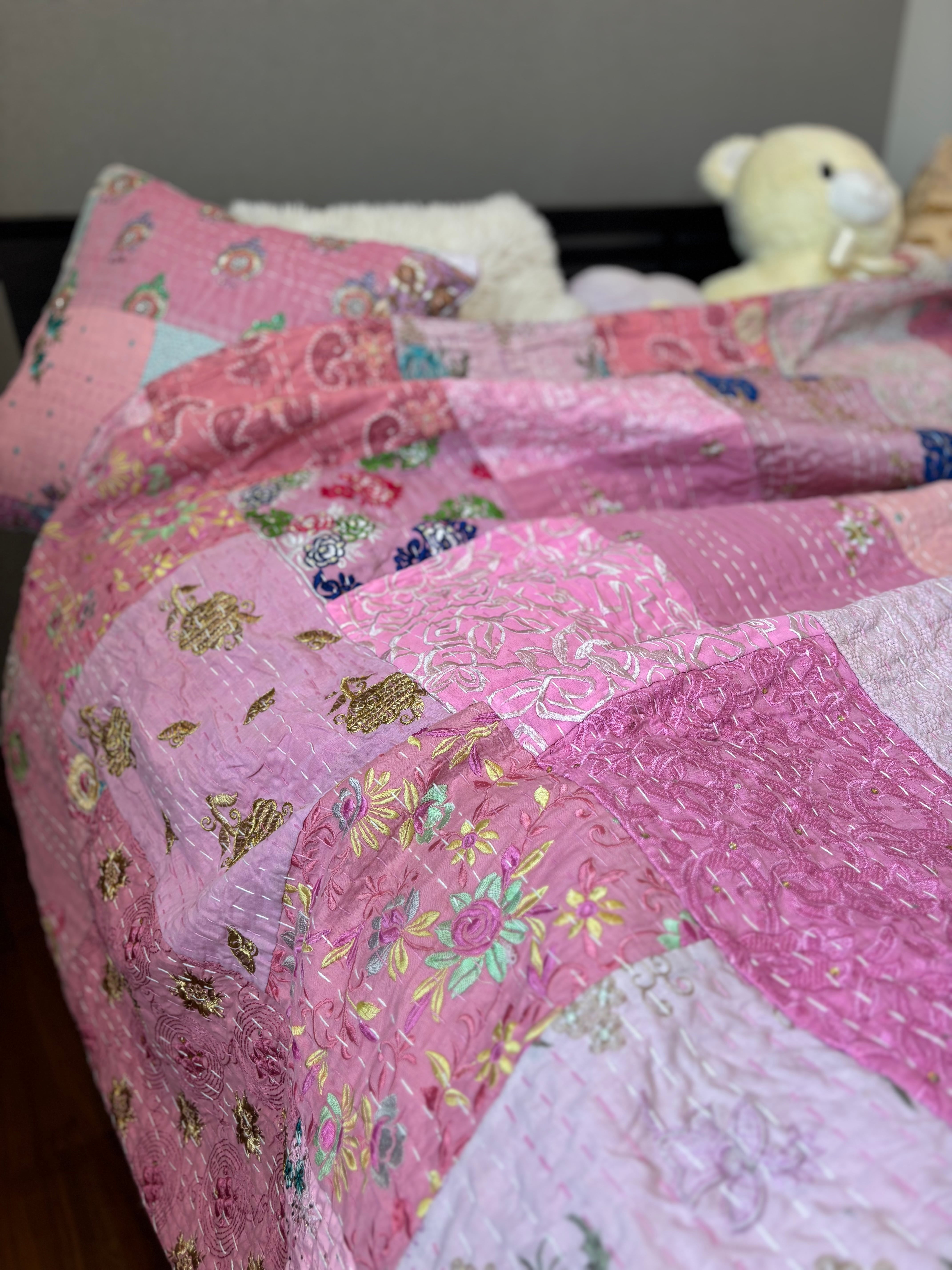 繋ぎ合わせたパッチワークキルトはとても華やか。