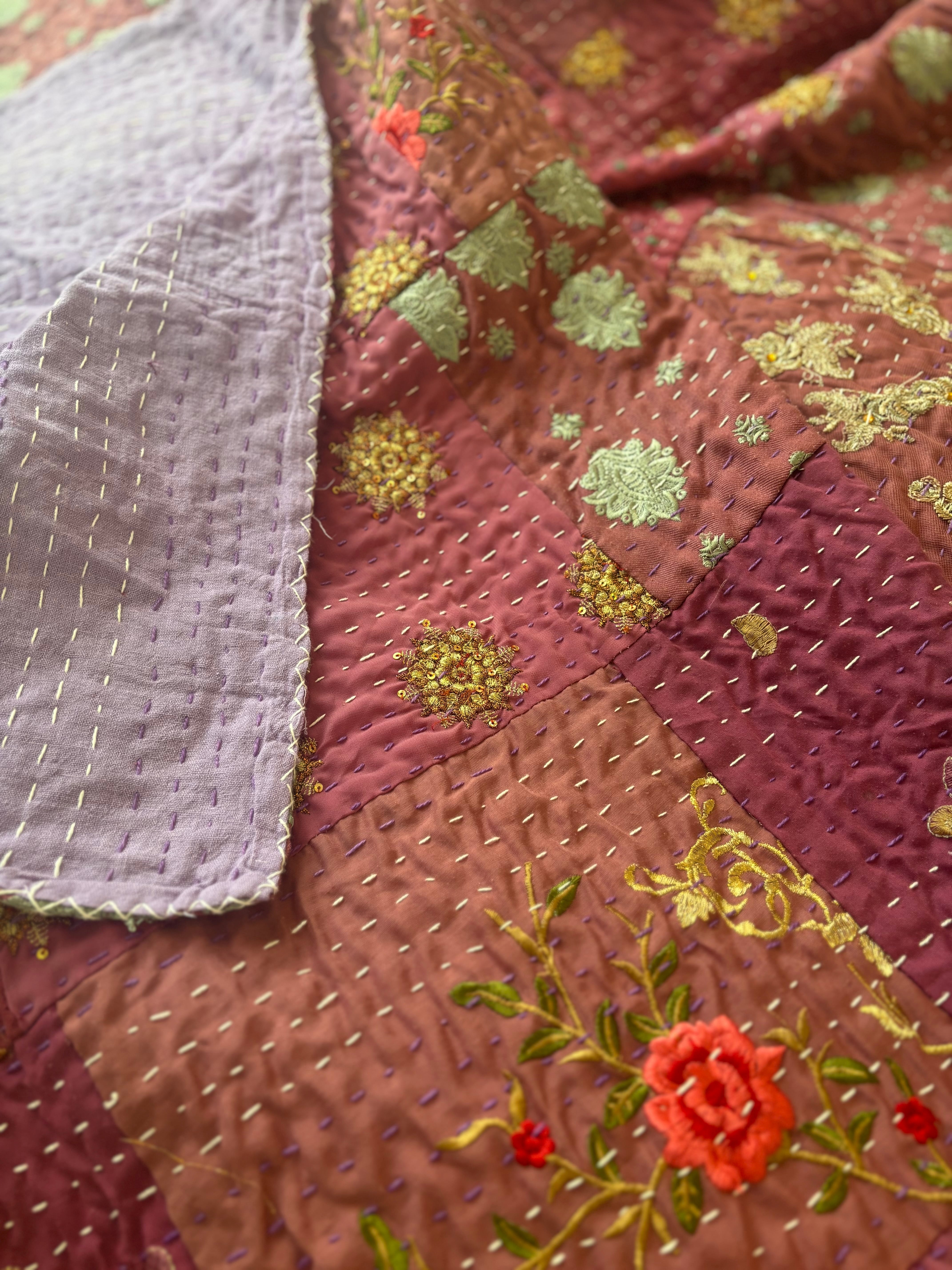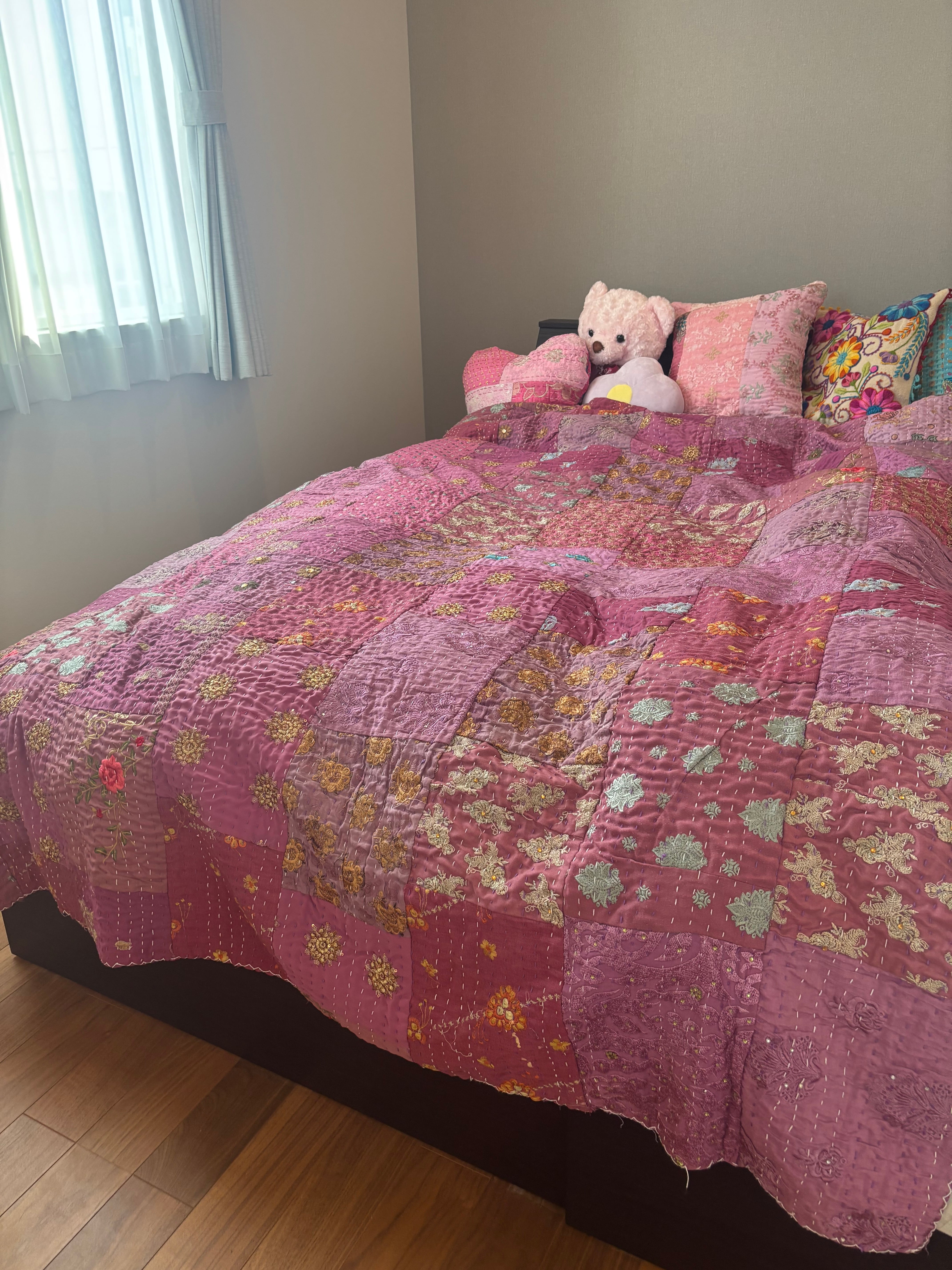 繋ぎ合わせたパッチワークキルトはとても華やか。