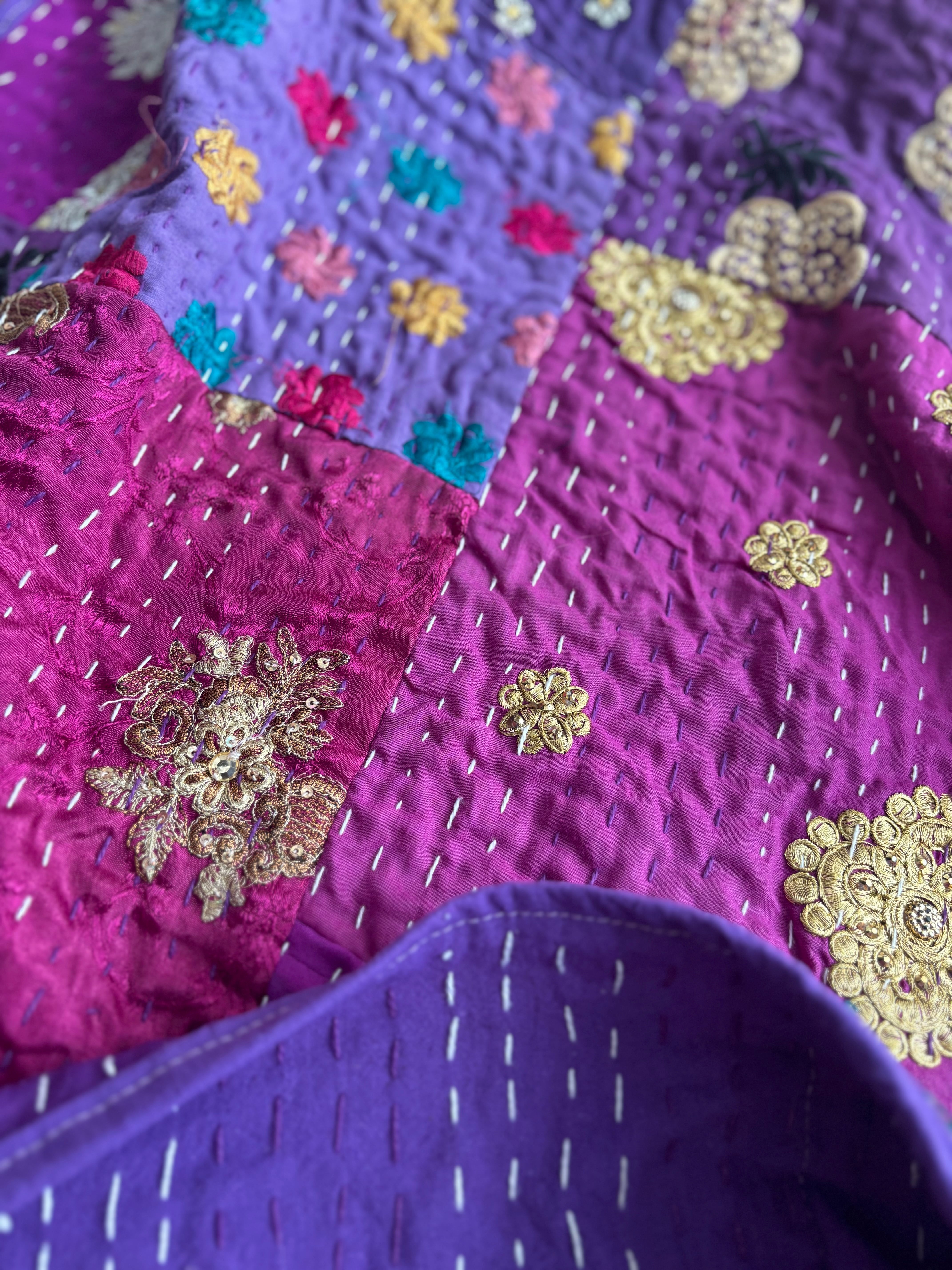 繋ぎ合わせたパッチワークキルトはとても華やか。