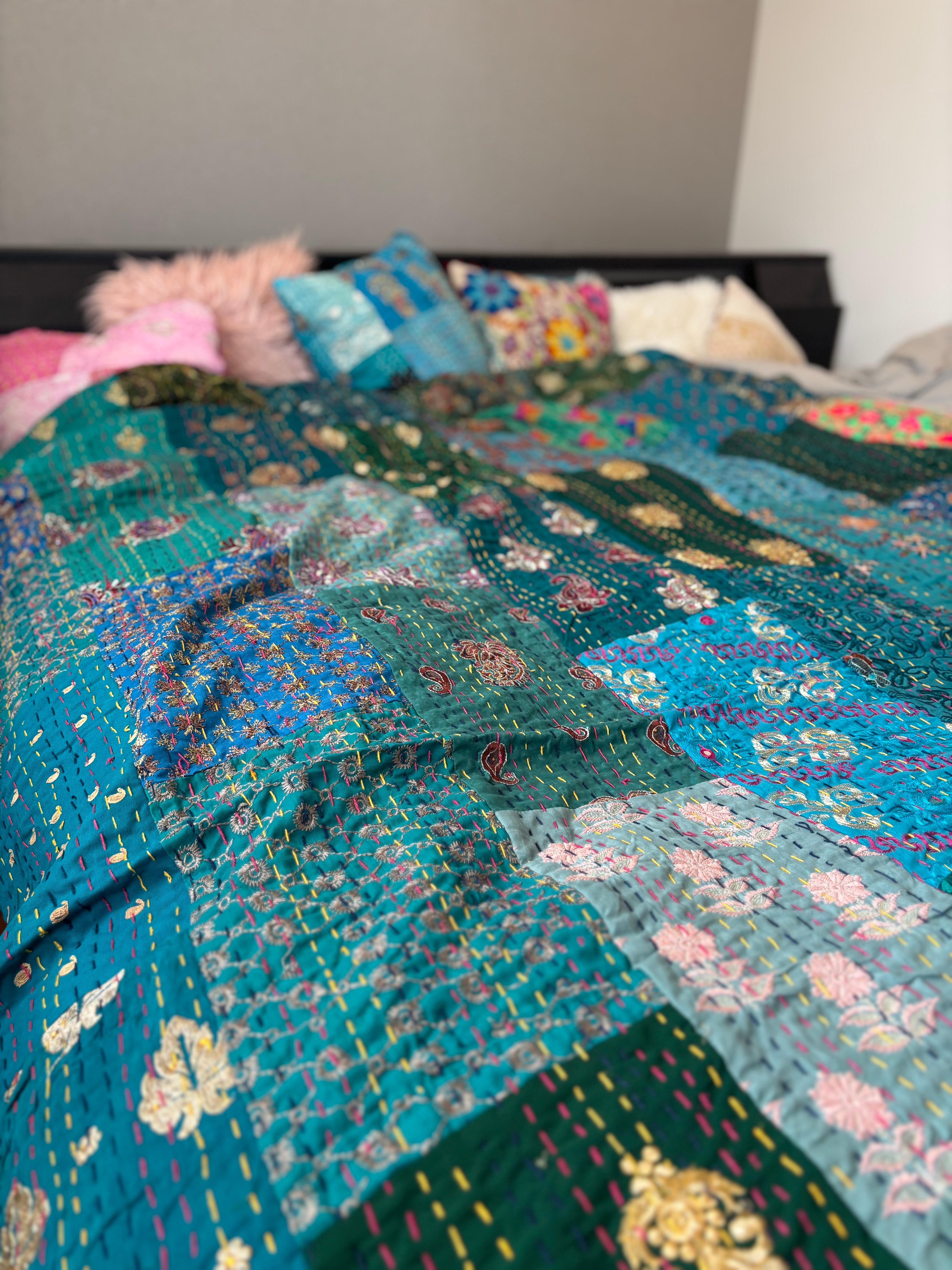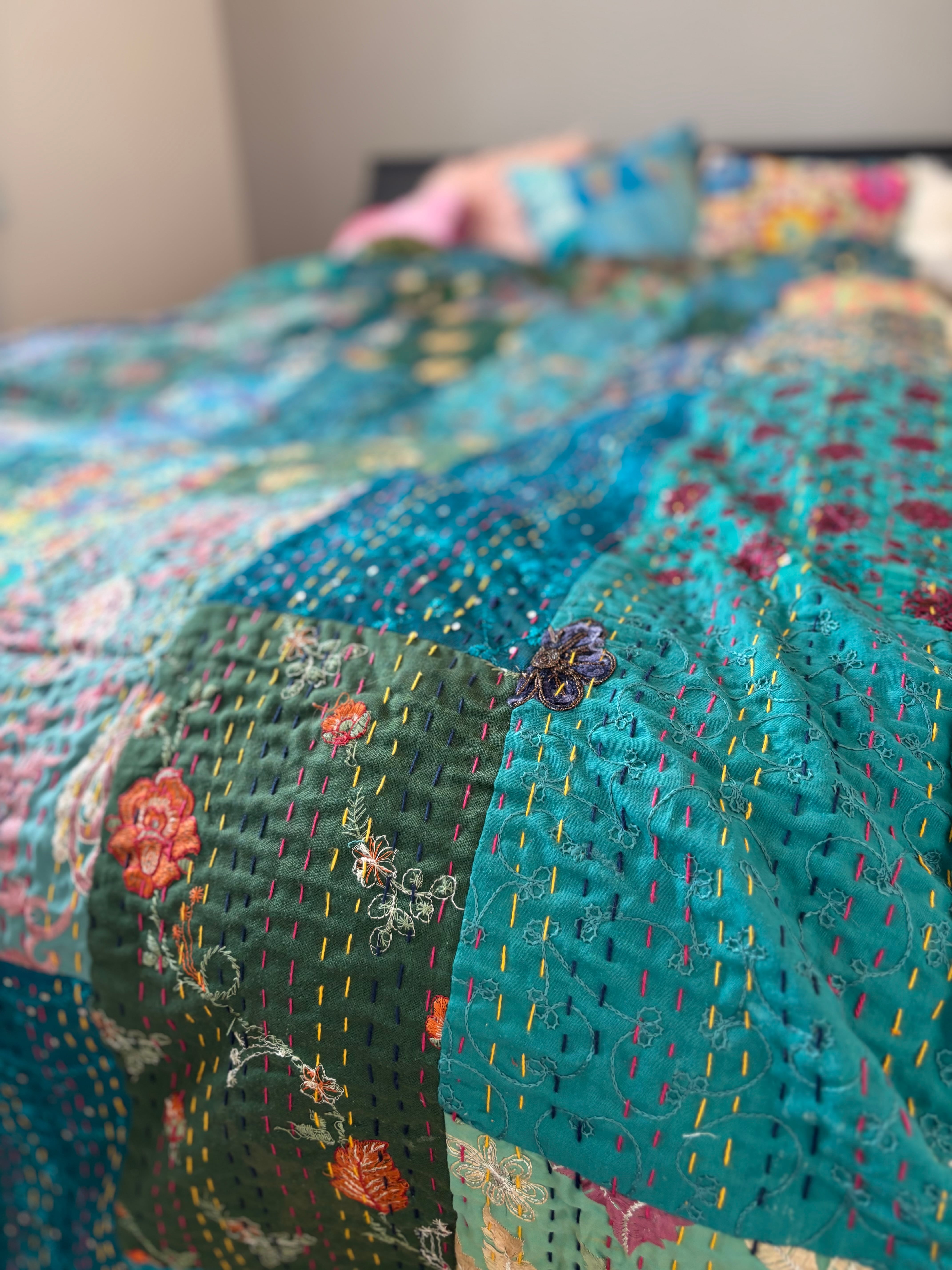 繋ぎ合わせたパッチワークキルトはとても華やか。