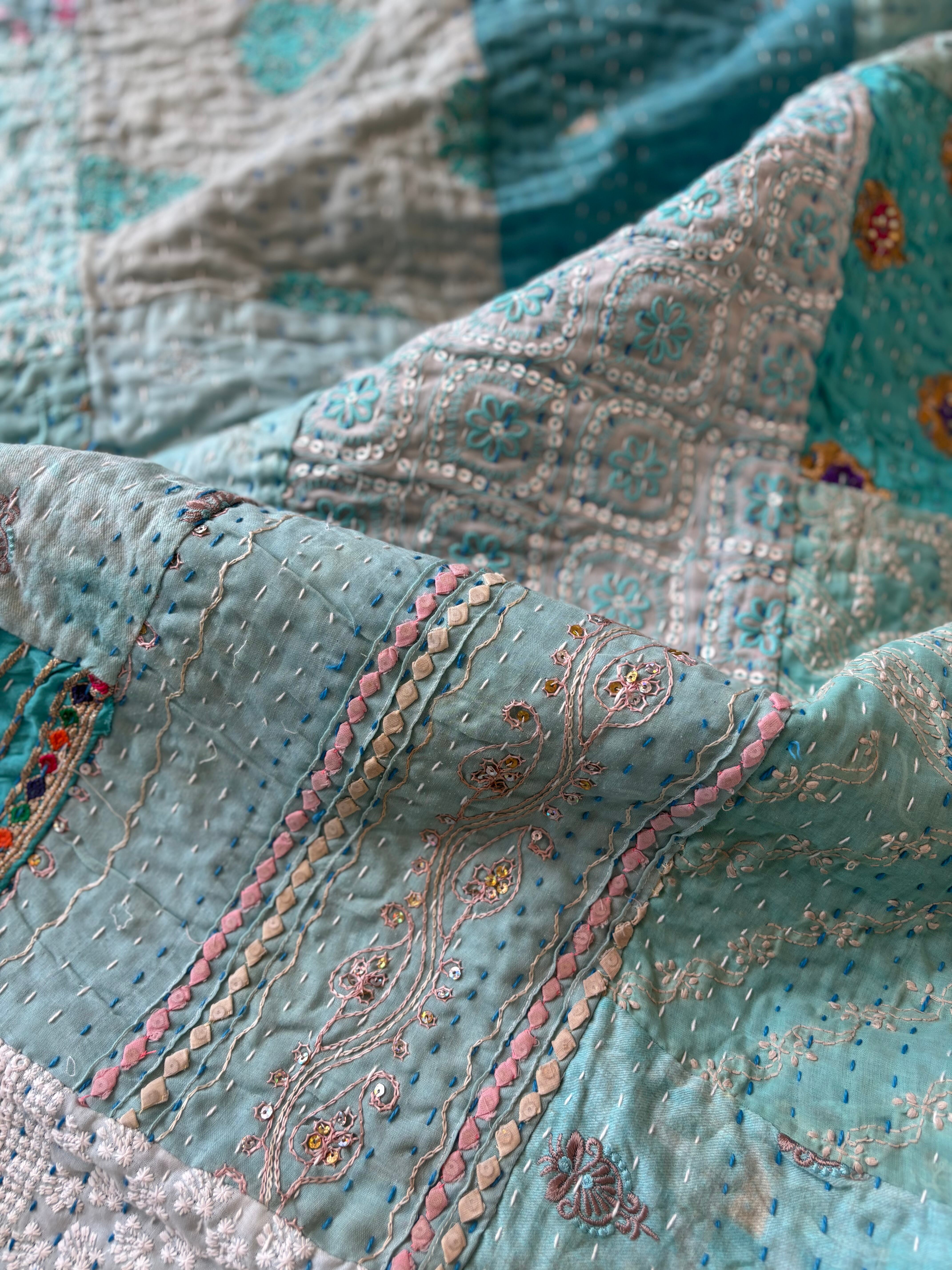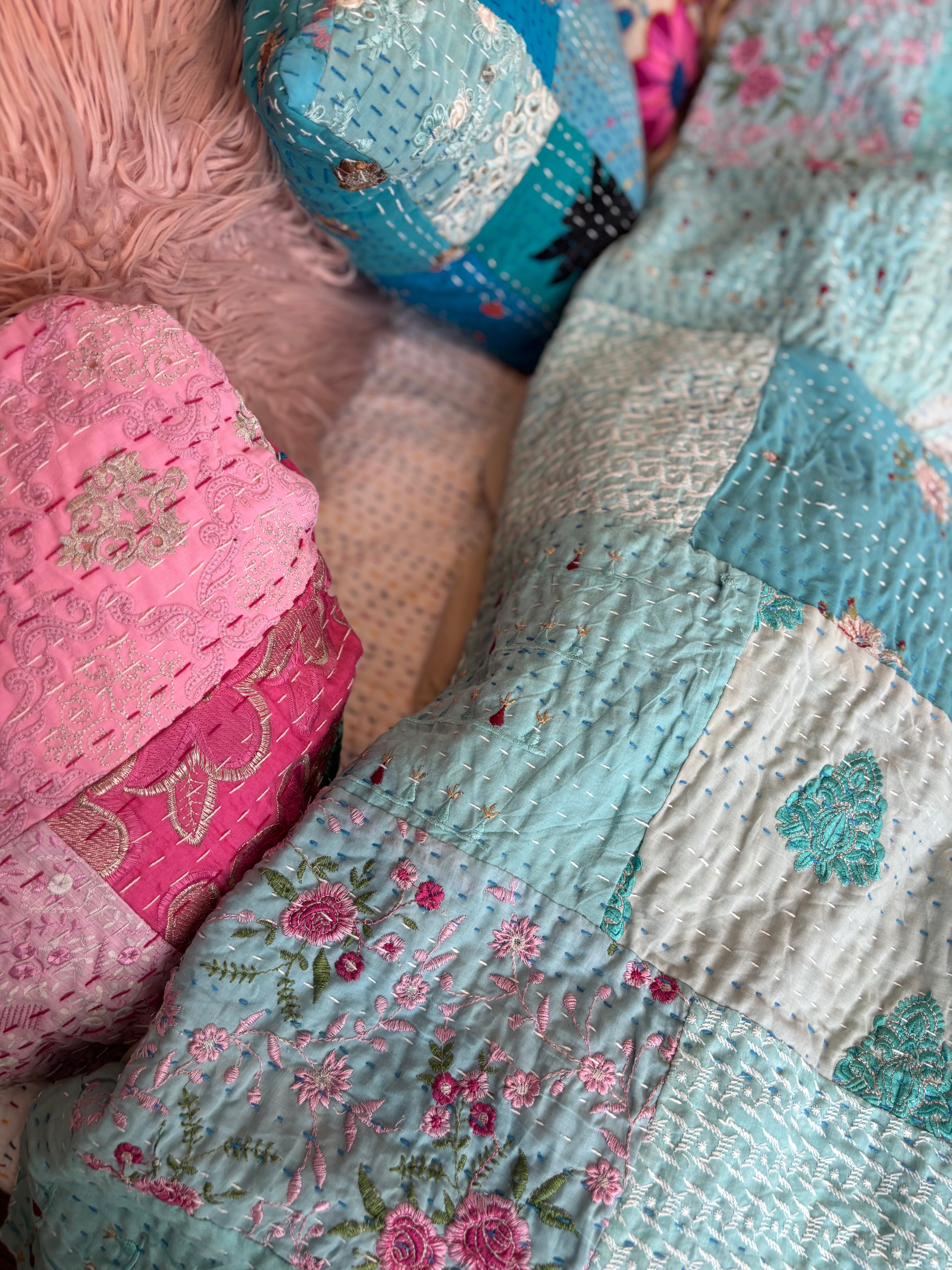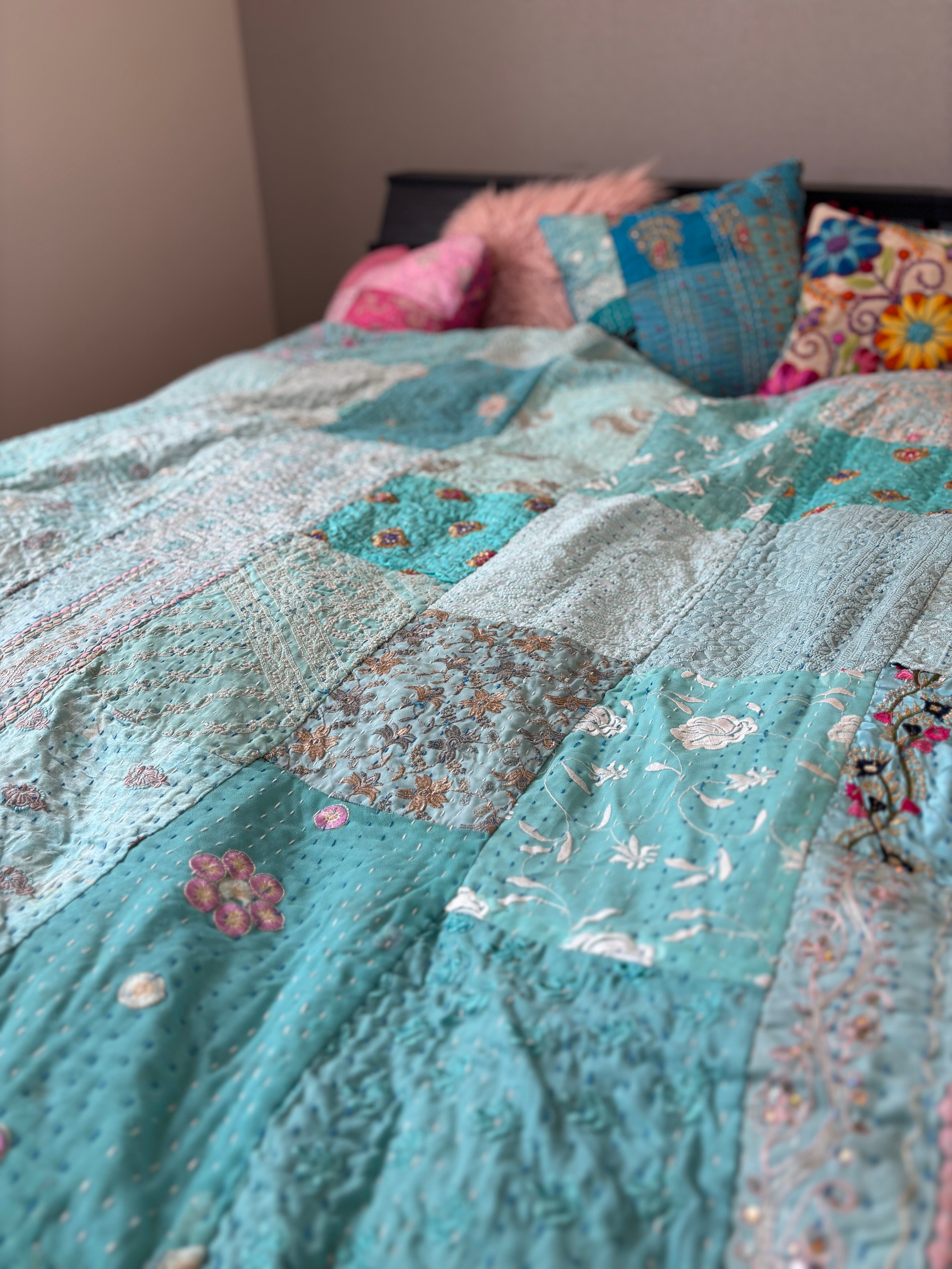 繋ぎ合わせたパッチワークキルトはとても華やか。