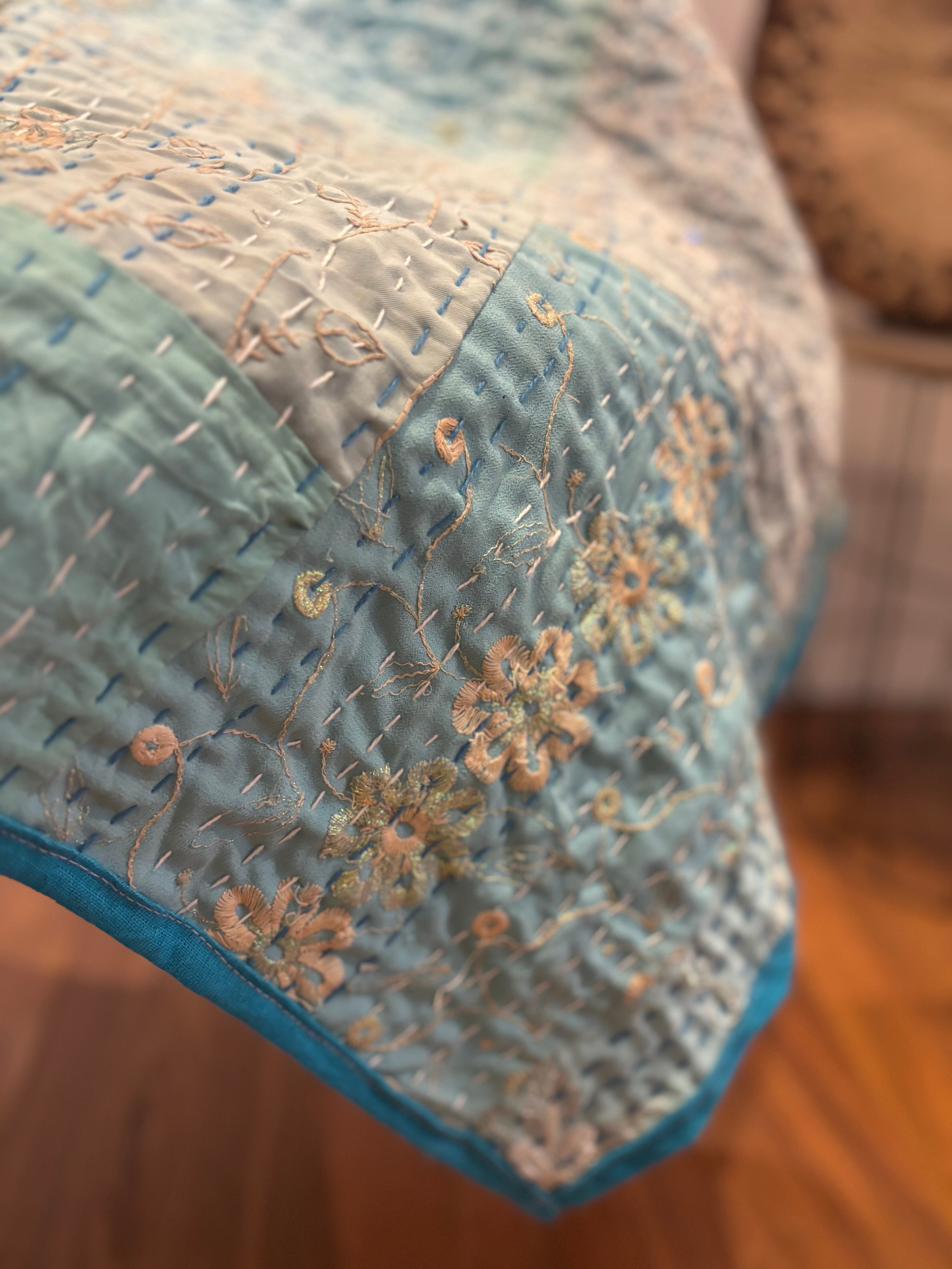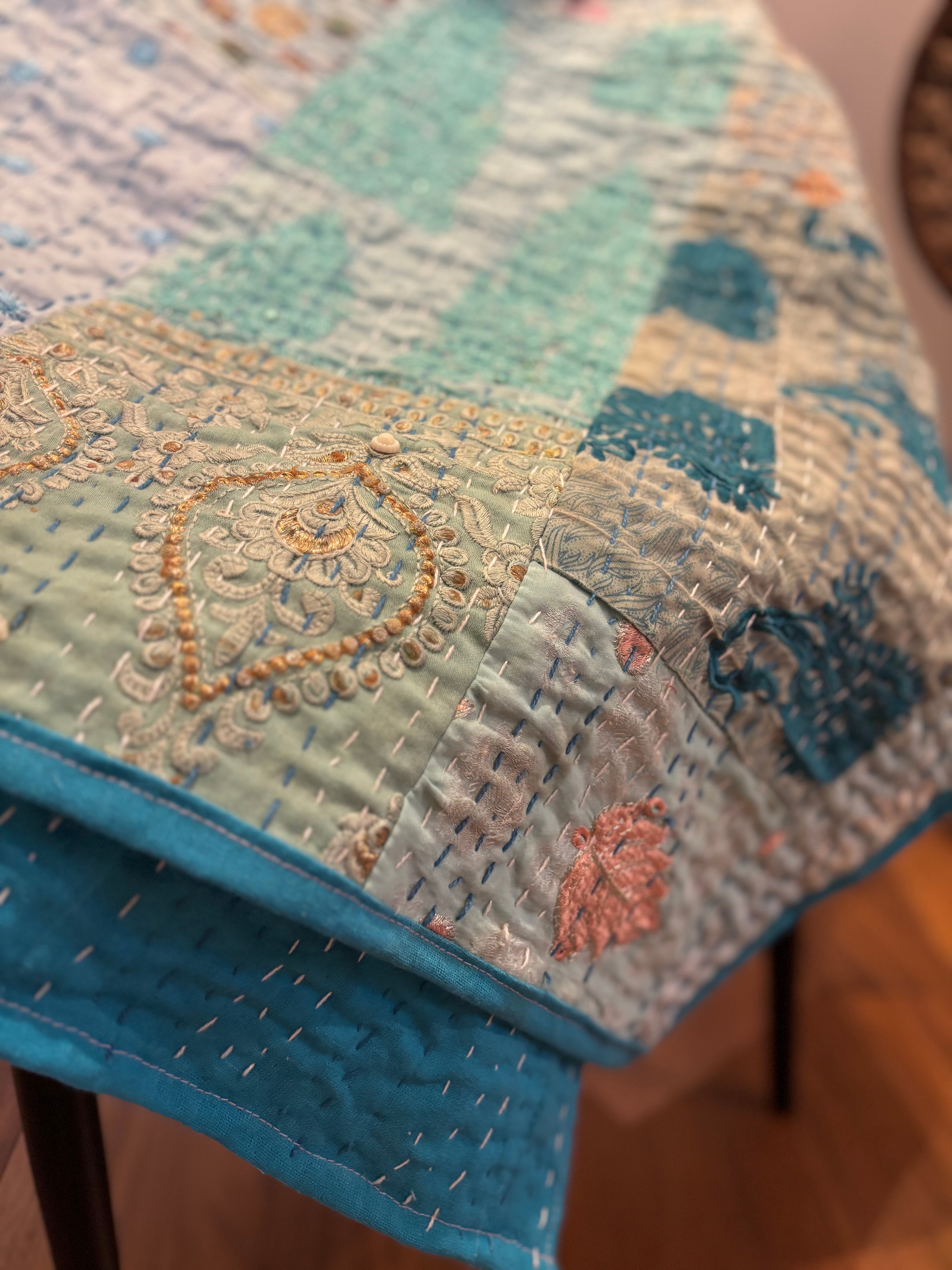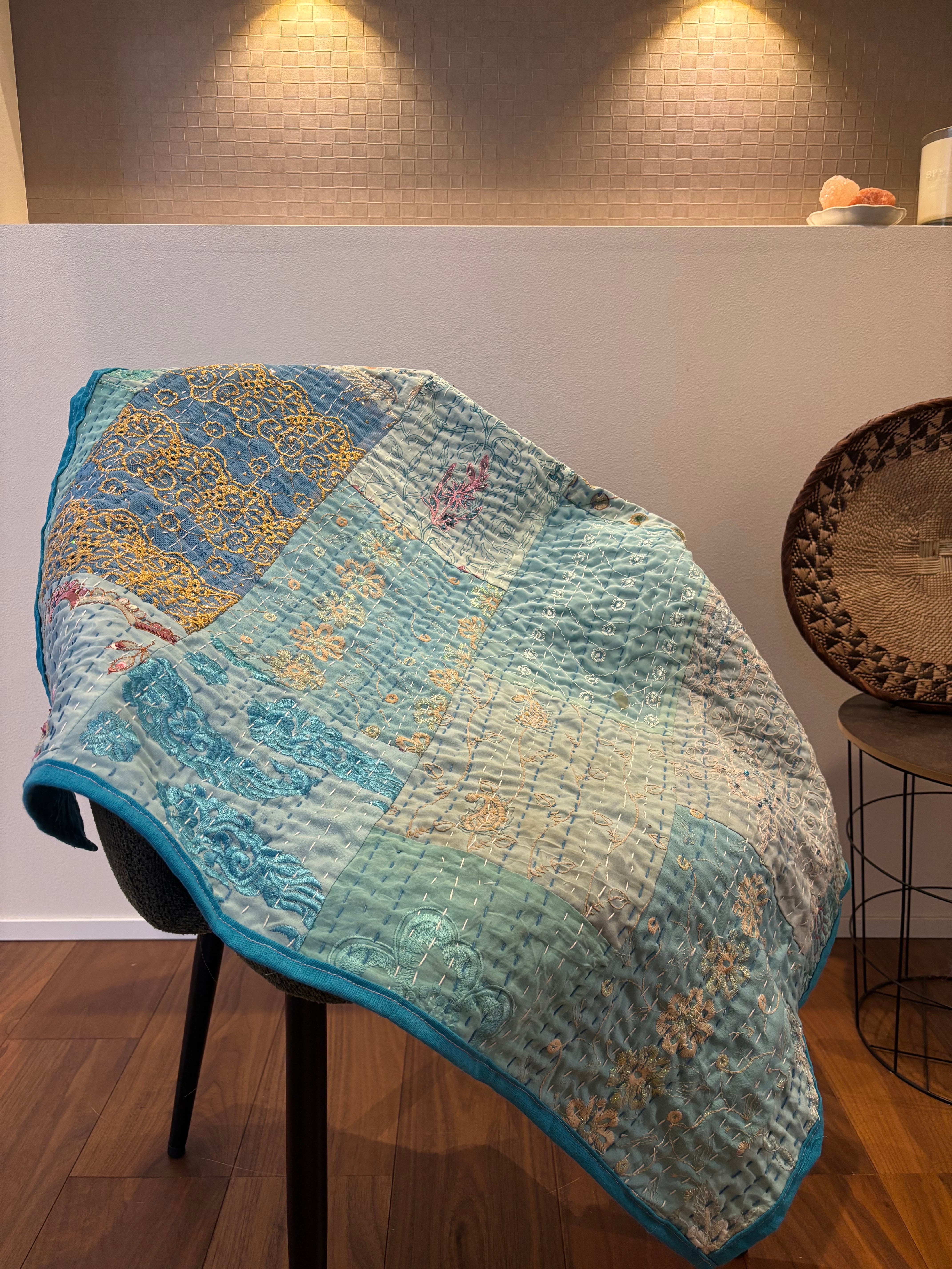 繋ぎ合わせたパッチワークキルトはとても華やか。
