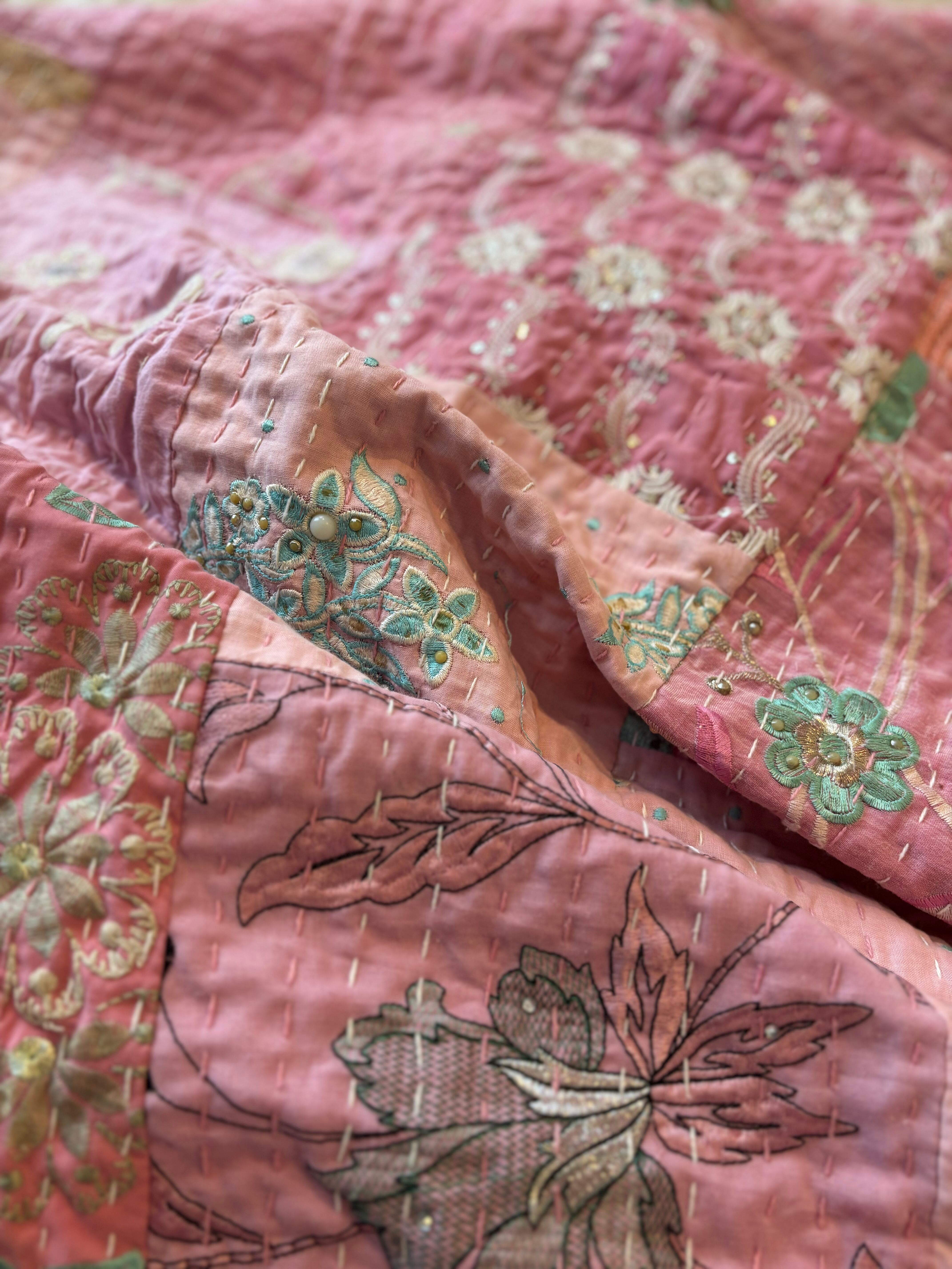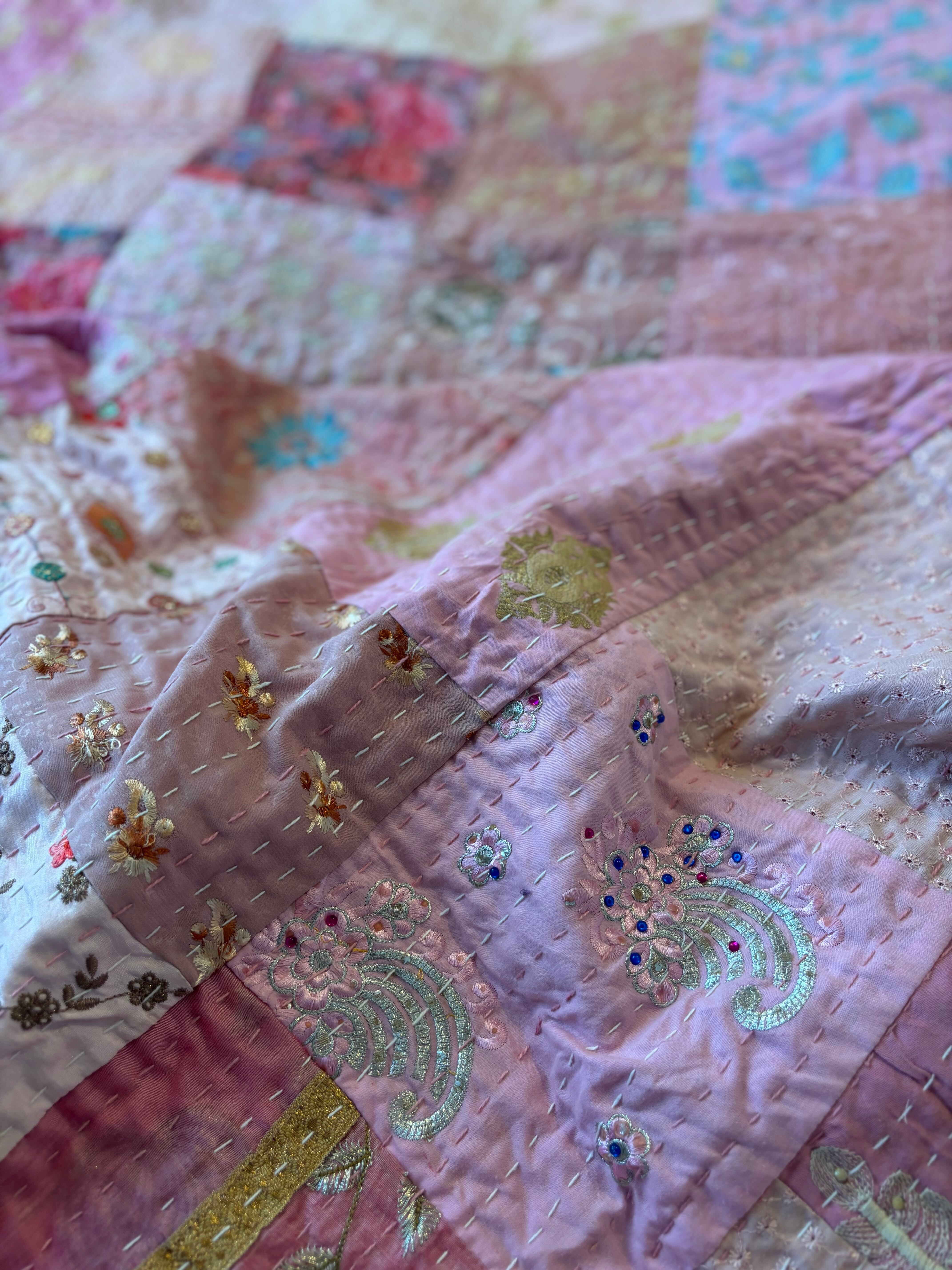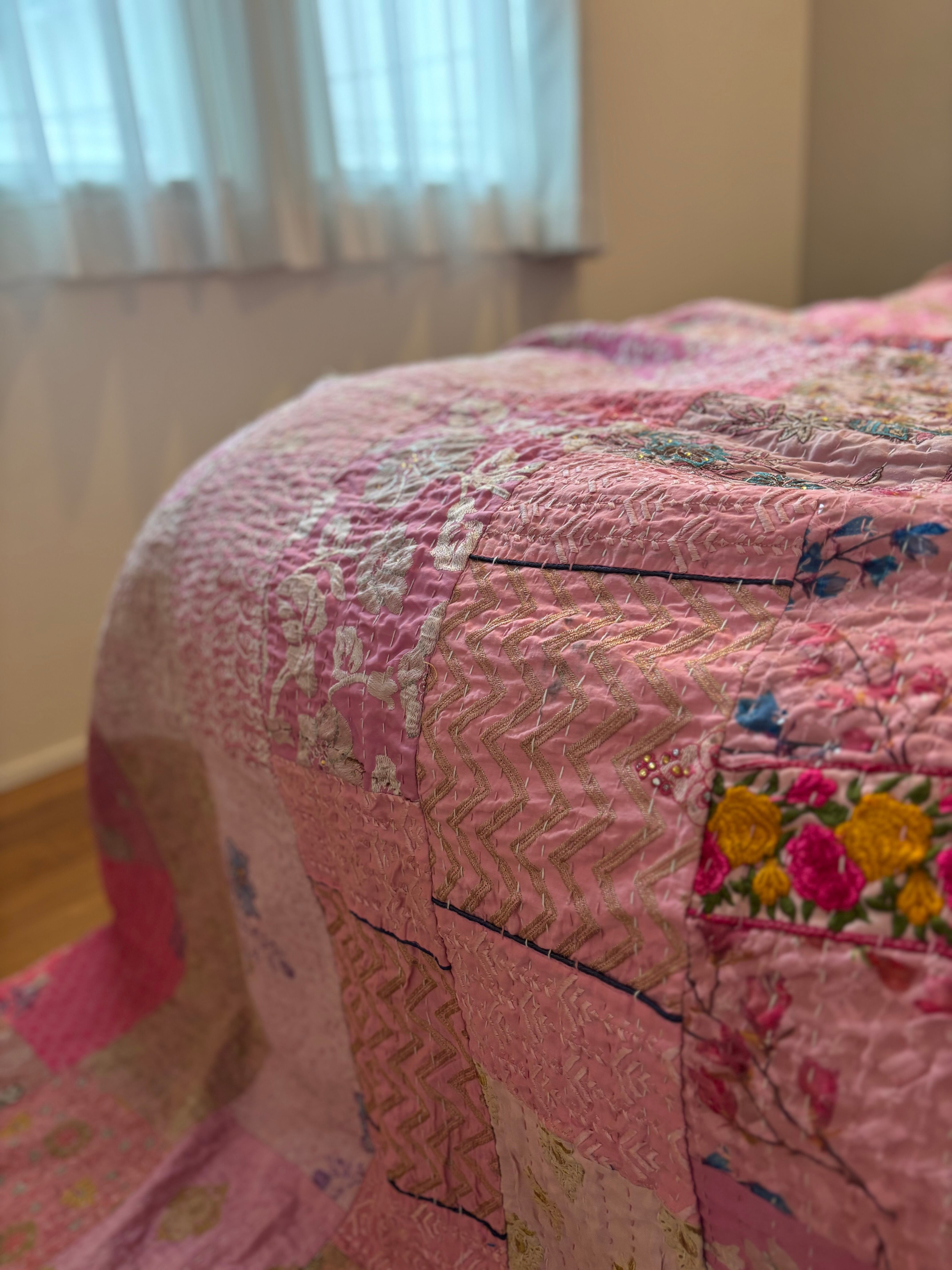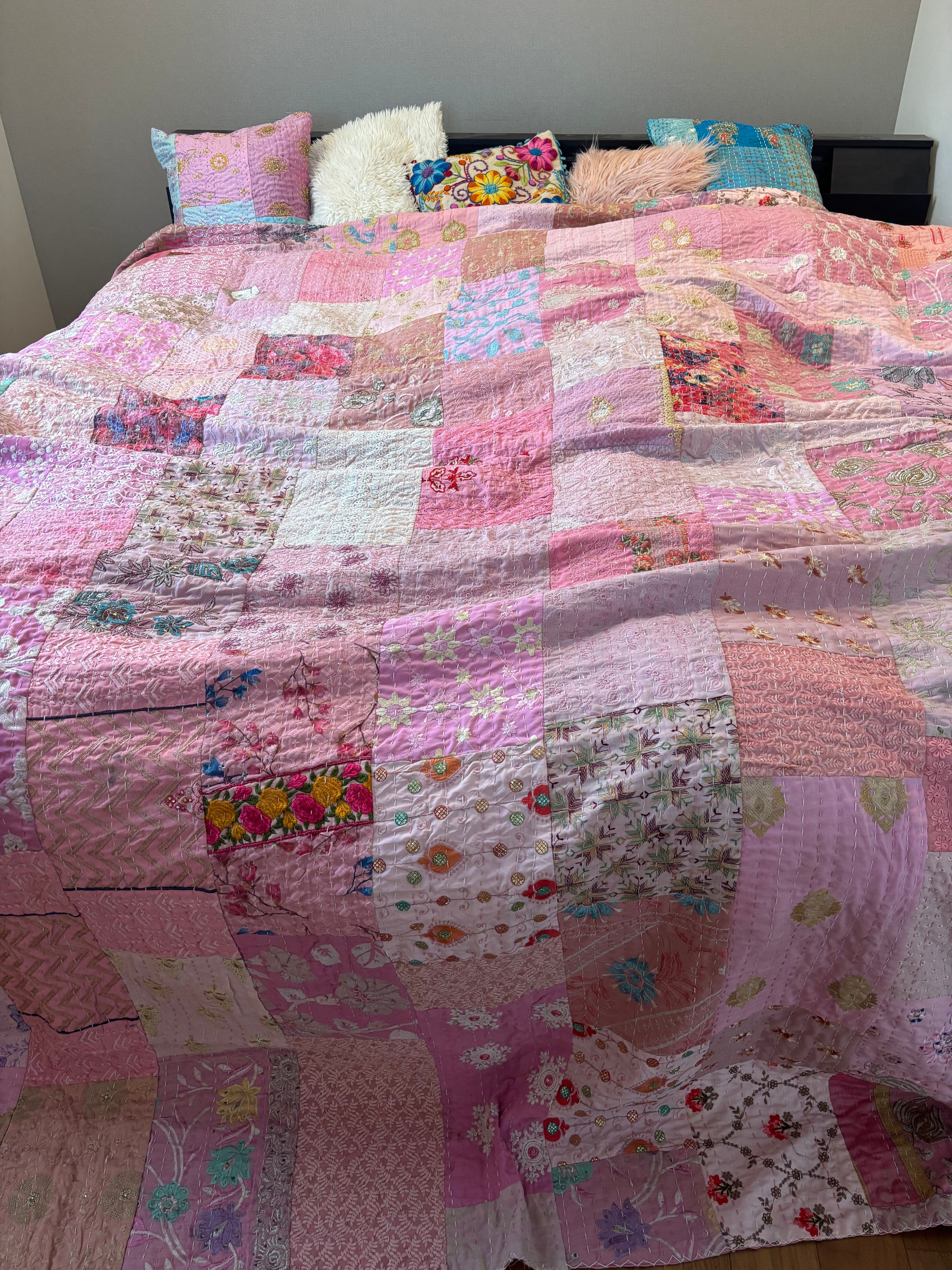 繋ぎ合わせたパッチワークキルトはとても華やか。