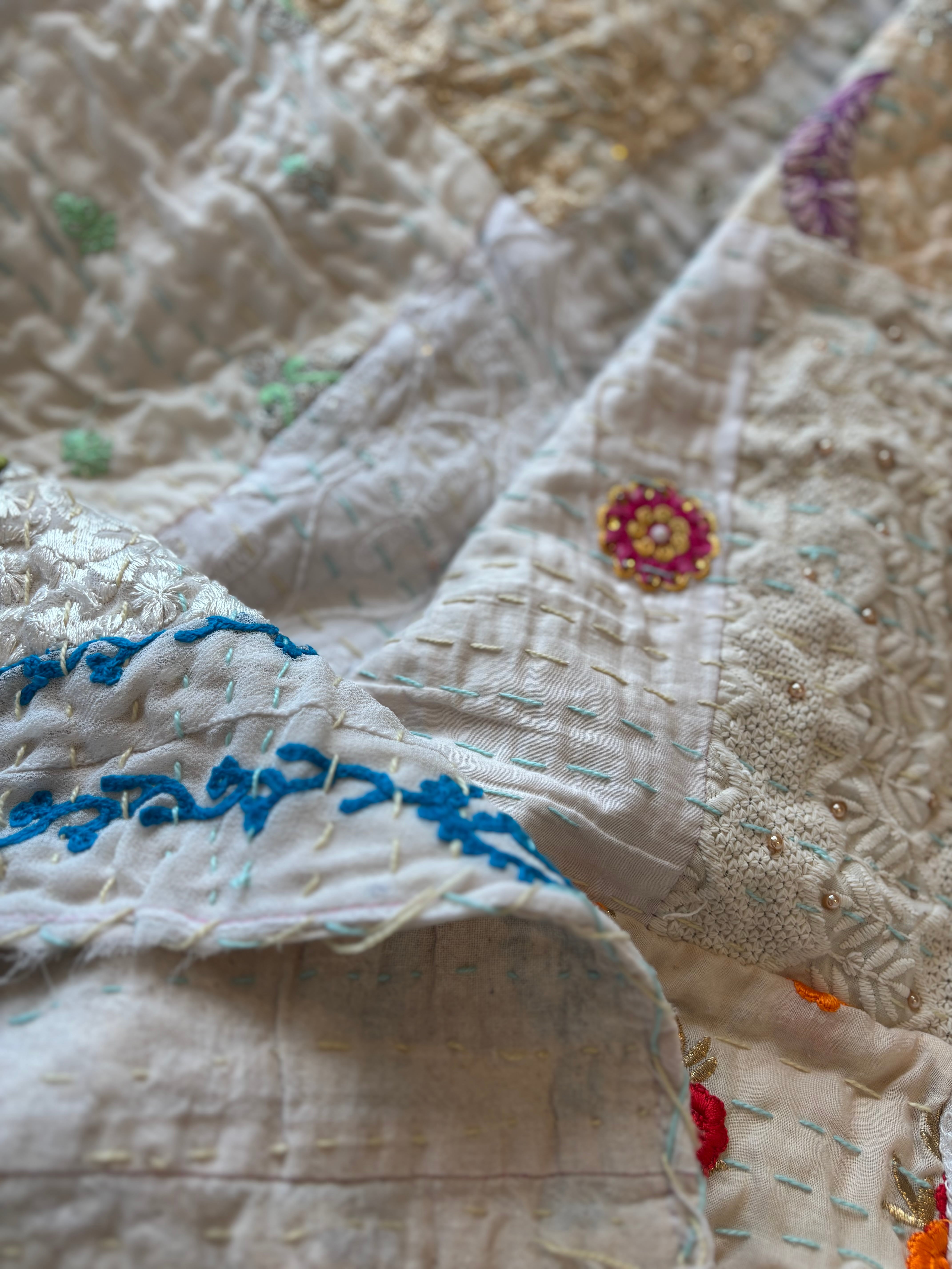 繋ぎ合わせたパッチワークキルトはとても華やか。