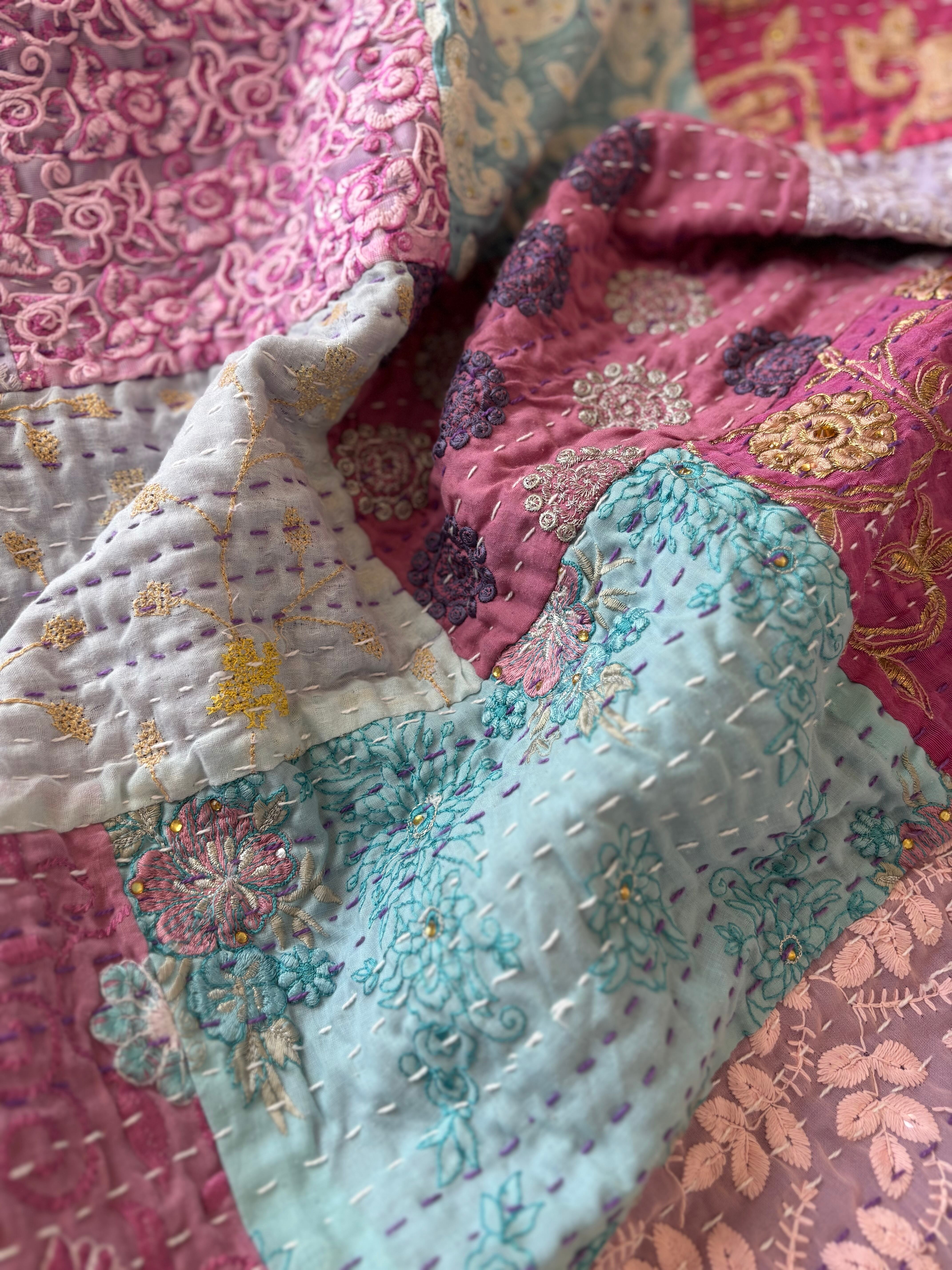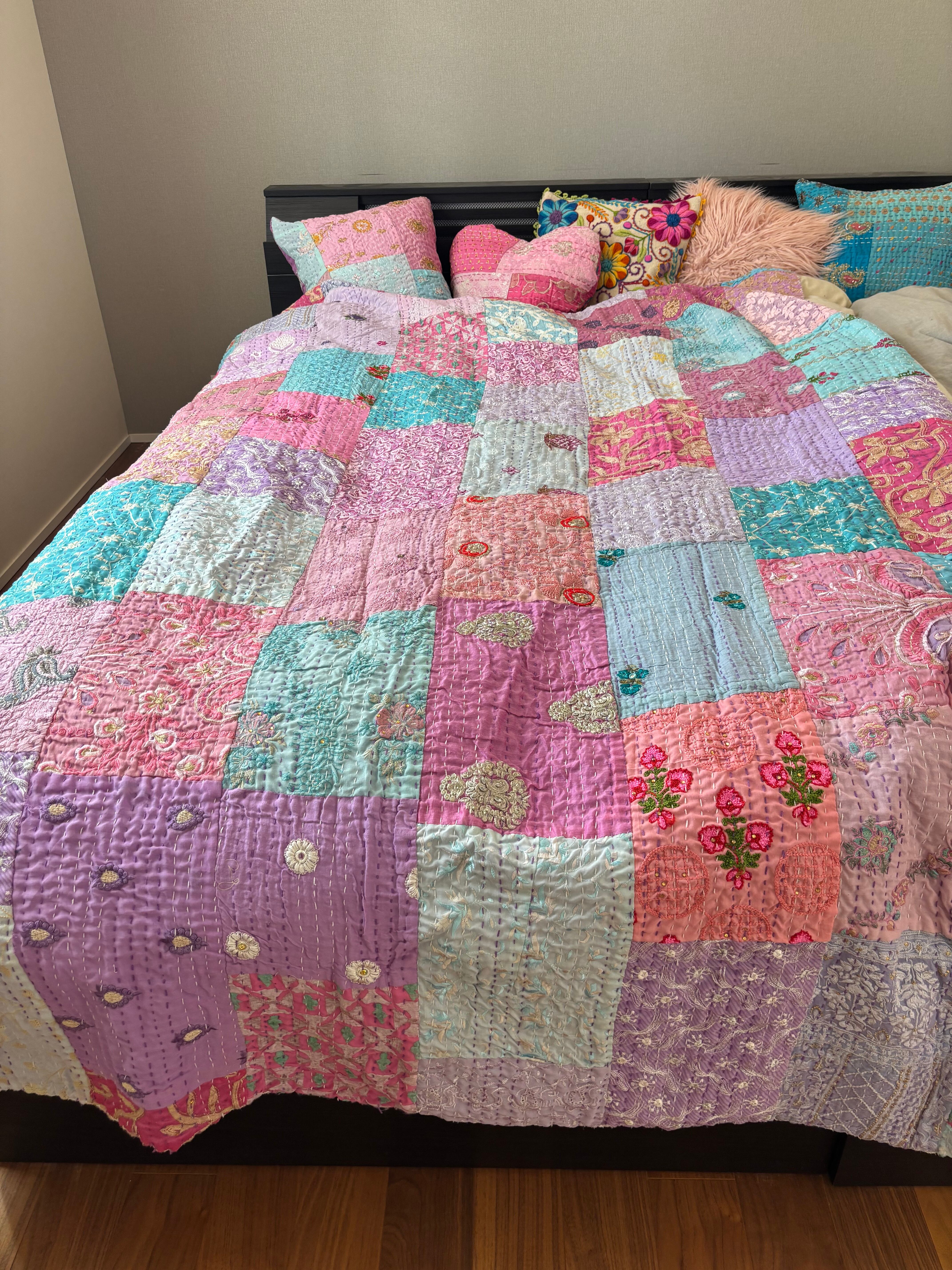 繋ぎ合わせたパッチワークキルトはとても華やか。
